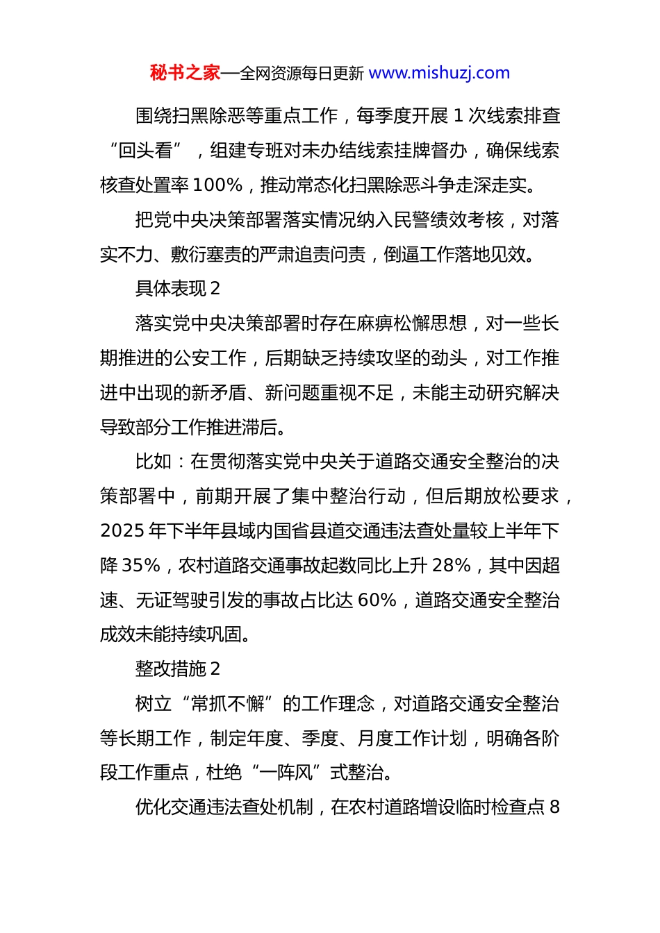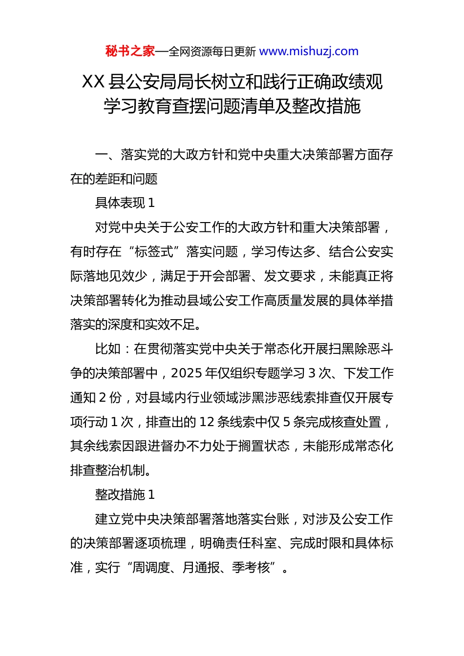 秘书之家—全网资源每日更新 www.mishuzj.comXX 县公安局局长树立和践行正确政绩观学习教育查摆问题清单及整改措施一、落实党的大政方针和党中央重大决策部署方面存在的差距和问题具体表现 1对党中央关于公安工作的大政方针和重大决策部署,有时存在“标签式”落实问题,学习传达多、结合公安实际落地见效少,满足于开会部署、发文要求,未能真正将决策部署转化为推动县域公安工作高质量发展的具体举措落实的深度和实效不足。比如:在贯彻落实党中央关于常态化开展扫黑除恶斗争的决策部署中,2025 年仅组织专题学习 3 次、下发工作通知 2 份,对县域内行业领域涉黑涉恶线索排查仅开展专项行动 1 次,排查出的 12 条线索中仅 5 条完成核查处置,其余线索因跟进督办不力处于搁置状态,未能形成常态化排查整治机制。整改措施 1建立党中央决策部署落地落实台账,对涉及公安工作的决策部署逐项梳理,明确责任科室、完成时限和具体标准,实行“周调度、月通报、季考核”。秘书之家—全网资源每日更新 www.mishuzj.com围绕扫黑除恶等重点工作,每季度开展 1 次线索排查“回头看”,组建专班对未办结线索挂牌督办,确保线索核查处置率 100%,推动常态化扫黑除恶斗争走深走实。把党中央决策部署落实情况纳入民警绩效考核,对落实不力、敷衍塞责的严肃追责问责,倒逼工作落地见效。具体表现 2落实党中央决策部署时存在麻痹松懈思想,对一些长期推进的公安工作,后期缺乏持续攻坚的劲头,对工作推进中出现的新矛盾、新问题重视不足,未能主动研究解决导致部分工作推进滞后。比如:在贯彻落实党中央关于道路交通安全整治的决策部署中,前期开展了集中整治行动,但后期放松要求,2025 年下半年县域内国省县道交通违法查处量较上半年下降 35%,农村道路交通事故起数同比上升 28%,其中因超速、无证驾驶引发的事故占比达 60%,道路交通安全整治成效未能持续巩固。整改措施 2树立“常抓不懈”的工作理念,对道路交通安全整治等长期工作,制定年度、季度、月度工作计划,明确各阶段工作重点,杜绝“一阵风”式整治。优化交通违法查处机制,在农村道路增设临时检查点 8秘书之家—全网资源每日更新 www.mishuzj.com个,运用电子监控、移动执法等手段,实现交通违法查处全覆盖,确保违法查处量稳步提升,交通事故起数同比下降。每月分析道路交通事故成因,针对突出问题开展专项整治,同时加强交通安全宣传,进村入户开展宣传活动,提升群众交通安全意识。二、落实习近平总书记重要讲话和重要指示批示精神方面存在的差距和问题具体表现 1对习近平总书记关于新时代公安工作的重要讲话和重要指示批示精神,学习领会不够深透,存在“学用脱节”问题,未能紧密结合 XX 县公安工作实际创造性落实,有时照搬照抄上级要求,缺乏针对性的工作举措。比如:在落实习近平总书记关于“坚持政治建警、改革强警、科技兴警、从严治警”的重要指示批示精神中,仅按上级要求开展了政治理论学习和纪律作风整顿,在科技兴警方面,县域公安信息化建设推进缓慢,2025 年计划上线的智慧警务平台因调研不充分、对接不到位,至今仍处于测试阶段,未能投入实战应用,科技赋能公安工作效果不明显。整改措施 1秘书之家—全网资源每日更新 www.mishuzj.com制定习近平总书记重要讲话和重要指示批示精神专题学习计划,每月开展 1 次集中学习研讨,结合公安工作实际谈体会、找差距、定措施,推动学习领会走深走实。成立智慧警务平台建设专班,由本人牵头,加强与科技公司、上级公安部门的对接,加快平台测试和优化进度确保 1 个月内投入实战应用,同时开展民警信息化技能培训,提升民警运用科技手段开展工作的能力。建立学用结合长效机制,将重要讲话和重要指示批示精神落实情况作为公安工作谋划的重要依据,确保各项工作始终沿着正确方向推进。具体表现 2贯彻落实习近平总书记重要指示批示精神时,存在“重表态、轻落实”的问题,对批示要求快速响应、高调表态,但在具体推进中缺乏钉钉子精神,跟踪问效不够,导致部分批示要求未能落地落实。比如:针对习近平总书记关于加强校园安全工作的重要指...