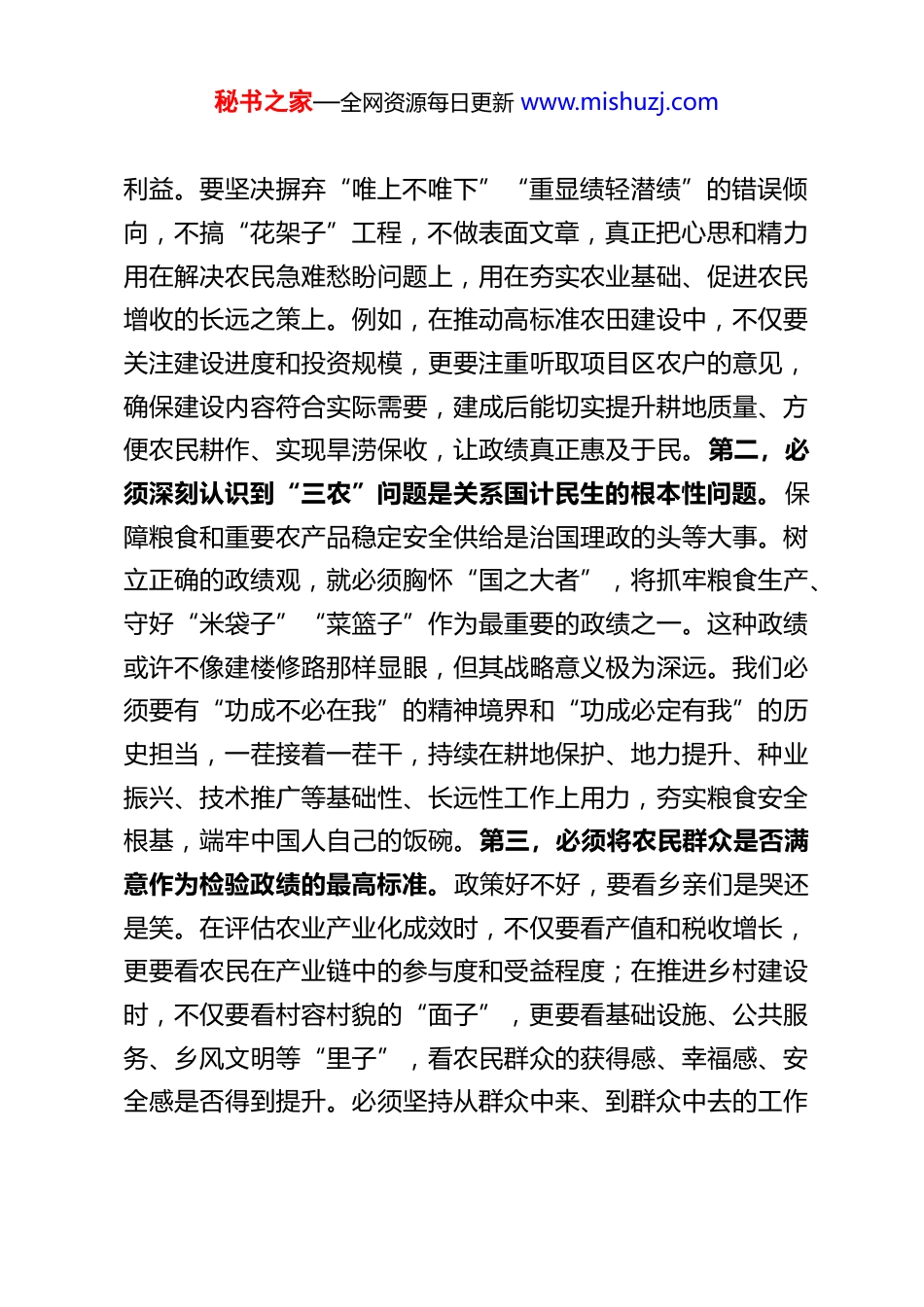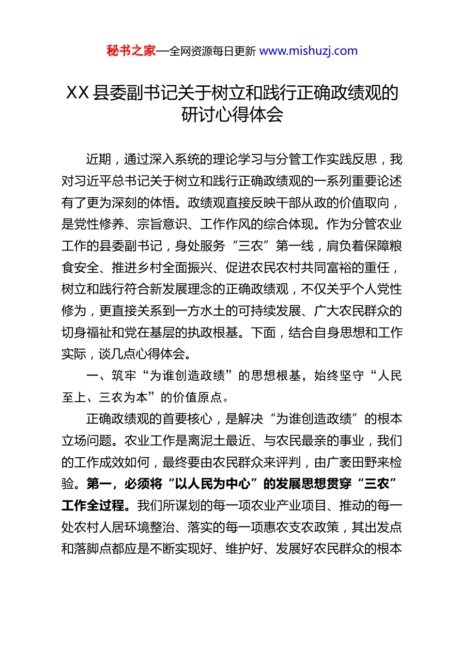 秘书之家—全网资源每日更新 www.mishuzj.comXX 县委副书记关于树立和践行正确政绩观的研讨心得体会近期,通过深入系统的理论学习与分管工作实践反思,我对习近平总书记关于树立和践行正确政绩观的一系列重要论述有了更为深刻的体悟。政绩观直接反映干部从政的价值取向,是党性修养、宗旨意识、工作作风的综合体现。作为分管农业工作的县委副书记,身处服务“三农”第一线,肩负着保障粮食安全、推进乡村全面振兴、促进农民农村共同富裕的重任,树立和践行符合新发展理念的正确政绩观,不仅关乎个人党性修为,更直接关系到一方水土的可持续发展、广大农民群众的切身福祉和党在基层的执政根基。下面,结合自身思想和工作实际,谈几点心得体会。一、筑牢“为谁创造政绩”的思想根基,始终坚守“人民至上、三农为本”的价值原点。正确政绩观的首要核心,是解决“为谁创造政绩”的根本立场问题。农业工作是离泥土最近、与农民最亲的事业,我们的工作成效如何,最终要由农民群众来评判,由广袤田野来检验。第一,必须将“以人民为中心”的发展思想贯穿“三农”工作全过程。我们所谋划的每一项农业产业项目、推动的每一处农村人居环境整治、落实的每一项惠农支农政策,其出发点和落脚点都应是不断实现好、维护好、发展好农民群众的根本秘书之家—全网资源每日更新 www.mishuzj.com利益。要坚决摒弃“唯上不唯下”“重显绩轻潜绩”的错误倾向,不搞“花架子”工程,不做表面文章,真正把心思和精力用在解决农民急难愁盼问题上,用在夯实农业基础、促进农民增收的长远之策上。例如,在推动高标准农田建设中,不仅要关注建设进度和投资规模,更要注重听取项目区农户的意见,确保建设内容符合实际需要,建成后能切实提升耕地质量、方便农民耕作、实现旱涝保收,让政绩真正惠及于民。第二,必须深刻认识到“三农”问题是关系国计民生的根本性问题。保障粮食和重要农产品稳定安全供给是治国理政的头等大事。树立正确的政绩观,就必须胸怀“国之大者”,将抓牢粮食生产、守好“米袋子”“菜篮子”作为最重要的政绩之一。这种政绩或许不像建楼修路那样显眼,但其战略意义极为深远。我们必须要有“功成不必在我”的精神境界和“功成必定有我”的历史担当,一茬接着一茬干,持续在耕地保护、地力提升、种业振兴、技术推广等基础性、长远性工作上用力,夯实粮食安全根基,端牢中国人自己的饭碗。第三,必须将农民群众是否满意作为检验政绩的最高标准。政策好不好,要看乡亲们是哭还是笑。在评估农业产业化成效时,不仅要看产值和税收增长,更要看农民在产业链中的参与度和受益程度;在推进乡村建设时,不仅要看村容村貌的“面子”,更要看基础设施、公共服务、乡风文明等“里子”,看农民群众的获得感、幸福感、安全感是否得到提升。必须坚持从群众中来、到群众中去的工作秘书之家—全网资源每日更新 www.mishuzj.com方法,使各项决策和工作部署符合农民愿望、得到农民支持。二、把准“创造什么样政绩”的实践导向,始终坚持“遵循规律、务实笃行”的科学态度。农业工作具有鲜明的季节性、地域性和生物性特征,周期长、见效慢,受自然和市场双重风险影响大。树立正确政绩观,必须深刻把握“三农”工作规律,追求实实在在、符合规律、利在长远的政绩。第一,追求尊重自然规律、实现绿色发展的生态政绩。农业的命脉在土、在肥、在水。要坚决反对以牺牲生态环境为代价换取短期经济增长的做法,绝不能以破坏耕地、透支地力、污染水源为代价来追求所谓的“高产”。要坚定不移走生态优先、绿色发展之路,积极推广节水灌溉、化肥农药减量增效、农业废弃物资源化利用等技术模式,大力发展生态循环农业,将农业打造成“绿水青山”的守护者和“金山银山”的创造者。保护好了乡村的生态基底,就是为子孙后代留下了最宝贵的财富,是为长远发展蓄积了最深厚的潜能。第二,追求尊重经济规律、实现高质高效的产业政绩。推动农业产业发展,必须遵循市场规律和产业发展规律,不能脱离实际、盲目追求“高大上”。要坚持因地制宜、分类指导,宜粮则粮、宜经则经、宜牧则牧、宜渔则渔。在培育特色优势产业时,要深入...