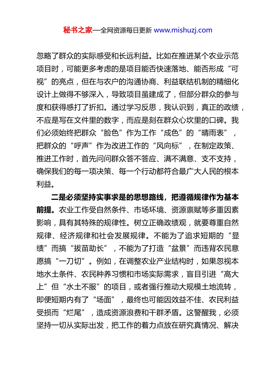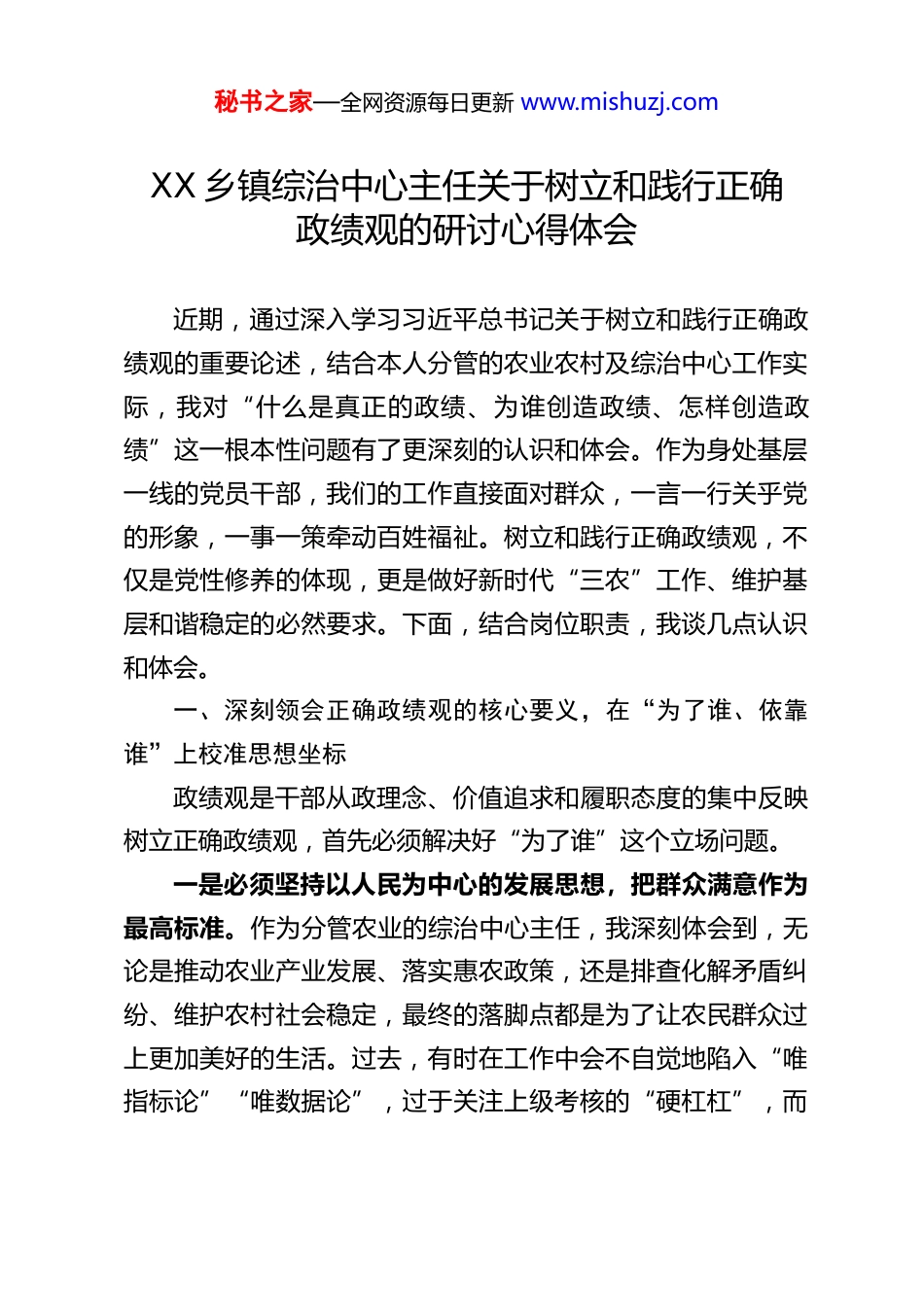 秘书之家—全网资源每日更新 www.mishuzj.comXX 乡镇综治中心主任关于树立和践行正确政绩观的研讨心得体会近期,通过深入学习习近平总书记关于树立和践行正确政绩观的重要论述,结合本人分管的农业农村及综治中心工作实际,我对“什么是真正的政绩、为谁创造政绩、怎样创造政绩”这一根本性问题有了更深刻的认识和体会。作为身处基层一线的党员干部,我们的工作直接面对群众,一言一行关乎党的形象,一事一策牵动百姓福祉。树立和践行正确政绩观,不仅是党性修养的体现,更是做好新时代“三农”工作、维护基层和谐稳定的必然要求。下面,结合岗位职责,我谈几点认识和体会。一、深刻领会正确政绩观的核心要义,在“为了谁、依靠谁”上校准思想坐标政绩观是干部从政理念、价值追求和履职态度的集中反映树立正确政绩观,首先必须解决好“为了谁”这个立场问题。一是必须坚持以人民为中心的发展思想,把群众满意作为最高标准。作为分管农业的综治中心主任,我深刻体会到,无论是推动农业产业发展、落实惠农政策,还是排查化解矛盾纠纷、维护农村社会稳定,最终的落脚点都是为了让农民群众过上更加美好的生活。过去,有时在工作中会不自觉地陷入“唯指标论”“唯数据论”,过于关注上级考核的“硬杠杠”,而秘书之家—全网资源每日更新 www.mishuzj.com忽略了群众的实际感受和长远利益。比如在推进某个农业示范项目时,可能更多考虑的是项目能否快速落地、能否形成“可视”的亮点,但在与农户的沟通协商、利益联结机制的精细化设计上做得不够深入,导致项目虽建成了,但部分群众的参与度和获得感打了折扣。通过学习反思,我认识到,真正的政绩,不应是写在文件里的数字,而应是刻在群众心坎里的口碑。我们必须始终把群众“脸色”作为工作“成色”的“晴雨表”,把群众的“呼声”作为改进工作的“风向标”,在制定政策、推进工作时,首先问问群众答不答应、满不满意、支不支持,确保我们的每一项决策、每一个行动都符合最广大人民的根本利益。二是必须坚持实事求是的思想路线,把遵循规律作为基本前提。农业工作受自然条件、市场环境、资源禀赋等多重因素影响,具有其特殊的规律性。树立正确政绩观,就要尊重自然规律、经济规律和社会发展规律。不能为了追求短期的“显绩”而搞“拔苗助长”,不能为了打造“盆景”而违背农民意愿搞“一刀切”。例如,在调整农业产业结构时,如果忽视本地水土条件、农民种养习惯和市场实际需求,盲目引进“高大上”但“水土不服”的项目,或者强行推动大规模土地流转,即便短期内有了“场面”,最终也可能因效益不佳、农民利益受损而“烂尾”,造成资源浪费和干群矛盾。这警醒我,必须坚持一切从实际出发,把工作的着力点放在研究真情况、解决秘书之家—全网资源每日更新 www.mishuzj.com真问题、追求真效果上。要多做打基础、利长远、惠民生的事,宁可少些“显山露水”的“形象工程”,也要多一些“润物无声”的“民心工程”,让每一项工作都经得起实践、人民和历史的检验。二、将正确政绩观融入分管工作,在“干什么、怎么干”上体现担当作为正确的政绩观,最终要落脚到具体的行动和成效上。作为分管农业工作的副书记,同时肩负综治维稳责任,我深感责任重大。必须将正确政绩观的要求,贯穿于农业农村工作的全过程、各方面,实现高质量发展与高水平安全的良性互动。一是聚焦粮食安全“国之大者”,在夯实农业基础上创造实绩。保障粮食和重要农产品稳定安全供给,是“三农”工作的头等大事,也是我们必须扛牢的政治责任。树立正确政绩观,就要把确保粮食安全作为最大的政绩之一。首先,要严守耕地红线。坚决遏制耕地“非农化”、防止“非粮化”,将耕地保护责任落实到具体地块、具体人头,确保“良田”回归“粮田”。这不仅关系到眼前的生产,更关系到子孙后代的饭碗,是潜绩,更是大绩。其次,要提升农业综合生产能力。持续加大高标准农田建设投入,改善农田水利基础设施,积极推广良种良法良技,提高农业科技贡献率。这需要我们不贪一时之功,甘于做铺垫性的工作,一步一个脚印地提升耕地质量和产出水平。再次,要健全农民种粮收益保障机制。落实...
