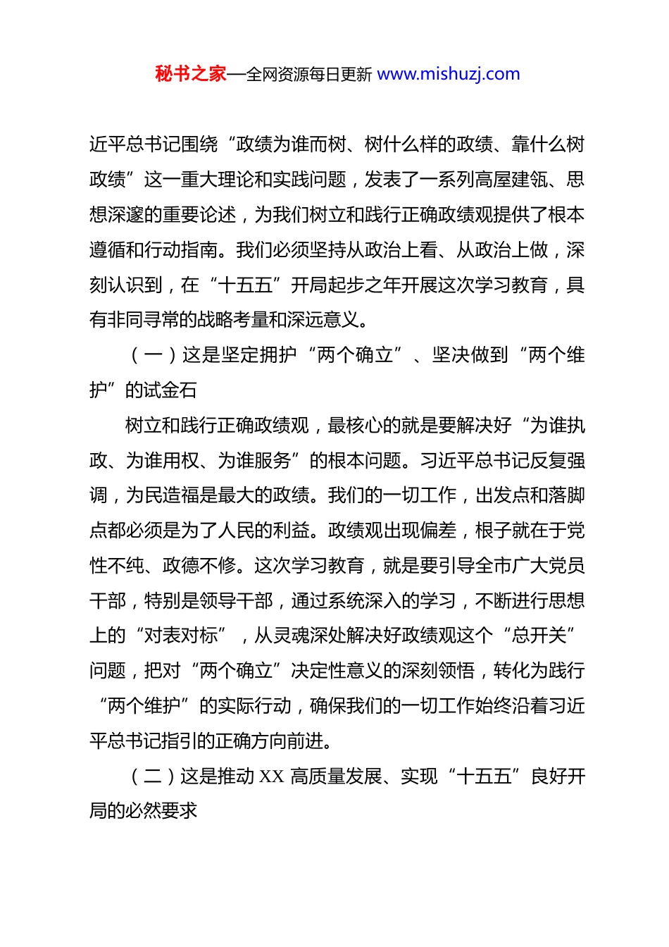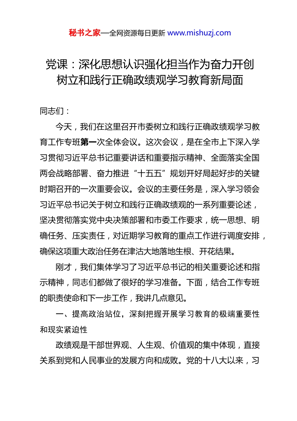 秘书之家—全网资源每日更新 www.mishuzj.com党课:深化思想认识强化担当作为奋力开创树立和践行正确政绩观学习教育新局面 同志们:今天,我们在这里召开市委树立和践行正确政绩观学习教育工作专班第一次全体会议。这次会议,是在全市上下深入学习贯彻习近平总书记重要讲话和重要指示精神、全面落实全国两会战略部署、奋力推进“十五五”规划开好局起好步的关键时期召开的一次重要会议。会议的主要任务是,深入学习领会习近平总书记关于树立和践行正确政绩观的一系列重要论述,坚决贯彻落实党中央决策部署和市委工作要求,统一思想、明确任务、压实责任,对近期学习教育的重点工作进行调度安排,确保这项重大政治任务在津沽大地落地生根、开花结果。刚才,我们集体学习了习近平总书记的相关重要论述和指示精神,同志们都做了很好的学习准备。下面,结合工作专班的职责使命和下一步工作,我讲几点意见。一、提高政治站位,深刻把握开展学习教育的极端重要性和现实紧迫性政绩观是干部世界观、人生观、价值观的集中体现,直接关系到党和人民事业的发展方向和成败。党的十八大以来,习秘书之家—全网资源每日更新 www.mishuzj.com近平总书记围绕“政绩为谁而树、树什么样的政绩、靠什么树政绩”这一重大理论和实践问题,发表了一系列高屋建瓴、思想深邃的重要论述,为我们树立和践行正确政绩观提供了根本遵循和行动指南。我们必须坚持从政治上看、从政治上做,深刻认识到,在“十五五”开局起步之年开展这次学习教育,具有非同寻常的战略考量和深远意义。(一)这是坚定拥护“两个确立”、坚决做到“两个维护”的试金石树立和践行正确政绩观,最核心的就是要解决好“为谁执政、为谁用权、为谁服务”的根本问题。习近平总书记反复强调,为民造福是最大的政绩。我们的一切工作,出发点和落脚点都必须是为了人民的利益。政绩观出现偏差,根子就在于党性不纯、政德不修。这次学习教育,就是要引导全市广大党员干部,特别是领导干部,通过系统深入的学习,不断进行思想上的“对表对标”,从灵魂深处解决好政绩观这个“总开关”问题,把对“两个确立”决定性意义的深刻领悟,转化为践行“两个维护”的实际行动,确保我们的一切工作始终沿着习近平总书记指引的正确方向前进。(二)这是推动 XX 高质量发展、实现“十五五”良好开局的必然要求秘书之家—全网资源每日更新 www.mishuzj.com当前,我们正处在推动高质量发展的关键时期,2026 年作为“十五五”规划的开局之年,各项任务艰巨繁重。发展越是到紧要关头,越需要我们保持清醒的头脑,坚持正确的政绩观。我们要清醒地看到,一些地方和干部中仍然存在急功近利、好大喜功、重显绩轻潜绩、重当前轻长远等错误政绩观的现象。这些问题如果不能得到有效解决,不仅会贻误发展时机,甚至会给 XX 的长远发展埋下隐患。通过这次学习教育,就是要引导全市上下,完整、准确、全面贯彻新发展理念,坚持把高质量发展作为政绩观的重要内容,多做打基础、利长远、惠民生的实事,坚决不搞“形象工程”“政绩工程”,以经得起实践、人民和历史检验的扎实业绩,为“十五五”时期 XX 的发展奠定坚实基础。(三)这是纵深推进全面从严治党、营造风清气正政治生态的重要抓手政绩观的偏差,本质上是权力观、事业观的扭曲,是形式主义、官僚主义的温床。一个时期以来,我们坚决贯彻党中央决策部署,持续净化政治生态,取得了显著成效。但也要看到,作风建设永远在路上。这次学习教育,就是要把树立和践行正确政绩观,作为加强党性锻炼、提升干部队伍履职能力作风的重要契机。我们要通过深入地学、认真地查、彻底地改,引导秘书之家—全网资源每日更新 www.mishuzj.com广大干部自觉反对特权思想和特权行为,大兴务实之风,弘扬清廉之风,养成俭朴之风,推动全市政治生态实现根本性、持久性的向好。二、聚焦核心任务,全面落实学习教育的各项部署要求党中央部署和市委要求,明确了这次学习教育的总体框架和重点任务。我们工作专班的核心职责,就是要把这些要求具体化、精准化,确保各项工作不折不扣落到实处。要牢牢把握“立党为公、为民造福、科学决策...