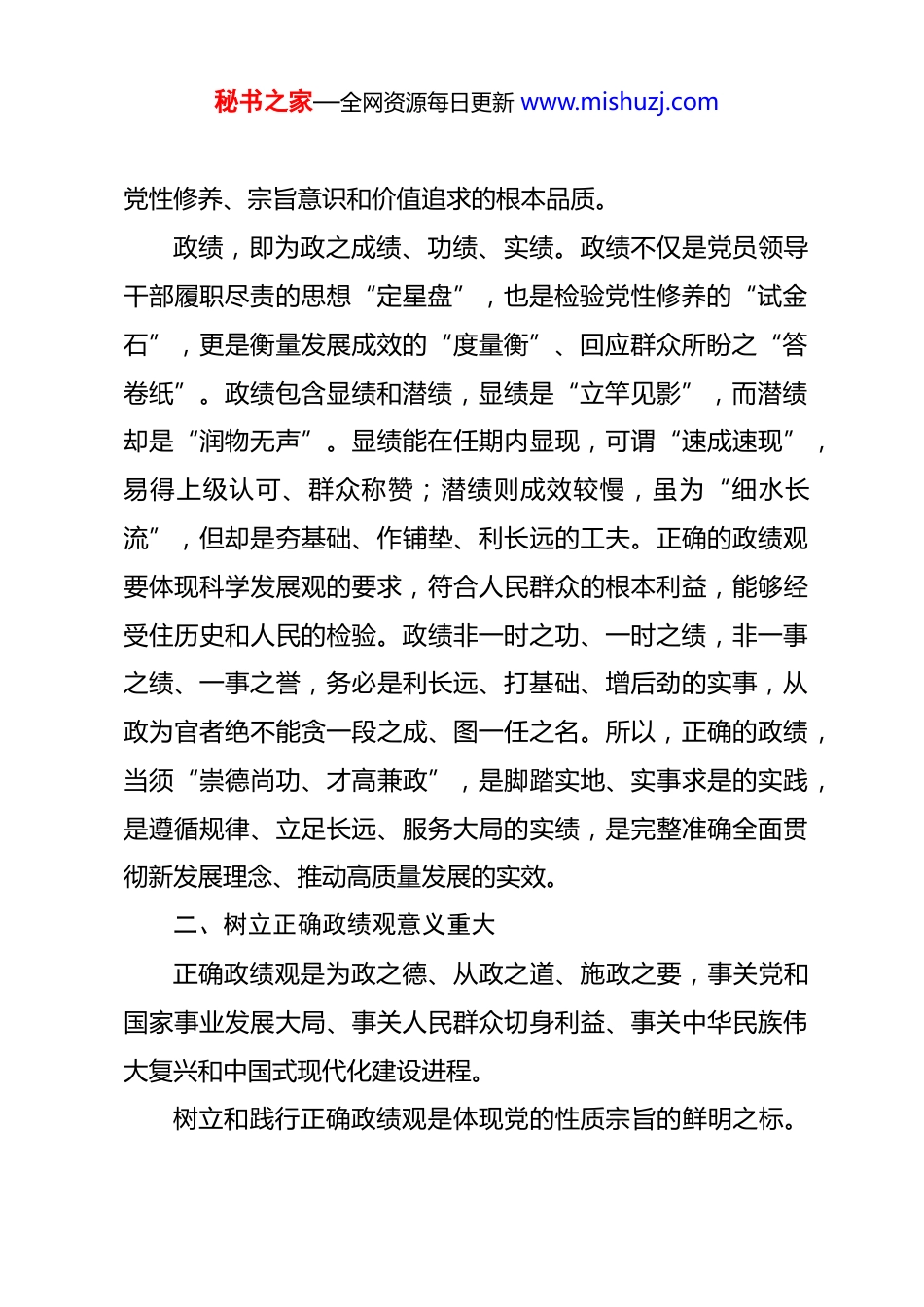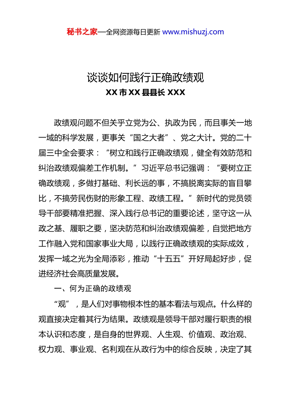 秘书之家—全网资源每日更新 www.mishuzj.com谈谈如何践行正确政绩观XX 市 XX 县县长 XXX政绩观问题不但关乎立党为公、执政为民,而且事关一地一域的科学发展,更事关“国之大者”、党之大计。党的二十届三中全会要求:“树立和践行正确政绩观,健全有效防范和纠治政绩观偏差工作机制。”习近平总书记强调:“要树立正确政绩观,多做打基础、利长远的事,不搞脱离实际的盲目攀比,不搞劳民伤财的形象工程、政绩工程。”新时代的党员领导干部要精准把握、深入践行总书记的重要论述,坚守这一从政之基、履职之要,坚决防范和纠治政绩观偏差,自觉把地方工作融入党和国家事业大局,以践行正确政绩观的实际成效,发挥一域之光为全局添彩,推动“十五五”开好局起好步,促进经济社会高质量发展。一、何为正确的政绩观“观”,是人们对事物根本性的基本看法与观点。什么样的观直接决定着其行为结果。政绩观是领导干部对履行职责的根本认识和态度,是自身的世界观、人生观、价值观、政治观、权力观、事业观、名利观在从政行为中的综合反映,决定了其秘书之家—全网资源每日更新 www.mishuzj.com党性修养、宗旨意识和价值追求的根本品质。政绩,即为政之成绩、功绩、实绩。政绩不仅是党员领导干部履职尽责的思想“定星盘”,也是检验党性修养的“试金石”,更是衡量发展成效的“度量衡”、回应群众所盼之“答卷纸”。政绩包含显绩和潜绩,显绩是“立竿见影”,而潜绩却是“润物无声”。显绩能在任期内显现,可谓“速成速现”,易得上级认可、群众称赞;潜绩则成效较慢,虽为“细水长流”,但却是夯基础、作铺垫、利长远的工夫。正确的政绩观要体现科学发展观的要求,符合人民群众的根本利益,能够经受住历史和人民的检验。政绩非一时之功、一时之绩,非一事之绩、一事之誉,务必是利长远、打基础、增后劲的实事,从政为官者绝不能贪一段之成、图一任之名。所以,正确的政绩,当须“崇德尚功、才高兼政”,是脚踏实地、实事求是的实践,是遵循规律、立足长远、服务大局的实绩,是完整准确全面贯彻新发展理念、推动高质量发展的实效。二、树立正确政绩观意义重大正确政绩观是为政之德、从政之道、施政之要,事关党和国家事业发展大局、事关人民群众切身利益、事关中华民族伟大复兴和中国式现代化建设进程。树立和践行正确政绩观是体现党的性质宗旨的鲜明之标。秘书之家—全网资源每日更新 www.mishuzj.com党章明确规定,党的各级领导干部要“树立正确政绩观,做出经得起实践、人民、历史检验的实绩”。我们党始终坚持和践行全心全意为人民服务的根本宗旨,始终保持同人民群众的血肉联系,付出的一切努力和牺牲,都是为中国人民谋幸福、为中华民族谋复兴。新时代要求我们不忘初心、牢记使命,始终把人民对美好生活的向往作为奋斗目标,一切以人民为中心,时刻把人民群众“高兴不高兴”“答应不答应”“满意不满意”作为执政的最高标准,我们的从政为官者务必把人民群众视为衣食父母,厚植“衙斋卧听萧萧竹,疑是民间疾苦声”的爱民情怀,时刻增强在党言党、在党忧党、在党护党和感恩人民、敬畏人民、造福人民的担当意识,牢牢坚持发展为了人民,推动发展成果由人民共享的执政理念,创新作为为民谋福祉,持续提升人民群众的获得感、幸福感,创造出经得起实践和历史检验、人民群众满意的实绩。树立和践行正确政绩观是党员干部党性修养标准的检验之尺。党性是指政党固有的特性、本质属性,是党员领导干部立身处世、立业立德的重要基石,党性修养、政治立场和格局境界成为其政绩观的综合体现,一言以蔽之,党性就是党员领导干部的做人原则和政治立场问题。党性坚强、摒弃私心杂念,其政绩观才会始终端正;党性不强、私心杂念作祟,政绩观必秘书之家—全网资源每日更新 www.mishuzj.com定出现偏差。对党绝对忠诚、体恤民众疾苦是党员干部最基本的为官品德、从政修养,树立和践行正确政绩观,起决定性作用的便是党性,这也是决定着党员干部思想品行、宗旨观念、从政目的的重要因素。党性纯则作风正,作风正则事业兴,只有党性坚强、立场坚定、忠诚坚贞和摒弃私心杂念,才能确保政绩观不出偏...