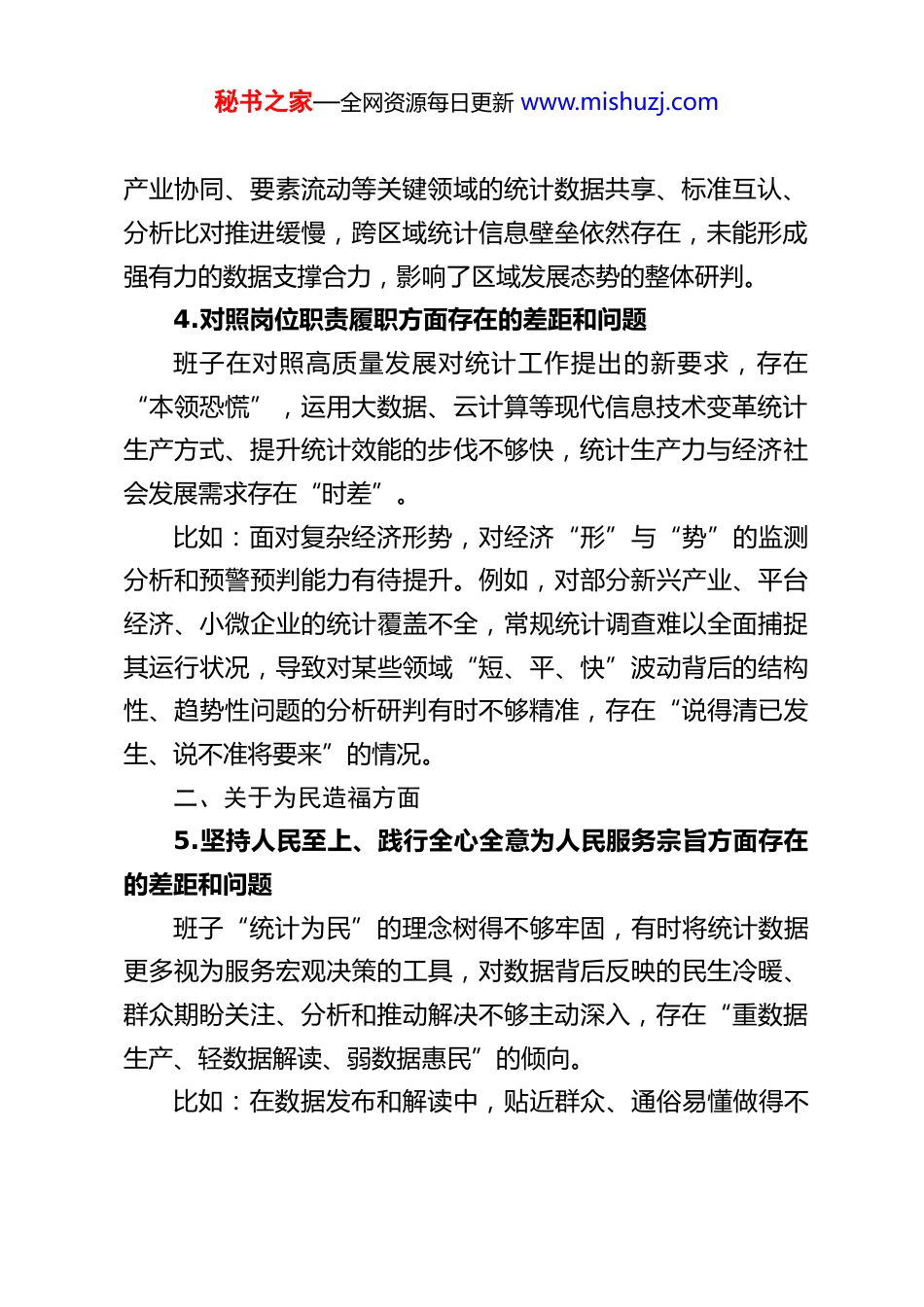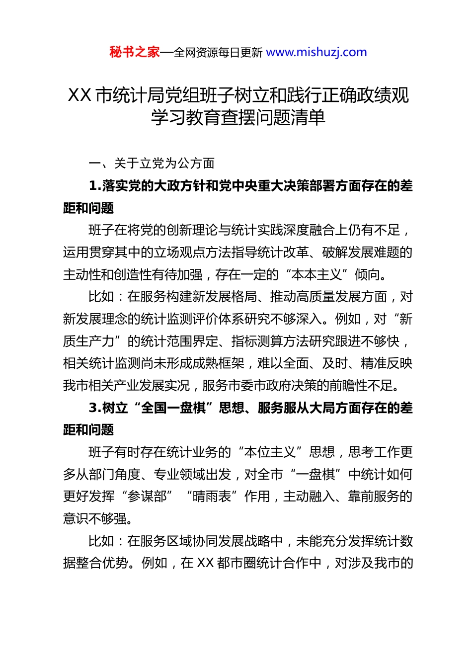 秘书之家—全网资源每日更新 www.mishuzj.comXX 市统计局党组班子树立和践行正确政绩观学习教育查摆问题清单一、关于立党为公方面1.落实党的大政方针和党中央重大决策部署方面存在的差距和问题班子在将党的创新理论与统计实践深度融合上仍有不足,运用贯穿其中的立场观点方法指导统计改革、破解发展难题的主动性和创造性有待加强,存在一定的“本本主义”倾向。比如:在服务构建新发展格局、推动高质量发展方面,对新发展理念的统计监测评价体系研究不够深入。例如,对“新质生产力”的统计范围界定、指标测算方法研究跟进不够快,相关统计监测尚未形成成熟框架,难以全面、及时、精准反映我市相关产业发展实况,服务市委市政府决策的前瞻性不足。3.树立“全国一盘棋”思想、服务服从大局方面存在的差距和问题班子有时存在统计业务的“本位主义”思想,思考工作更多从部门角度、专业领域出发,对全市“一盘棋”中统计如何更好发挥“参谋部”“晴雨表”作用,主动融入、靠前服务的意识不够强。比如:在服务区域协同发展战略中,未能充分发挥统计数据整合优势。例如,在 XX 都市圈统计合作中,对涉及我市的秘书之家—全网资源每日更新 www.mishuzj.com产业协同、要素流动等关键领域的统计数据共享、标准互认、分析比对推进缓慢,跨区域统计信息壁垒依然存在,未能形成强有力的数据支撑合力,影响了区域发展态势的整体研判。4.对照岗位职责履职方面存在的差距和问题班子在对照高质量发展对统计工作提出的新要求,存在“本领恐慌”,运用大数据、云计算等现代信息技术变革统计生产方式、提升统计效能的步伐不够快,统计生产力与经济社会发展需求存在“时差”。比如:面对复杂经济形势,对经济“形”与“势”的监测分析和预警预判能力有待提升。例如,对部分新兴产业、平台经济、小微企业的统计覆盖不全,常规统计调查难以全面捕捉其运行状况,导致对某些领域“短、平、快”波动背后的结构性、趋势性问题的分析研判有时不够精准,存在“说得清已发生、说不准将要来”的情况。二、关于为民造福方面5.坚持人民至上、践行全心全意为人民服务宗旨方面存在的差距和问题班子“统计为民”的理念树得不够牢固,有时将统计数据更多视为服务宏观决策的工具,对数据背后反映的民生冷暖、群众期盼关注、分析和推动解决不够主动深入,存在“重数据生产、轻数据解读、弱数据惠民”的倾向。比如:在数据发布和解读中,贴近群众、通俗易懂做得不秘书之家—全网资源每日更新 www.mishuzj.com够。例如,发布的居民收支、CPI 等民生数据,官方解读多使用专业术语,缺乏生动鲜活的图表、案例和对比分析,群众“看不懂、用不上”的问题依然存在,统计工作的社会感知度和获得感有待提高。6.深入基层、联系服务群众方面存在的差距和问题班子深入统计调查一线、直面调查对象和基层统计人员不够经常,调研存在“走马观花”现象,对基层统计工作的真实情况、面临的困难挑战掌握不够全面精准,存在一定的“机关化”倾向。比如:深入企业开展数据质量核查和调研时,有时过于关注报表数字本身,与企业负责人、统计员深入交流经营状况、面临的痛点难点不够。例如,在 XX 工业园区进行“四上”企业数据核查时,更多时间用于核对报表逻辑,倾听企业关于成本上升、订单波动、预期偏弱等具体情况的“活情况”时间不足,导致调研深度不够,提出的对策建议针对性不强。7.推动解决民生、信访、群众急难愁盼问题方面存在的差距和不足班子对通过统计数据反映的共性民生问题,主动向市委市政府和相关部门预警、建议的意识和力度有待加强,发挥统计“信号灯”作用,推动问题从源头解决的机制不够顺畅。比如:对群众通过 12340 社情民意调查等渠道反映集中的问题,分析转化运用不足。例如,上一季度民调显示“社区养秘书之家—全网资源每日更新 www.mishuzj.com老服务供给”满意度连续偏低,但统计分析报告仅停留在数据描述层面,未能深入剖析供给结构性短板(如助餐、医养结合等服务缺口),也未主动会同民政等部门开展专题调研、提出补短板的具体量化建议,推动问题解决的“后半篇文章”做得不实。三、关于科学决策方...