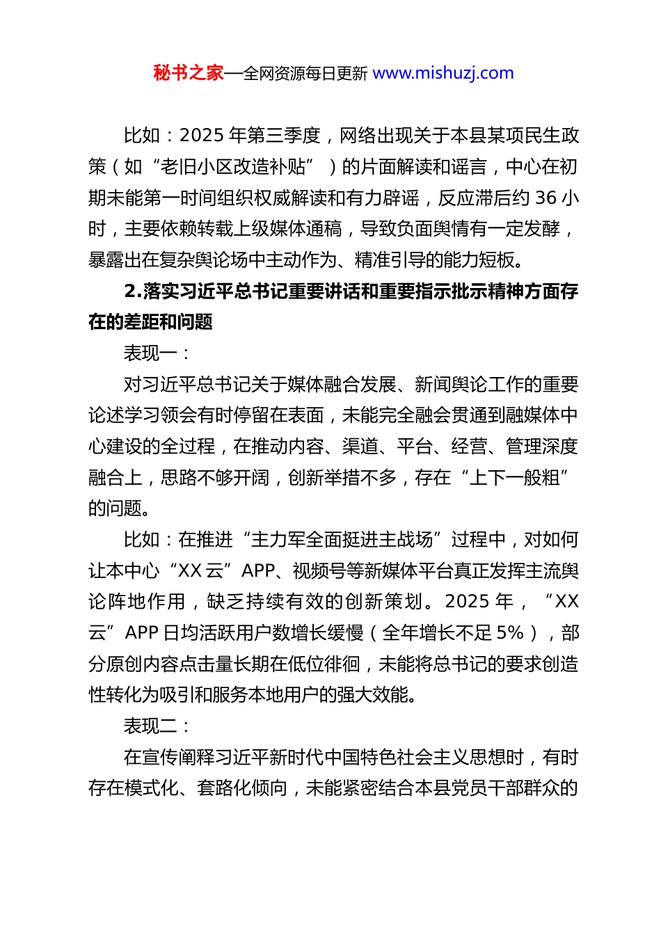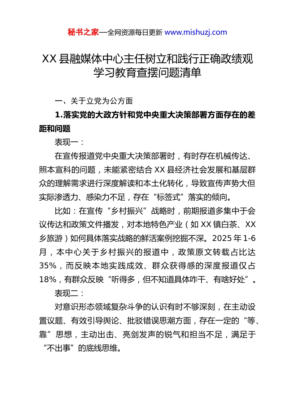 秘书之家—全网资源每日更新 www.mishuzj.comXX 县融媒体中心主任树立和践行正确政绩观学习教育查摆问题清单一、关于立党为公方面1.落实党的大政方针和党中央重大决策部署方面存在的差距和问题表现一:在宣传报道党中央重大决策部署时,有时存在机械传达、照本宣科的问题,未能紧密结合 XX 县经济社会发展和基层群众的理解需求进行深度解读和本土化转化,导致宣传声势大但实际渗透力、感染力不足,存在“标签式”落实的倾向。比如:在宣传“乡村振兴”战略时,前期报道多集中于会议传达和政策文件播发,对本地特色产业(如 XX 镇白茶、XX乡旅游)如何具体落实战略的鲜活案例挖掘不深。2025 年 1-6月,本中心关于乡村振兴的报道中,政策原文转载占比达35%,而反映本地实践成效、群众获得感的深度报道仅占18%,有群众反映“听得多,但不知道具体咋干、有啥好处”。表现二:对意识形态领域复杂斗争的认识有时不够深刻,在主动设置议题、有效引导舆论、批驳错误思潮方面,存在一定的“等、靠”思想,主动出击、亮剑发声的锐气和担当不足,满足于“不出事”的底线思维。秘书之家—全网资源每日更新 www.mishuzj.com比如:2025 年第三季度,网络出现关于本县某项民生政策(如“老旧小区改造补贴”)的片面解读和谣言,中心在初期未能第一时间组织权威解读和有力辟谣,反应滞后约 36 小时,主要依赖转载上级媒体通稿,导致负面舆情有一定发酵,暴露出在复杂舆论场中主动作为、精准引导的能力短板。2.落实习近平总书记重要讲话和重要指示批示精神方面存在的差距和问题表现一:对习近平总书记关于媒体融合发展、新闻舆论工作的重要论述学习领会有时停留在表面,未能完全融会贯通到融媒体中心建设的全过程,在推动内容、渠道、平台、经营、管理深度融合上,思路不够开阔,创新举措不多,存在“上下一般粗”的问题。比如:在推进“主力军全面挺进主战场”过程中,对如何让本中心“XX 云”APP、视频号等新媒体平台真正发挥主流舆论阵地作用,缺乏持续有效的创新策划。2025 年,“XX云”APP 日均活跃用户数增长缓慢(全年增长不足 5%),部分原创内容点击量长期在低位徘徊,未能将总书记的要求创造性转化为吸引和服务本地用户的强大效能。表现二:在宣传阐释习近平新时代中国特色社会主义思想时,有时存在模式化、套路化倾向,未能紧密结合本县党员干部群众的秘书之家—全网资源每日更新 www.mishuzj.com思想和工作实际,用生动活泼、接地气的方式讲清理论逻辑和实践要求,影响了宣传的实效性。比如:组织制作的“学习贯彻二十大精神”系列微党课,形式较为单一,多为“主持人+PPT”解读,针对不同行业(如企业、学校、农村)的差异化、分众化解读产品开发不足2025 年该系列产品在企事业单位的点击完成率不足 40%,在农村地区的传播效果反馈也显示“有些内容听不懂、用不上”。3.树立“全国一盘棋”思想、服务服从大局方面存在的差距和问题在安排新闻宣传资源和策划重大主题报道时,有时会不自觉地优先考虑本中心、本平台的“曝光度”和“影响力”,存在一定的“部门思维”,对全县宣传“一盘棋”的整体合力发挥思考不足、推动不力。比如:2025 年全县“优化营商环境”主题宣传中,本中心与县经信局、工商联等部门的联动不够紧密,各自策划,未能形成宣传矩阵。中心侧重于报道领导调研和会议,而经信局掌握的典型企业案例未能得到及时深度报道,导致宣传声势分散,整体效果未达预期,部门反馈“各唱各的调”。在媒体经营和产业拓展方面,有时存在“小算盘”思想,过于看重短期经济效益和部门利益,对可能影响全县整体形象或与其他单位产生不良竞争的项目,缺乏足够的大局意识和审慎评估。秘书之家—全网资源每日更新 www.mishuzj.com比如:曾计划与某外地商业机构合作,在本中心平台开设一个以“曝光本地商家问题”为主的监督类栏目,意图快速吸引流量。该策划未充分评估可能引发的本地商业环境负面舆论以及与企业、市场监管部门的矛盾,在县委宣传部提示风险后才叫停,反映出在服务全县发展稳定大局上的站位不够高。4.对照岗位职责履职方面存在的差距和问题面对媒体深度融...