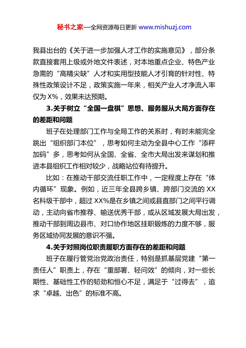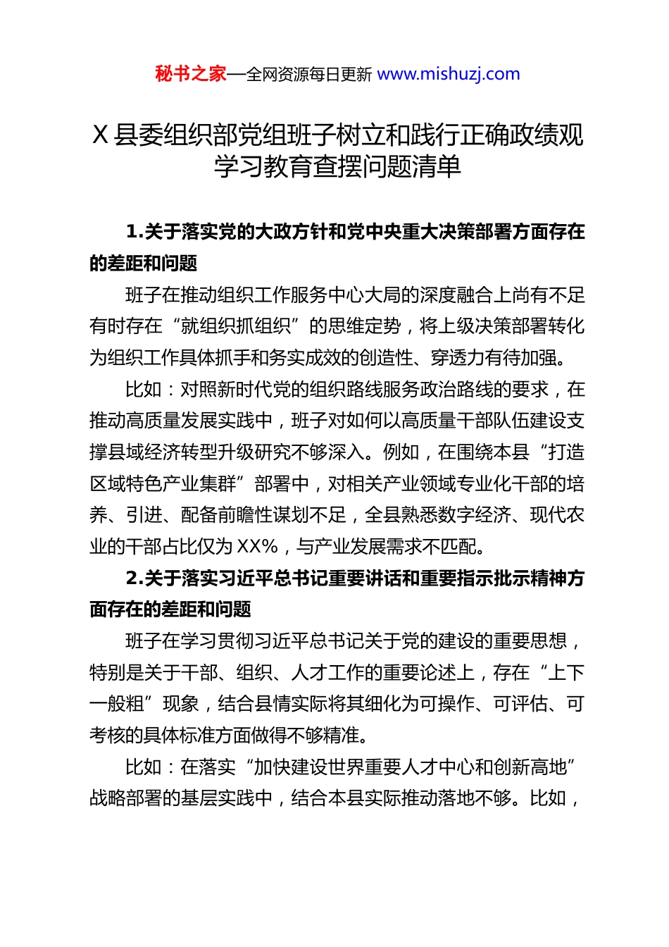 秘书之家—全网资源每日更新 www.mishuzj.comX 县委组织部党组班子树立和践行正确政绩观学习教育查摆问题清单1.关于落实党的大政方针和党中央重大决策部署方面存在的差距和问题班子在推动组织工作服务中心大局的深度融合上尚有不足有时存在“就组织抓组织”的思维定势,将上级决策部署转化为组织工作具体抓手和务实成效的创造性、穿透力有待加强。比如:对照新时代党的组织路线服务政治路线的要求,在推动高质量发展实践中,班子对如何以高质量干部队伍建设支撑县域经济转型升级研究不够深入。例如,在围绕本县“打造区域特色产业集群”部署中,对相关产业领域专业化干部的培养、引进、配备前瞻性谋划不足,全县熟悉数字经济、现代农业的干部占比仅为 XX%,与产业发展需求不匹配。2.关于落实习近平总书记重要讲话和重要指示批示精神方面存在的差距和问题班子在学习贯彻习近平总书记关于党的建设的重要思想,特别是关于干部、组织、人才工作的重要论述上,存在“上下一般粗”现象,结合县情实际将其细化为可操作、可评估、可考核的具体标准方面做得不够精准。比如:在落实“加快建设世界重要人才中心和创新高地”战略部署的基层实践中,结合本县实际推动落地不够。比如,秘书之家—全网资源每日更新 www.mishuzj.com我县出台的《关于进一步加强人才工作的实施意见》,部分条款直接套用上级或外地文件表述,对本地重点企业、特色产业急需的“高精尖缺”人才和实用型技能人才引育的针对性、特殊性政策设计不足,政策实施一年来,相关产业人才净流入率仅为 X%,效果未达预期。3.关于树立“全国一盘棋”思想、服务服从大局方面存在的差距和问题班子在处理部门工作与全局工作的关系时,有时未能完全跳出“组织部门本位”,思考如何主动为全县中心工作“添秤加码”多,思考如何从全国、全省、全市大局出发来谋划和推进本县组织工作相对较少,战略站位有待提升。比如:在推动干部交流任职工作中,一定程度上存在“体内循环”现象。例如,近三年全县跨乡镇、跨部门交流的 XX名科级干部中,超过 XX%是在乡镇之间或县直部门之间平行调动,主动向省市推荐、输送优秀干部,或从区域发展大局出发,推动干部到周边县市、对口协作地区挂职锻炼的力度不够,服务区域协同发展的意识不强。4.关于对照岗位职责履职方面存在的差距和问题班子在履行管党治党政治责任,特别是抓基层党建“第一责任人”职责上,存在“重部署、轻问效”的倾向,对一些长期性、基础性工作的韧劲和恒心不足,满足于“过得去”,追求“卓越、出色”的标准不高。秘书之家—全网资源每日更新 www.mishuzj.com比如:在推动基层党组织标准化规范化建设方面,存在“雨过地皮湿”现象。例如,虽然完成了全县 XXX 个村(社区)活动场所的达标建设,但后续管理使用、作用发挥的跟踪问效不够,抽查发现约 XX%的村级活动阵地存在“铁将军把门”或使用效率低下问题,联系服务党员群众的主阵地作用未充分发挥。5.关于坚持人民至上、践行全心全意为人民服务宗旨方面存在的差距和问题班子在谋划推进工作时,有时更注重对上负责、对考核指标负责,从“人民群众需要什么样的组织工作、党员干部期待什么样的组织部门”角度出发,问需于民、问计于民做得不够深入、经常。比如:在干部考核评价中,虽然引入了群众满意度测评,但权重偏低(仅占 XX%),且测评方式单一(多为集中开会填写),未能有效深入到服务对象、普通群众中听取真实声音。例如,在对县行政审批局领导班子考核时,其群众满意度测评得分一直较高,但同期“12345”热线中关于该局服务态度、办事效率的投诉量却呈上升趋势,考核的“指挥棒”作用与群众实际感受存在偏差。6.关于深入基层、联系服务群众方面存在的差距和问题班子存在“事务主义”倾向,忙于机关内部运转和上级交办任务多,主动“沉下去”开展“解剖麻雀”式调研、与基层秘书之家—全网资源每日更新 www.mishuzj.com党员干部群众面对面交流的时间、频次和深度不足,对基层真实情况掌握不够全面精准。比如:班子成员下基层调研存在“被安排”现象,走访路线、座谈对象预先设定较多。例如,在 XX 镇调研党...