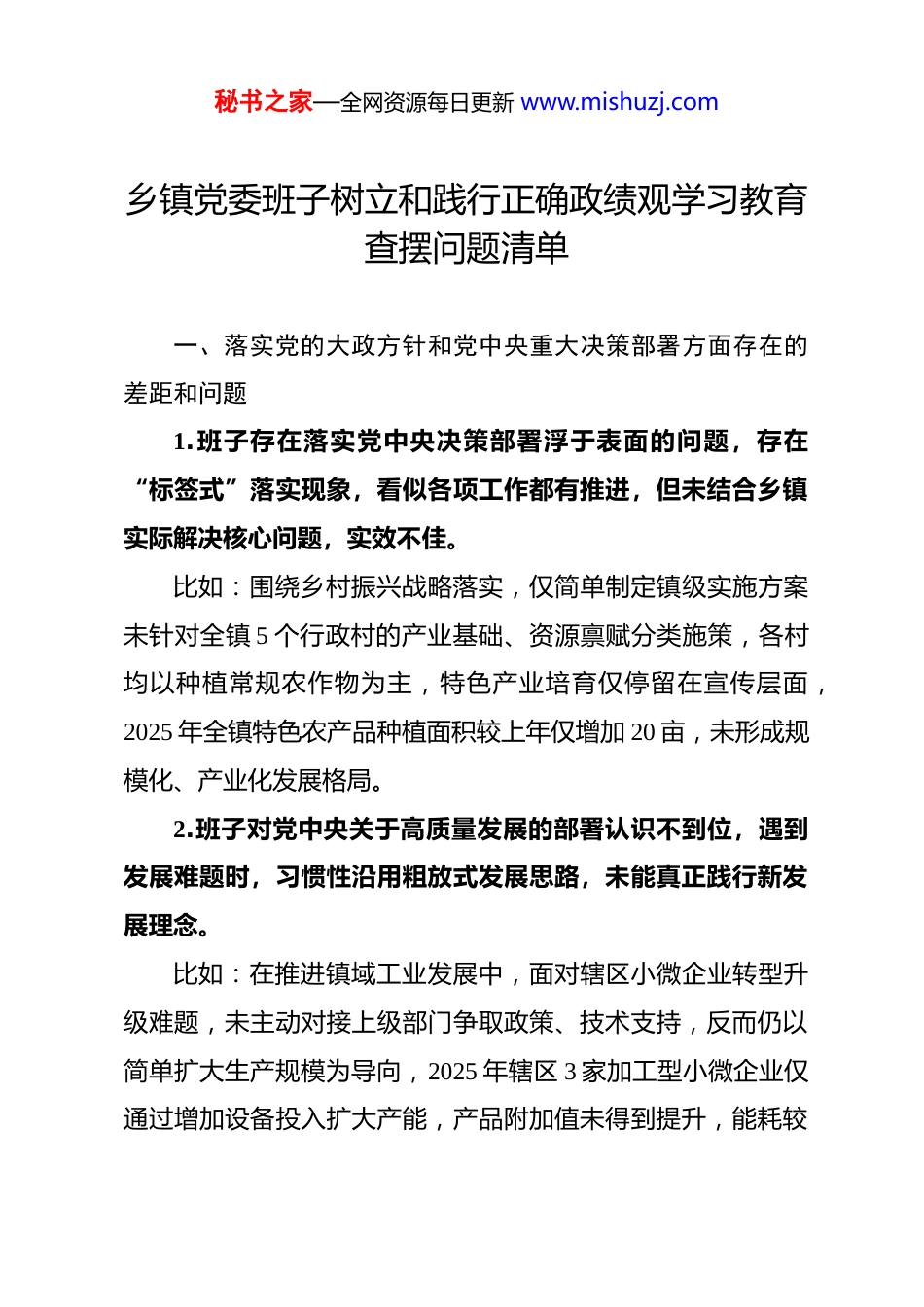 秘书之家—全网资源每日更新 www.mishuzj.com乡镇党委班子树立和践行正确政绩观学习教育查摆问题清单 一、落实党的大政方针和党中央重大决策部署方面存在的差距和问题1.班子存在落实党中央决策部署浮于表面的问题,存在“标签式”落实现象,看似各项工作都有推进,但未结合乡镇实际解决核心问题,实效不佳。比如:围绕乡村振兴战略落实,仅简单制定镇级实施方案未针对全镇 5 个行政村的产业基础、资源禀赋分类施策,各村均以种植常规农作物为主,特色产业培育仅停留在宣传层面,2025 年全镇特色农产品种植面积较上年仅增加 20 亩,未形成规模化、产业化发展格局。2.班子对党中央关于高质量发展的部署认识不到位,遇到发展难题时,习惯性沿用粗放式发展思路,未能真正践行新发展理念。比如:在推进镇域工业发展中,面对辖区小微企业转型升级难题,未主动对接上级部门争取政策、技术支持,反而仍以简单扩大生产规模为导向,2025 年辖区 3 家加工型小微企业仅通过增加设备投入扩大产能,产品附加值未得到提升,能耗较秘书之家—全网资源每日更新 www.mishuzj.com上年增加 15%。二、落实习近平总书记重要讲话和重要指示批示精神方面存在的差距和问题1.班子存在贯彻落实习近平总书记重要指示批示精神上下一般粗的问题,缺乏结合乡镇实际的创造性落实举措,针对性和实效性不足。比如:针对习近平总书记关于基层治理的重要指示批示精神,仅照搬上级文件要求成立镇级治理专班,未结合全镇流动人口多、自然村分布散的特点优化治理体系,专班成立以来仅开展 2 次集中排查,未解决村民反映的邻里矛盾、环境整治等实际问题 12 件。2.班子对习近平总书记关于“三农”工作的重要讲话精神贯彻落实存在打折扣现象,在工作推进中重部署、轻落地,未能将要求落到具体工作中。比如:落实习近平总书记关于保障粮食安全的重要讲话精神,仅完成上级下达的耕地种植任务,未对全镇 800 亩低产田进行改造提升,也未建立粮食生产管护长效机制,2025 年全镇小麦亩产较周边乡镇低 50 公斤,粮食生产保障能力未得到实质提升。三、树立“全国一盘棋”思想、服务服从大局方面存在的秘书之家—全网资源每日更新 www.mishuzj.com差距和问题1.班子存在本位主义思想,工作中更多考虑镇级局部利益,对上级部署的跨区域协作工作配合不力,未能站在全局角度推进工作。比如:在参与县域现代农业产业带建设中,因担心本镇集体土地流转后收益短期受影响,对上级要求的与邻镇共建果蔬种植基地工作消极应对,迟迟未完成土地流转摸底工作,导致产业带建设中本镇段推进滞后,影响全县整体建设进度。2.班子存在“割据式”落实问题,镇内各站所之间沟通协作不畅,各守各自工作领域,未形成工作合力,影响上级大局工作在镇级的落实效果。比如:落实上级农村人居环境整治提升工作,镇农业农村办、村镇建设办、生态环保办各自开展工作,农业农村办负责农田整治,村镇建设办负责村容整治,生态环保办负责污水治理,未制定统一整治方案,导致全镇 10 个自然村中 3 个村出现整治标准不统一、工作重复推进的问题,浪费人力物力约 5 万元。四、对照岗位职责履职方面存在的差距和问题1.班子部分成员存在能力不足的问题,面对乡村振兴、基层治理等新任务新挑战,缺乏有效的工作方法,推动高质量发秘书之家—全网资源每日更新 www.mishuzj.com展的能力亟待提升。比如:班子分管产业发展的成员,在推进镇域乡村旅游发展中,因缺乏旅游规划、运营管理相关知识,仅简单打造 2 个乡村旅游打卡点,未配套建设餐饮、住宿等基础设施,也未开展宣传推广,2025 年国庆假期全镇乡村旅游接待游客不足 500人,未形成旅游经济规模。2.班子存在抓党建工作不严不实的问题,对基层党建工作中发现的问题整改不力,党建工作与中心工作融合度不高,未能发挥党建引领作用。比如:针对上级巡察指出的全镇 3 个村党支部“三会一课”形式单一、内容空洞的问题,仅要求村党支部提交整改报告,未跟踪整改落实情况,半年后复查发现,村党支部仍以念文件、读报纸为主开展“三会一课”,党建工作未与村集体产业发展、基层治理等中心工作...