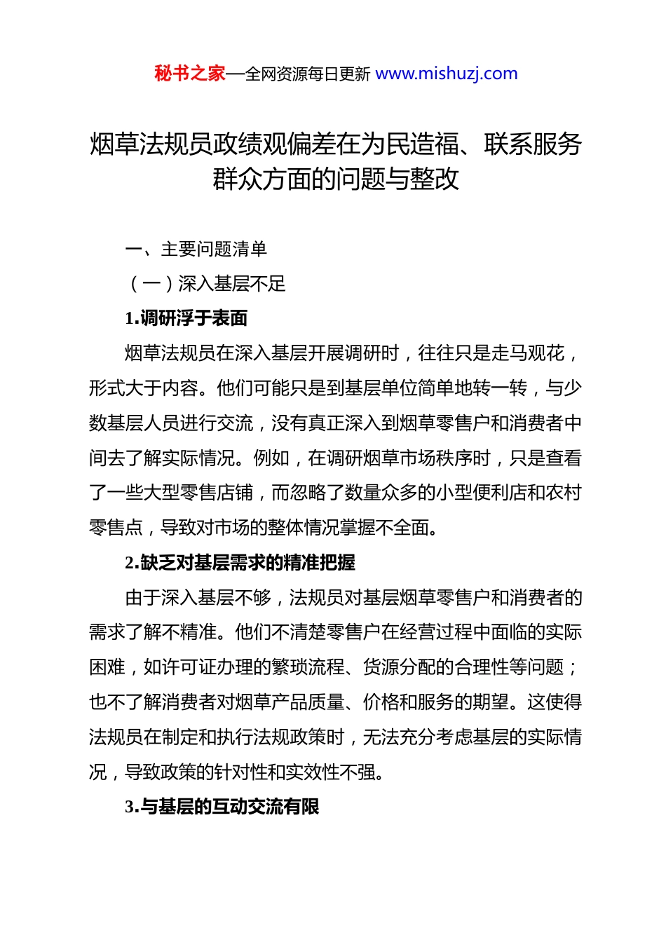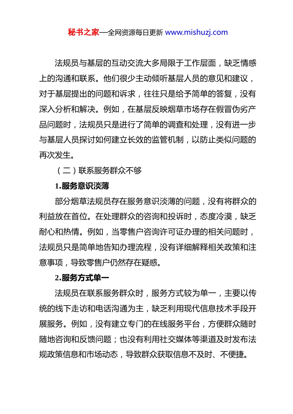 秘书之家—全网资源每日更新 www.mishuzj.com烟草法规员政绩观偏差在为民造福、联系服务群众方面的问题与整改 一、主要问题清单(一)深入基层不足1.调研浮于表面烟草法规员在深入基层开展调研时,往往只是走马观花,形式大于内容。他们可能只是到基层单位简单地转一转,与少数基层人员进行交流,没有真正深入到烟草零售户和消费者中间去了解实际情况。例如,在调研烟草市场秩序时,只是查看了一些大型零售店铺,而忽略了数量众多的小型便利店和农村零售点,导致对市场的整体情况掌握不全面。2.缺乏对基层需求的精准把握由于深入基层不够,法规员对基层烟草零售户和消费者的需求了解不精准。他们不清楚零售户在经营过程中面临的实际困难,如许可证办理的繁琐流程、货源分配的合理性等问题;也不了解消费者对烟草产品质量、价格和服务的期望。这使得法规员在制定和执行法规政策时,无法充分考虑基层的实际情况,导致政策的针对性和实效性不强。3.与基层的互动交流有限秘书之家—全网资源每日更新 www.mishuzj.com法规员与基层的互动交流大多局限于工作层面,缺乏情感上的沟通和联系。他们很少主动倾听基层人员的意见和建议,对于基层提出的问题和诉求,往往只是给予简单的答复,没有深入分析和解决。例如,在基层反映烟草市场存在假冒伪劣产品问题时,法规员只是进行了简单的调查和处理,没有进一步与基层人员探讨如何建立长效的监管机制,以防止类似问题的再次发生。(二)联系服务群众不够1.服务意识淡薄部分烟草法规员存在服务意识淡薄的问题,没有将群众的利益放在首位。在处理群众的咨询和投诉时,态度冷漠,缺乏耐心和热情。例如,当零售户咨询许可证办理的相关问题时,法规员只是简单地告知办理流程,没有详细解释相关政策和注意事项,导致零售户仍然存在疑惑。2.服务方式单一法规员在联系服务群众时,服务方式较为单一,主要以传统的线下走访和电话沟通为主,缺乏利用现代信息技术手段开展服务。例如,没有建立专门的在线服务平台,方便群众随时随地咨询和反馈问题;也没有利用社交媒体等渠道及时发布法规政策信息和市场动态,导致群众获取信息不及时、不便捷。秘书之家—全网资源每日更新 www.mishuzj.com3.解决群众问题的能力不足在面对群众提出的复杂问题时,法规员往往缺乏有效的解决办法。他们可能对相关法规政策的理解不够深入,无法准确运用法规来解决实际问题;或者在处理问题时缺乏协调能力,不能有效地整合各方资源,导致问题得不到及时解决。例如,当零售户反映与供应商之间的纠纷问题时,法规员不能有效地协调双方进行沟通和协商,导致问题长期得不到解决,影响了零售户的正常经营。二、整改措施(一)加强深入基层的力度1.制定详细的基层调研计划法规员应制定详细的基层调研计划,明确调研的目标、内容、对象和方式。定期深入到基层烟草零售户和消费者中间,了解他们的实际需求和困难。例如,每月安排一定的时间到不同地区的零售店铺进行实地调研,与零售户进行面对面的交流,了解他们在经营过程中遇到的问题和对法规政策的意见建议。2.提高调研的质量和效果在调研过程中,法规员要注重提高调研的质量和效果。采用多种调研方法,如问卷调查、访谈、实地观察等,全面、深入地了解基层情况。同时,要对调研结果进行认真分析和总结,秘书之家—全网资源每日更新 www.mishuzj.com形成有针对性的调研报告,为法规政策的制定和调整提供依据。3.加强与基层的互动交流法规员要加强与基层的互动交流,建立良好的沟通机制。定期组织召开基层座谈会,邀请零售户和消费者代表参加,听取他们的意见和建议。同时,要及时回复基层人员的咨询和反馈,对于基层提出的问题和诉求,要认真对待,及时解决。(二)增强联系服务群众的能力1.强化服务意识通过开展专题培训和教育活动,强化法规员的服务意识。使他们深刻认识到为民造福是烟草法规工作的出发点和落脚点,要始终把群众的利益放在首位。在工作中,要热情、耐心地为群众提供服务,做到主动、高效、优质。2.创新服务方式利用现代信息技术手段,创新服务方式。建立专门的在线服务平台,提供法规政策咨询、许可证办理、投...