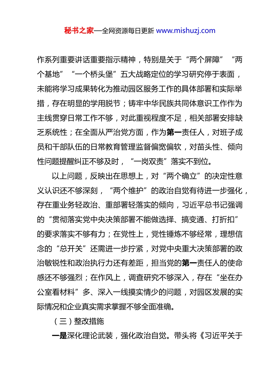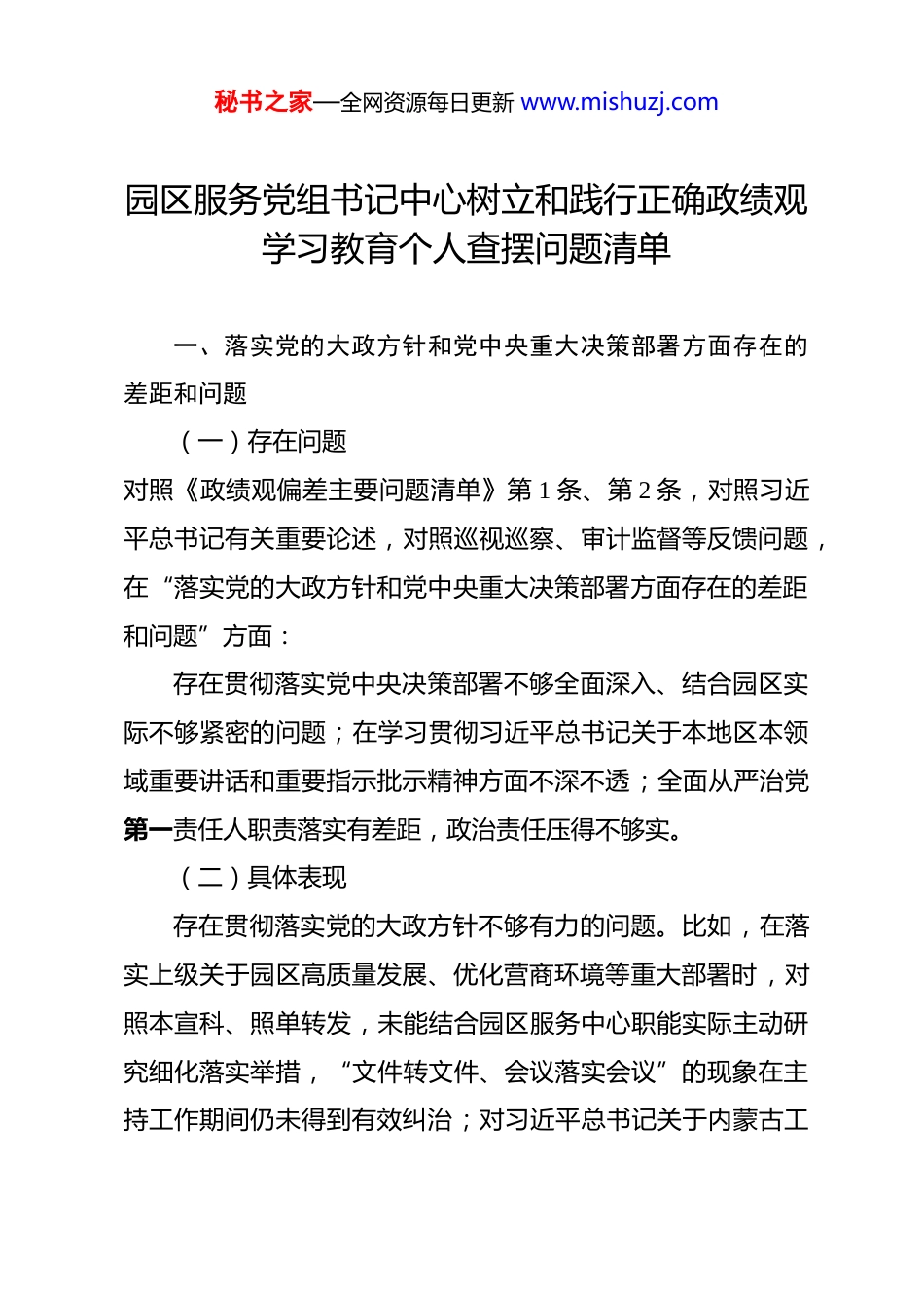 秘书之家—全网资源每日更新 www.mishuzj.com园区服务党组书记中心树立和践行正确政绩观学习教育个人查摆问题清单 一、落实党的大政方针和党中央重大决策部署方面存在的差距和问题(一)存在问题对照《政绩观偏差主要问题清单》第 1 条、第 2 条,对照习近平总书记有关重要论述,对照巡视巡察、审计监督等反馈问题,在“落实党的大政方针和党中央重大决策部署方面存在的差距和问题”方面:存在贯彻落实党中央决策部署不够全面深入、结合园区实际不够紧密的问题;在学习贯彻习近平总书记关于本地区本领域重要讲话和重要指示批示精神方面不深不透;全面从严治党第一责任人职责落实有差距,政治责任压得不够实。(二)具体表现存在贯彻落实党的大政方针不够有力的问题。比如,在落实上级关于园区高质量发展、优化营商环境等重大部署时,对照本宣科、照单转发,未能结合园区服务中心职能实际主动研究细化落实举措,“文件转文件、会议落实会议”的现象在主持工作期间仍未得到有效纠治;对习近平总书记关于内蒙古工秘书之家—全网资源每日更新 www.mishuzj.com作系列重要讲话重要指示精神,特别是关于“两个屏障”“两个基地”“一个桥头堡”五大战略定位的学习研究停于表面,未能将学习成果转化为推动园区服务工作的具体部署和实际举措,存在明显的学用脱节;铸牢中华民族共同体意识工作作为主线贯穿日常工作不够,对此重视程度不足,相关部署安排缺乏系统性;在全面从严治党方面,作为第一责任人,对班子成员和干部队伍的日常教育管理监督偏宽偏软,对苗头性、倾向性问题提醒纠正不够及时,“一岗双责”落实不到位。以上问题,反映出在思想上,对“两个确立”的决定性意义认识还不够深刻,“两个维护”的政治自觉有待进一步强化,存在重业务轻政治、重部署轻落实的倾向,习近平总书记强调的“贯彻落实党中央决策部署不能做选择、搞变通、打折扣”的要求落实不够有力;在党性上,党性锤炼不够经常,理想信念的“总开关”还需进一步拧紧,对党中央重大决策部署的政治敏锐性和政治执行力还有差距,担当党的第一责任人的使命感还不够强烈;在作风上,调查研究不够深入,存在“坐在办公室看材料”多、深入一线摸实情少的问题,对园区发展的实际情况和企业真实需求掌握不够全面准确。(三)整改措施一是深化理论武装,强化政治自觉。带头将《习近平关于秘书之家—全网资源每日更新 www.mishuzj.com树立和践行正确政绩观论述摘编》列为必学教材,通过党组理论学习中心组集中研讨、个人自学等方式深学细悟,深刻把握“立党为公、为民造福、科学决策、真抓实干”总要求,切实增强贯彻落实党中央重大决策部署的政治自觉、思想自觉和行动自觉。二是细化落实举措,杜绝“上下一般粗”。针对上级每项重大决策部署,带头组织专题研究,亲自主持制定结合园区服务中心实际的贯彻落实方案,建立“学习—研究—细化—落实—督查”工作闭环,确保每项政策在园区落地生根、见到实效,坚决杜绝照本宣科、简单转发了事。三是压实全面从严治党政治责任。严格落实“一岗双责”,定期开展廉政谈话和警示教育,完善抓基层党建工作述职评议机制,将全面从严治党工作纳入重要议事日程,做到抓业务与抓党建同步部署、同步推进、同步考核,真正扛起第一责任人的政治担当。二、坚持人民至上、践行为民宗旨方面存在的差距和问题(一)存在问题对照《政绩观偏差主要问题清单》第 5 条、第 6 条、第 7条,对照习近平总书记有关重要论述,在“坚持人民至上、践行全心全意为人民服务宗旨”及“深入基层、联系服务群众”秘书之家—全网资源每日更新 www.mishuzj.com方面:存在以人民为中心的发展思想树得不够牢、主动服务意识不强的问题;深入调研不够,对园区企业和群众真实需求底数不够清晰;推动解决群众急难愁盼问题的主动性和力度有待加强。(二)具体表现存在联系服务群众不够主动、深入基层不够扎实的问题。比如,在推进“四下基层”制度落实中,存在走访频次不够、形式重于内容的问题,下基层调研多停留于听汇报、看现场,与企业和群众面对面交流、深入了解真实情况不够;对入驻园区企业反映的经营困...