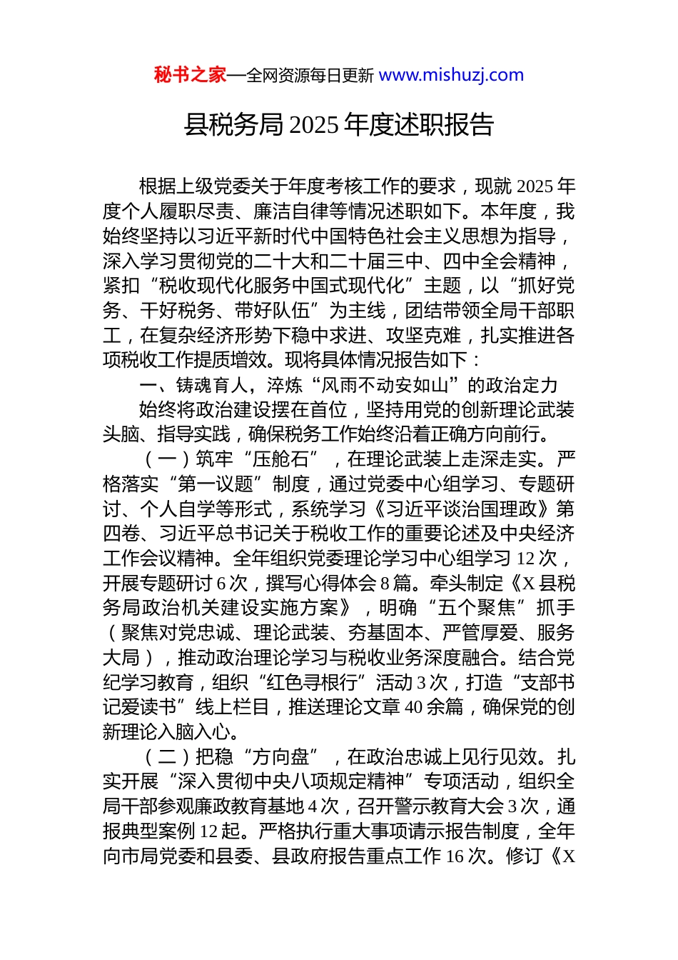 秘书之家—全网资源每日更新 www.mishuzj.com县税务局 2025 年度述职报告根据上级党委关于年度考核工作的要求,现就 2025 年度个人履职尽责、廉洁自律等情况述职如下。本年度,我始终坚持以习近平新时代中国特色社会主义思想为指导,深入学习贯彻党的二十大和二十届三中、四中全会精神,紧扣“税收现代化服务中国式现代化”主题,以“抓好党务、干好税务、带好队伍”为主线,团结带领全局干部职工,在复杂经济形势下稳中求进、攻坚克难,扎实推进各项税收工作提质增效。现将具体情况报告如下:一、铸魂育人,淬炼“风雨不动安如山”的政治定力始终将政治建设摆在首位,坚持用党的创新理论武装头脑、指导实践,确保税务工作始终沿着正确方向前行。(一)筑牢“压舱石”,在理论武装上走深走实。严格落实“第一议题”制度,通过党委中心组学习、专题研讨、个人自学等形式,系统学习《习近平谈治国理政》第四卷、习近平总书记关于税收工作的重要论述及中央经济工作会议精神。全年组织党委理论学习中心组学习 12 次,开展专题研讨 6 次,撰写心得体会 8 篇。牵头制定《X 县税务局政治机关建设实施方案》,明确“五个聚焦”抓手(聚焦对党忠诚、理论武装、夯基固本、严管厚爱、服务大局),推动政治理论学习与税收业务深度融合。结合党纪学习教育,组织“红色寻根行”活动 3 次,打造“支部书记爱读书”线上栏目,推送理论文章 40 余篇,确保党的创新理论入脑入心。(二)把稳“方向盘”,在政治忠诚上见行见效。扎实开展“深入贯彻中央八项规定精神”专项活动,组织全局干部参观廉政教育基地 4 次,召开警示教育大会 3 次,通报典型案例 12 起。严格执行重大事项请示报告制度,全年向市局党委和县委、县政府报告重点工作 16 次。修订《X秘书之家—全网资源每日更新 www.mishuzj.com县税务局公务接待管理办法》等 5 项制度,压缩公务支出同比降低 8%。在减税降费、组织收入等关键工作中,主动对标中央和省委要求,确保政令畅通、执行有力。(三)激活“一池水”,在思想引领上求新求变。实施“青年干部赋能计划”,通过“师徒结对”“岗位练兵”培养青年骨干 15 名,其中 3 人在市级业务竞赛中获奖。创新开展“税月清风”微党课比赛,拍摄廉政微电影《税月清风》在全局展播。结合 2025 年数字税务建设要求,搭建“云端学习平台”,推送政策解读视频 30 期,覆盖干部 600 余人次,全面提升政治素养与业务能力。二、履职尽责,扛起“功成必定有我”的税务担当紧扣税收主责主业,坚持稳中求进工作总基调,推动组织收入、征管改革、纳税服务等重点工作落地见效。(一)在组织收入上“量质齐升”。面对经济下行压力,坚持依法征收、应收尽收,全年组织各项税收收入 XX亿元,同比增长 X%,其中县级收入 XX 亿元,完成年度任务的 105%。加强税源监控,对年纳税额 100 万元以上的企业实行“一户一策”管理,动态跟踪重点项目建设税收情况,清缴欠税 1200 万元。推行“税收风险防控清单”制度,提前识别化解风险点 28 个,确保收入质量稳中有升。(二)在征管改革上“破立并举”。深化税收征管改革,全面推广“金税四期”系统,实现主要税种数字化管理覆盖率 100%。创新“信用+风险”监管模式,对 A 级纳税人提供绿色通道服务,对 D 级纳税人实施重点稽查,全年稽查补税 3800 万元,同比增长 15%。推进“非接触式”办税,网上办税率达 92%,同比提升 5 个百分点;推广电子发票覆盖小微企业 1.2 万户,减少纸质发票使用量 30%。(三)在纳税服务上“温心贴心”。开展“便民办税春风行动”,落实减税降费政策,全年为小微企业减免税费 XX 万元。创新“青年导税员”制度,提供全程导税服务500 余次,纳税人满意度测评达 98.5%。建立“税费争议调秘书之家—全网资源每日更新 www.mishuzj.com解室”,化解征纳矛盾 12 起,实现“零投诉”。联合银行推行“银税互动”,为守信企业提供贷款 1.2 亿元,助力营商环境优化。三、廉洁自律,永葆“只留清气满乾坤”的政治本色严格落实全面从严治党主体责任,带头遵守廉洁纪律,营造...