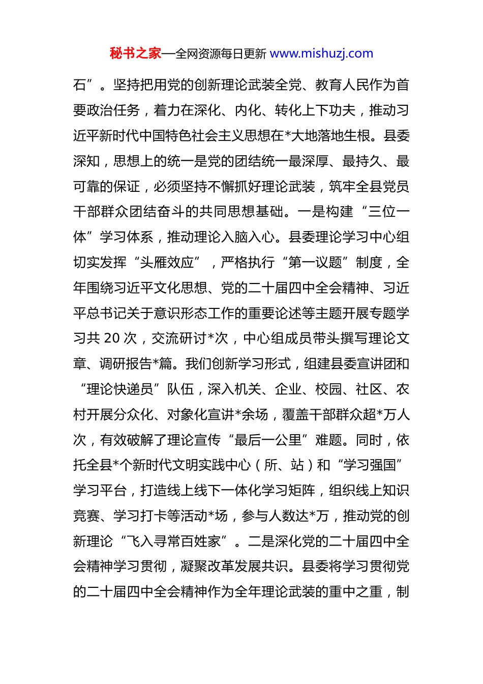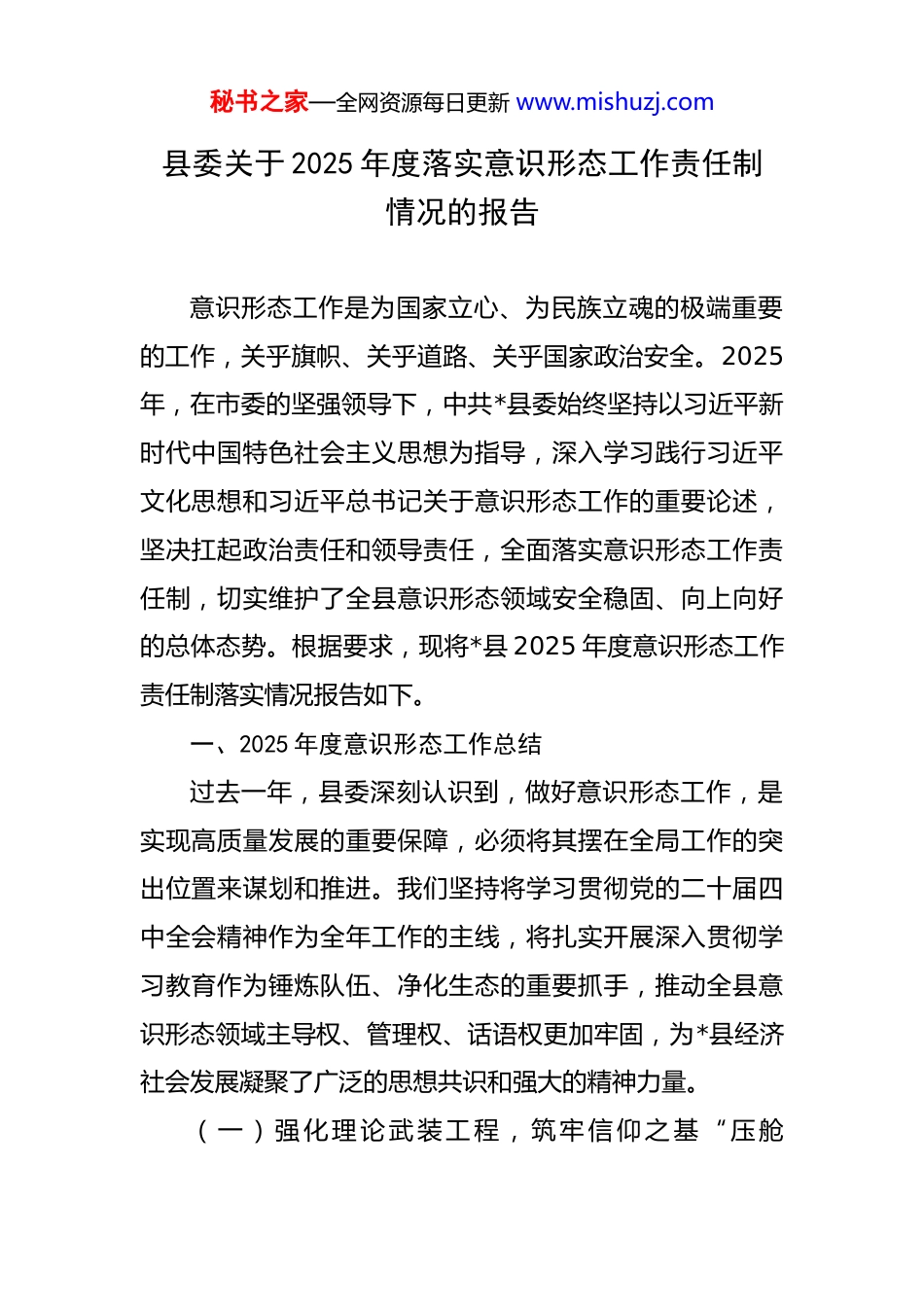 秘书之家—全网资源每日更新 www.mishuzj.com县委关于 2025 年度落实意识形态工作责任制情况的报告 意识形态工作是为国家立心、为民族立魂的极端重要的工作,关乎旗帜、关乎道路、关乎国家政治安全。2025年,在市委的坚强领导下,中共*县委始终坚持以习近平新时代中国特色社会主义思想为指导,深入学习践行习近平文化思想和习近平总书记关于意识形态工作的重要论述,坚决扛起政治责任和领导责任,全面落实意识形态工作责任制,切实维护了全县意识形态领域安全稳固、向上向好的总体态势。根据要求,现将*县 2025 年度意识形态工作责任制落实情况报告如下。一、2025 年度意识形态工作总结过去一年,县委深刻认识到,做好意识形态工作,是实现高质量发展的重要保障,必须将其摆在全局工作的突出位置来谋划和推进。我们坚持将学习贯彻党的二十届四中全会精神作为全年工作的主线,将扎实开展深入贯彻学习教育作为锤炼队伍、净化生态的重要抓手,推动全县意识形态领域主导权、管理权、话语权更加牢固,为*县经济社会发展凝聚了广泛的思想共识和强大的精神力量。(一)强化理论武装工程,筑牢信仰之基“压舱秘书之家—全网资源每日更新 www.mishuzj.com石”。坚持把用党的创新理论武装全党、教育人民作为首要政治任务,着力在深化、内化、转化上下功夫,推动习近平新时代中国特色社会主义思想在*大地落地生根。县委深知,思想上的统一是党的团结统一最深厚、最持久、最可靠的保证,必须坚持不懈抓好理论武装,筑牢全县党员干部群众团结奋斗的共同思想基础。一是构建“三位一体”学习体系,推动理论入脑入心。县委理论学习中心组切实发挥“头雁效应”,严格执行“第一议题”制度,全年围绕习近平文化思想、党的二十届四中全会精神、习近平总书记关于意识形态工作的重要论述等主题开展专题学习共 20 次,交流研讨*次,中心组成员带头撰写理论文章、调研报告*篇。我们创新学习形式,组建县委宣讲团和“理论快递员”队伍,深入机关、企业、校园、社区、农村开展分众化、对象化宣讲*余场,覆盖干部群众超*万人次,有效破解了理论宣传“最后一公里”难题。同时,依托全县*个新时代文明实践中心(所、站)和“学习强国”学习平台,打造线上线下一体化学习矩阵,组织线上知识竞赛、学习打卡等活动*场,参与人数达*万,推动党的创新理论“飞入寻常百姓家”。二是深化党的二十届四中全会精神学习贯彻,凝聚改革发展共识。县委将学习贯彻党的二十届四中全会精神作为全年理论武装的重中之重,制秘书之家—全网资源每日更新 www.mishuzj.com定专项学习方案,举办专题读书班、辅导报告会*期,对全县*名科级以上领导干部进行了全员轮训。我们紧密联系*县改革发展稳定实际,聚焦全会提出的重大决策部署,组织全县各级党组织开展“学习贯彻四中全会精神,我们怎么干”大讨论*余场,征集意见建议*条,形成推动县域治理体系和治理能力现代化的具体举措*项。通过深入学习和研讨,全县上下深刻把握了坚持和完善中国特色社会主义制度、推进国家治理现代化的重大意义和实践要求,进一步统一了思想、明确了方向、凝聚了力量。三是健全常态化长效化学习机制,巩固拓展学习成果。县委研究制定并严格执行《关于巩固拓展主题教育成果健全理论学习长效机制的实施意见》,推动理论学习从“一阵风”转向“常态化”。我们将意识形态相关内容纳入党员干部教育培训的必修课程,在县委党校(行政学院)全年举办的*个主体班次中均设置专门教学模块,累计培训干部*人次。建立理论学习督查旁听机制,县委宣传部会同组织部、党校组建联合工作组,对*个乡镇(街道)和*个县直部门党委(党组)理论学习中心组学习情况进行现场旁听和督导检查,发现问题*个并督促整改到位,有效提升了学习的规范化、制度化水平。(二)压实主体责任 链条,拧紧履职担当 “责任秘书之家—全网资源每日更新 www.mishuzj.com阀”。严格落实意识形态工作责任制,是确保党对意识形态工作领导权落到实处的制度保障。县委牢固树立“抓意识形态工作是本职、不抓是失职、抓不好是渎职”的理念,坚持以上率下,层层传导压力,推动形成党委统一领导...
