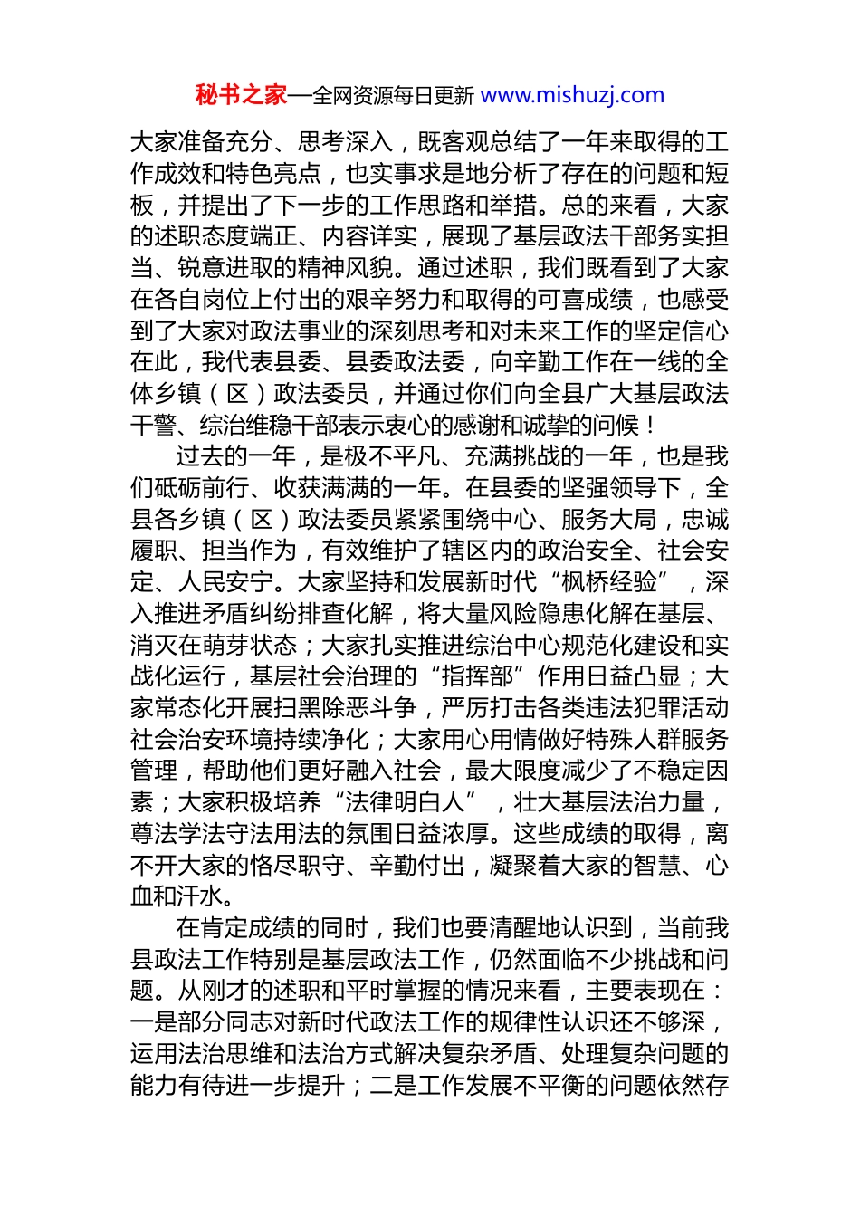秘书之家—全网资源每日更新 www.mishuzj.com县委政法委书记在 2025 年乡镇(区)政法委员述职报告会议上的讲话汇编(3 篇)目录1.xx 县委政法委书记在 2025 年乡镇(区)政法委员述职报告会议上的讲话...............................................22.xx 县委政法委书记在 2025 年乡镇(区)政法委员述职报告会议上的讲话.............................................123.xx 县委政法委书记在 2025 年乡镇(区)政法委员述职报告会议上的讲话.............................................21xx 县委政法委书记在 2025 年乡镇(区)政法委员述职报告会议上的讲话同志们:今天我们召开 2025 年全县乡镇(区)政法委员述职报告会,主要任务是深入学习贯彻*的二十届四中全会精神,全面贯彻落实《中国共产*政法工作条例》,听取各乡镇(区)政法委员的年度述职,总结成绩、查摆不足,分析形势、明确方向,进一步统一思想、凝聚共识,提升全县政法委员的政治素养和履职本领,为纵深推进平安 xx、法治 xx 建设奠定更加坚实的基础。刚才,各乡镇(区)的政法委员逐一作了述职发言。秘书之家—全网资源每日更新 www.mishuzj.com大家准备充分、思考深入,既客观总结了一年来取得的工作成效和特色亮点,也实事求是地分析了存在的问题和短板,并提出了下一步的工作思路和举措。总的来看,大家的述职态度端正、内容详实,展现了基层政法干部务实担当、锐意进取的精神风貌。通过述职,我们既看到了大家在各自岗位上付出的艰辛努力和取得的可喜成绩,也感受到了大家对政法事业的深刻思考和对未来工作的坚定信心在此,我代表县委、县委政法委,向辛勤工作在一线的全体乡镇(区)政法委员,并通过你们向全县广大基层政法干警、综治维稳干部表示衷心的感谢和诚挚的问候!过去的一年,是极不平凡、充满挑战的一年,也是我们砥砺前行、收获满满的一年。在县委的坚强领导下,全县各乡镇(区)政法委员紧紧围绕中心、服务大局,忠诚履职、担当作为,有效维护了辖区内的政治安全、社会安定、人民安宁。大家坚持和发展新时代“枫桥经验”,深入推进矛盾纠纷排查化解,将大量风险隐患化解在基层、消灭在萌芽状态;大家扎实推进综治中心规范化建设和实战化运行,基层社会治理的“指挥部”作用日益凸显;大家常态化开展扫黑除恶斗争,严厉打击各类违法犯罪活动社会治安环境持续净化;大家用心用情做好特殊人群服务管理,帮助他们更好融入社会,最大限度减少了不稳定因素;大家积极培养“法律明白人”,壮大基层法治力量,尊法学法守法用法的氛围日益浓厚。这些成绩的取得,离不开大家的恪尽职守、辛勤付出,凝聚着大家的智慧、心血和汗水。在肯定成绩的同时,我们也要清醒地认识到,当前我县政法工作特别是基层政法工作,仍然面临不少挑战和问题。从刚才的述职和平时掌握的情况来看,主要表现在:一是部分同志对新时代政法工作的规律性认识还不够深,运用法治思维和法治方式解决复杂矛盾、处理复杂问题的能力有待进一步提升;二是工作发展不平衡的问题依然存秘书之家—全网资源每日更新 www.mishuzj.com在,有的乡镇工作亮点突出、成效显著,有的则相对滞后办法不多;三是基层基础仍有薄弱环节,部分综治中心作用发挥还不充分,“雪亮工程”等科技手段赋能治理的效果有待进一步挖掘;四是风险防范化解的压力依然较大,各类新旧矛盾交织叠加,特别是随着经济社会快速发展,由此引发的新的风险点需要高度警惕;五是工作机制有待进一步完善,信息互通、力量协同、工作联动的合力还需要进一步加强。这些问题,都需要我们在今后的工作中高度重视,认真研究,采取有效措施切实加以解决。2026 年是“十五五”规划的开局之年,也是我们向着更高水平的平安 xx、法治 xx 迈进的关键之年。做好明年的政法工作,意义重大、责任重大。全县各乡镇(区)政法委员要进一步增强责任感和使命感,以更加饱满的热情、更加务实的作风、更加有力的举措,推动基层政法工作再上新台阶。借此机会,我结合大家的述职情况和当前工作实际,就如何进一步当好乡镇政法委员、做好新一年政法工作,讲几点意见...