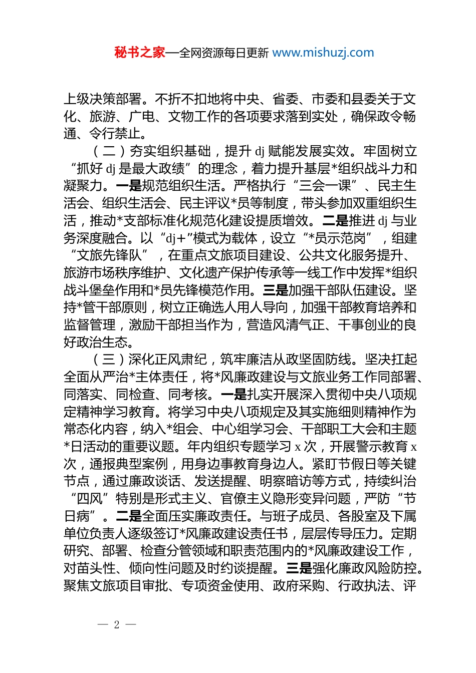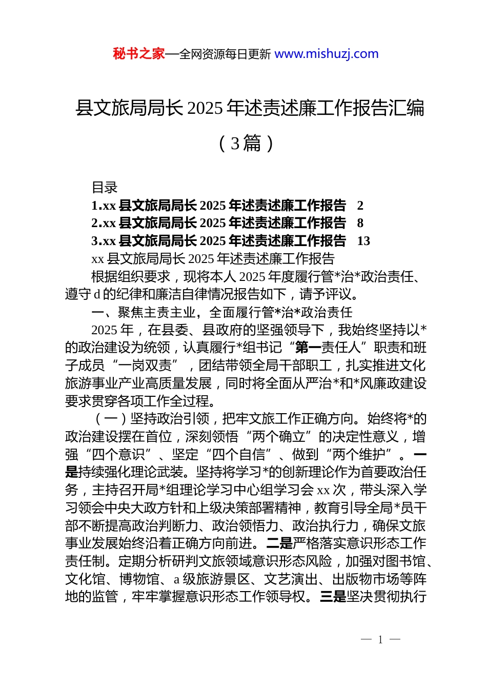 秘书之家—全网资源每日更新 www.mishuzj.com县文旅局局长 2025 年述责述廉工作报告汇编(3 篇)目录1.xx 县文旅局局长 2025 年述责述廉工作报告22.xx 县文旅局局长 2025 年述责述廉工作报告83.xx 县文旅局局长 2025 年述责述廉工作报告13xx 县文旅局局长 2025 年述责述廉工作报告根据组织要求,现将本人 2025 年度履行管*治*政治责任、遵守 d 的纪律和廉洁自律情况报告如下,请予评议。一、聚焦主责主业,全面履行管*治*政治责任2025 年,在县委、县政府的坚强领导下,我始终坚持以*的政治建设为统领,认真履行*组书记“第一责任人”职责和班子成员“一岗双责”,团结带领全局干部职工,扎实推进文化旅游事业产业高质量发展,同时将全面从严治*和*风廉政建设要求贯穿各项工作全过程。(一)坚持政治引领,把牢文旅工作正确方向。始终将*的政治建设摆在首位,深刻领悟“两个确立”的决定性意义,增强“四个意识”、坚定“四个自信”、做到“两个维护”。一是持续强化理论武装。坚持将学习*的创新理论作为首要政治任务,主持召开局*组理论学习中心组学习会 xx 次,带头深入学习领会中央大政方针和上级决策部署精神,教育引导全局*员干部不断提高政治判断力、政治领悟力、政治执行力,确保文旅事业发展始终沿着正确方向前进。二是严格落实意识形态工作责任制。定期分析研判文旅领域意识形态风险,加强对图书馆、文化馆、博物馆、a 级旅游景区、文艺演出、出版物市场等阵地的监管,牢牢掌握意识形态工作领导权。三是坚决贯彻执行— 1 —秘书之家—全网资源每日更新 www.mishuzj.com上级决策部署。不折不扣地将中央、省委、市委和县委关于文化、旅游、广电、文物工作的各项要求落到实处,确保政令畅通、令行禁止。(二)夯实组织基础,提升 dj 赋能发展实效。牢固树立“抓好 dj 是最大政绩”的理念,着力提升基层*组织战斗力和凝聚力。一是规范组织生活。严格执行“三会一课”、民主生活会、组织生活会、民主评议*员等制度,带头参加双重组织生活,推动*支部标准化规范化建设提质增效。二是推进 dj 与业务深度融合。以“dj+”模式为载体,设立“*员示范岗”,组建“文旅先锋队”,在重点文旅项目建设、公共文化服务提升、旅游市场秩序维护、文化遗产保护传承等一线工作中发挥*组织战斗堡垒作用和*员先锋模范作用。三是加强干部队伍建设。坚持*管干部原则,树立正确选人用人导向,加强干部教育培养和监督管理,激励干部担当作为,营造风清气正、干事创业的良好政治生态。(三)深化正风肃纪,筑牢廉洁从政坚固防线。坚决扛起全面从严治*主体责任,将*风廉政建设与文旅业务工作同部署、同落实、同检查、同考核。一是扎实开展深入贯彻中央八项规定精神学习教育。将学习中央八项规定及其实施细则精神作为常态化内容,纳入*组会、中心组学习会、干部职工大会和主题*日活动的重要议题。年内组织专题学习 x 次,开展警示教育 x次,通报典型案例,用身边事教育身边人。紧盯节假日等关键节点,通过廉政谈话、发送提醒、明察暗访等方式,持续纠治“四风”特别是形式主义、官僚主义隐形变异问题,严防“节日病”。二是全面压实廉政责任。与班子成员、各股室及下属单位负责人逐级签订*风廉政建设责任书,层层传导压力。定期研究、部署、检查分管领域和职责范围内的*风廉政建设工作,对苗头性、倾向性问题及时约谈提醒。三是强化廉政风险防控。聚焦文旅项目审批、专项资金使用、政府采购、行政执法、评— 2 —秘书之家—全网资源每日更新 www.mishuzj.com奖评优等关键环节和重点岗位,全面排查廉政风险点 xx 个,制定防控措施 xx 条,修订完善内部管理制度 x 项,扎紧制度笼子。四是自觉接受各方监督。严格执行民主集中制、“三重一大”集体决策制度,主动公开政务信息,畅通监督渠道。带头严格执行廉洁自律各项规定,管好自己、管好家人亲属和身边工作人员,保持清正廉洁的政治本色。二、坚持问题导向,深入查摆剖析存在不足在总结成绩的同时,对照上级要求、群众期盼和先进标杆深刻认识到自身在履责和廉政方面还存在一些不容忽视的问题,主要表现在...