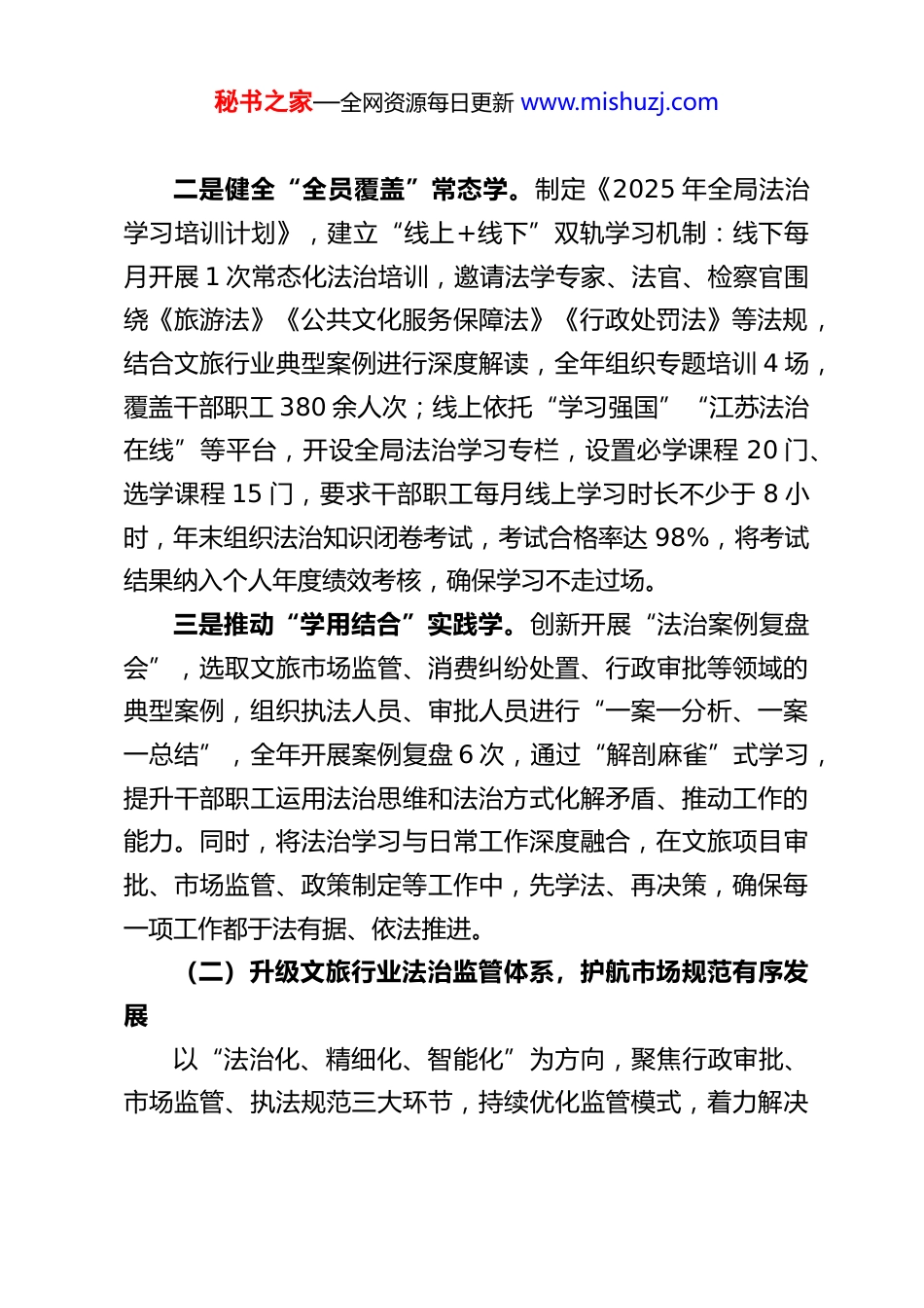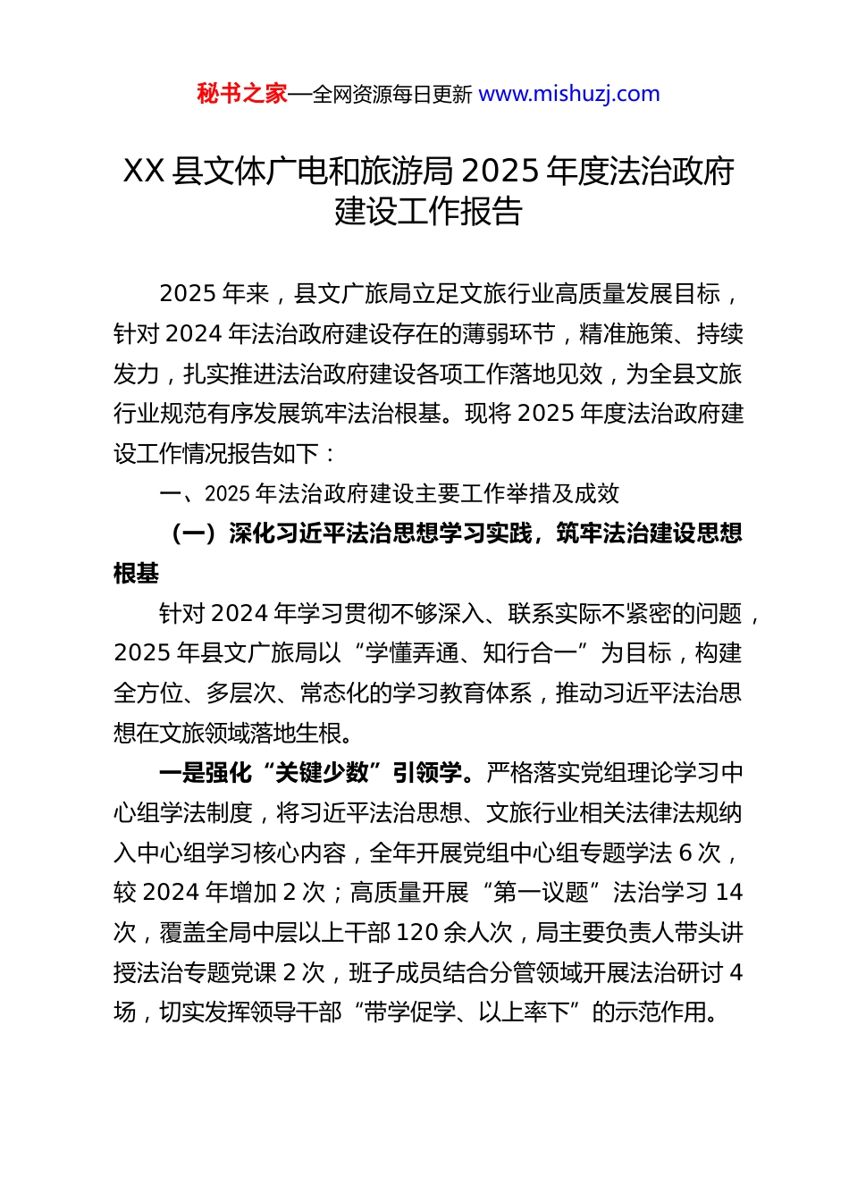 秘书之家—全网资源每日更新 www.mishuzj.comXX 县文体广电和旅游局 2025 年度法治政府建设工作报告2025 年来,县文广旅局立足文旅行业高质量发展目标,针对 2024 年法治政府建设存在的薄弱环节,精准施策、持续发力,扎实推进法治政府建设各项工作落地见效,为全县文旅行业规范有序发展筑牢法治根基。现将 2025 年度法治政府建设工作情况报告如下:一、2025 年法治政府建设主要工作举措及成效(一)深化习近平法治思想学习实践,筑牢法治建设思想根基针对 2024 年学习贯彻不够深入、联系实际不紧密的问题,2025 年县文广旅局以“学懂弄通、知行合一”为目标,构建全方位、多层次、常态化的学习教育体系,推动习近平法治思想在文旅领域落地生根。一是强化“关键少数”引领学。严格落实党组理论学习中心组学法制度,将习近平法治思想、文旅行业相关法律法规纳入中心组学习核心内容,全年开展党组中心组专题学法 6 次,较 2024 年增加 2 次;高质量开展“第一议题”法治学习 14次,覆盖全局中层以上干部 120 余人次,局主要负责人带头讲授法治专题党课 2 次,班子成员结合分管领域开展法治研讨 4场,切实发挥领导干部“带学促学、以上率下”的示范作用。秘书之家—全网资源每日更新 www.mishuzj.com二是健全“全员覆盖”常态学。制定《2025 年全局法治学习培训计划》,建立“线上+线下”双轨学习机制:线下每月开展 1 次常态化法治培训,邀请法学专家、法官、检察官围绕《旅游法》《公共文化服务保障法》《行政处罚法》等法规,结合文旅行业典型案例进行深度解读,全年组织专题培训 4 场,覆盖干部职工 380 余人次;线上依托“学习强国”“江苏法治在线”等平台,开设全局法治学习专栏,设置必学课程 20 门、选学课程 15 门,要求干部职工每月线上学习时长不少于 8 小时,年末组织法治知识闭卷考试,考试合格率达 98%,将考试结果纳入个人年度绩效考核,确保学习不走过场。三是推动“学用结合”实践学。创新开展“法治案例复盘会”,选取文旅市场监管、消费纠纷处置、行政审批等领域的典型案例,组织执法人员、审批人员进行“一案一分析、一案一总结”,全年开展案例复盘 6 次,通过“解剖麻雀”式学习,提升干部职工运用法治思维和法治方式化解矛盾、推动工作的能力。同时,将法治学习与日常工作深度融合,在文旅项目审批、市场监管、政策制定等工作中,先学法、再决策,确保每一项工作都于法有据、依法推进。(二)升级文旅行业法治监管体系,护航市场规范有序发展以“法治化、精细化、智能化”为方向,聚焦行政审批、市场监管、执法规范三大环节,持续优化监管模式,着力解决秘书之家—全网资源每日更新 www.mishuzj.com2024 年监管方式滞后、新兴业态监管不足等问题,推动文旅市场治理能力显著提升。一是深化行政审批制度改革,提升政务服务质效。 在2024 年“一件事一次办”改革基础上,进一步拓展改革覆盖面、优化服务流程:新增“文旅项目开工许可一件事”“民宿经营许可一件事”“文旅场所消防备案与经营许可联办”等 5个高频事项,编制标准化办事指南 12 套,实现“同一事项、同一标准、跨域通办”;全面推进“全程网办、并联审批、限时办结”,依托江苏省政务服务网和连云港市政务服务一体化平台,打通与市场监管、公安、消防等部门的数据共享通道,实现“材料一次提交、数据全网流转、结果即时反馈”,企业和群众办事材料减少 30%,平均办理时限从 2024 年的 4.5 个工作日压缩至 3 个工作日,压缩率达 33%。2025 年全年共办理行政许可事项 105 件,办结率 100%;连云港市政务服务一体化平台上传内网办件 1800 余件,“一件事”办件 500 余件,事项覆盖率 100%,群众满意度调查显示,政务服务好评率达96%。二是健全行业综合治理机制,守牢安全发展底线。建立“日常巡查+季度抽查+专项整治+信用监管”四位一体的监管模式,筑牢文旅市场内容安全和生产经营安全“两条防线”:日常巡查实行“网格化管理”,将全县划分为 8 个文旅监管网格 , 每 个 网 格 配 备 2 名 专 职 巡 查 人 员 ...