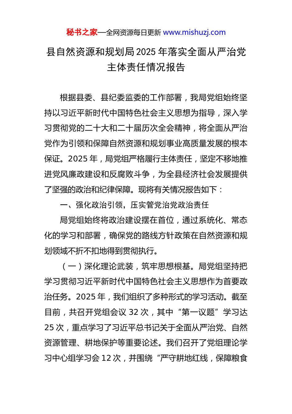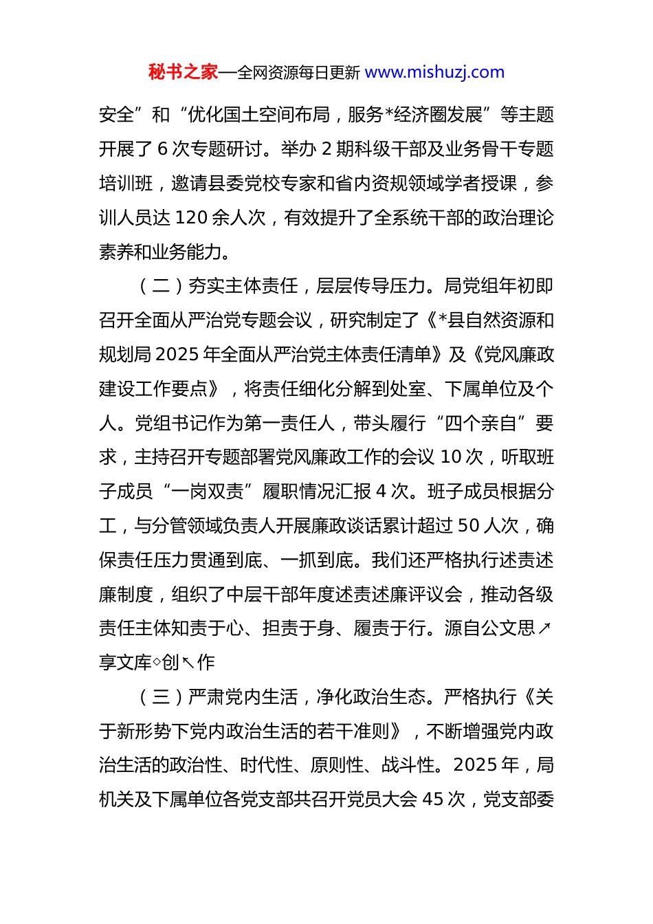 秘书之家—全网资源每日更新 www.mishuzj.com县自然资源和规划局 2025 年落实全面从严治党主体责任情况报告 根据县委、县纪委监委的工作部署,我局党组始终坚持以习近平新时代中国特色社会主义思想为指导,深入学习贯彻党的二十大和二十届历次全会精神,将全面从严治党作为引领和保障自然资源和规划事业高质量发展的根本保证。2025 年,局党组严格履行主体责任,坚定不移地推进党风廉政建设和反腐败斗争,为全县经济社会发展提供了坚强的政治和纪律保障。现将有关情况报告如下:一、强化政治引领,压实管党治党政治责任局党组始终将政治建设摆在首位,通过系统化、常态化的学习和部署,确保党的路线方针政策在自然资源和规划领域不折不扣地得到贯彻执行。(一)深化理论武装,筑牢思想根基。局党组坚持把学习贯彻习近平新时代中国特色社会主义思想作为首要政治任务。2025 年,我们组织了多种形式的学习活动。截至目前,共召开党组会议 32 次,其中“第一议题”学习达25 次,重点学习了习近平总书记关于全面从严治党、自然资源管理、耕地保护等重要论述。我们召开了党组理论学习中心组学习会 12 次,并围绕“严守耕地红线,保障粮食秘书之家—全网资源每日更新 www.mishuzj.com安全”和“优化国土空间布局,服务*经济圈发展”等主题开展了 6 次专题研讨。举办 2 期科级干部及业务骨干专题培训班,邀请县委党校专家和省内资规领域学者授课,参训人员达 120 余人次,有效提升了全系统干部的政治理论素养和业务能力。(二)夯实主体责任,层层传导压力。局党组年初即召开全面从严治党专题会议,研究制定了《*县自然资源和规划局 2025 年全面从严治党主体责任清单》及《党风廉政建设工作要点》,将责任细化分解到处室、下属单位及个人。党组书记作为第一责任人,带头履行“四个亲自”要求,主持召开专题部署党风廉政工作的会议 10 次,听取班子成员“一岗双责”履职情况汇报 4 次。班子成员根据分工,与分管领域负责人开展廉政谈话累计超过 50 人次,确保责任压力贯通到底、一抓到底。我们还严格执行述责述廉制度,组织了中层干部年度述责述廉评议会,推动各级责任主体知责于心、担责于身、履责于行。源自公文思↗享文库◇创↖作(三)严肃党内生活,净化政治生态。严格执行《关于新形势下党内政治生活的若干准则》,不断增强党内政治生活的政治性、时代性、原则性、战斗性。2025 年,局机关及下属单位各党支部共召开党员大会 45 次,党支部委秘书之家—全网资源每日更新 www.mishuzj.com员会会议近 100 次,开展主题党日活动 48 次。局领导班子成员以普通党员身份参加所在支部的组织生活会,带头查摆问题、开展批评与自我批评。各支部均在年初和年中分别召开了专题组织生活会,聚焦政治信仰、党员意识、理论学习、能力本领、作用发挥、纪律作风等 6 个方面,深入查摆问题,班子成员共查摆问题 35 个,班子查摆问题8 个,其中 2 个正在集中整治,其余均已完成整改,确保党内政治生活“熔炉”作用得到充分发挥。二、聚焦主责主业,以严实作风保障重点工作落实局党组坚持把全面从严治党的要求融入自然资源和规划管理的全过程,以铁的纪律保障重大决策部署和重点项目的顺利推进。(一)在服务重大项目中体现担当。2025 年,我县“*新区基础设施建设项目”和“*江流域生态廊道修复工程”两大省级重点项目进入攻坚期。局党组成立项目服务专班,由分管领导一线指挥,纪检干部全程监督。我们严格执行项目用地预审、规划选址、土地报批等环节的廉政风险防控机制,确保审批流程公开透明、高效廉洁。截至11 月底,“*新区基础设施建设项目”一期用地报批已全部完成,为项目按期开工建设提供了有力保障;“*江流域生态廊道修复工程”涉及的 8 个标段已完成规划许可,生秘书之家—全网资源每日更新 www.mishuzj.com态修复面积超过 3000 亩。在项目推进过程中,我们未收到一起关于干部不作为、慢作为或以权谋私的信访举报,实现了“项目高效推进、干部干净干事”的双赢目标。(二)在耕地保护专项行动中检验作风。坚决扛起耕地保护的重大政治责任,2...