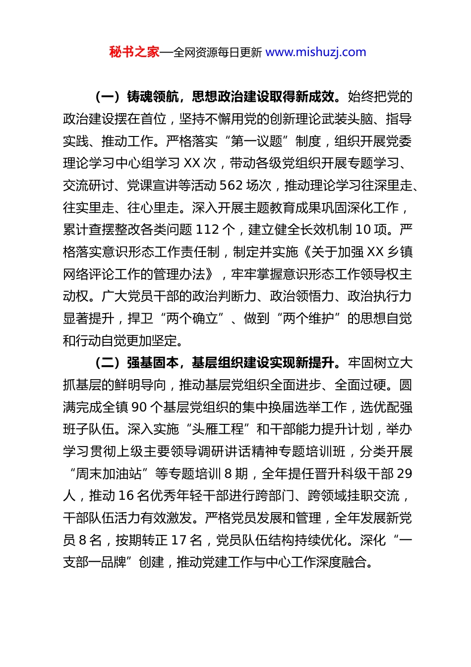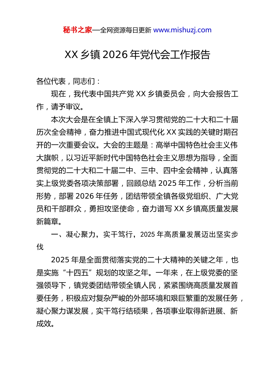 秘书之家—全网资源每日更新 www.mishuzj.comXX 乡镇 2026 年党代会工作报告各位代表,同志们:现在,我代表中国共产党 XX 乡镇委员会,向大会报告工作,请予审议。本次大会是在全镇上下深入学习贯彻党的二十大和二十届历次全会精神,奋力推进中国式现代化 XX 实践的关键时期召开的一次重要会议。大会的主题是:高举中国特色社会主义伟大旗帜,以习近平新时代中国特色社会主义思想为指导,全面贯彻党的二十大和二十届二中、三中、四中全会精神,认真落实上级党委各项决策部署,回顾总结 2025 年工作,分析当前形势,部署 2026 年任务,团结带领全镇各级党组织、广大党员和干部群众,勇担攻坚使命,奋力谱写 XX 乡镇高质量发展新篇章。一、凝心聚力,实干笃行,2025 年高质量发展迈出坚实步伐2025 年是全面贯彻落实党的二十大精神的关键之年,也是实施“十四五”规划的攻坚之年。一年来,在上级党委的坚强领导下,镇党委团结带领全镇人民,紧紧围绕高质量发展首要任务,积极应对复杂严峻的外部环境和艰巨繁重的发展任务,凝心聚力谋发展,实干笃行结硕果,各项事业取得新进展、新成效。秘书之家—全网资源每日更新 www.mishuzj.com(一)铸魂领航,思想政治建设取得新成效。始终把党的政治建设摆在首位,坚持不懈用党的创新理论武装头脑、指导实践、推动工作。严格落实“第一议题”制度,组织开展党委理论学习中心组学习 XX 次,带动各级党组织开展专题学习、交流研讨、党课宣讲等活动 562 场次,推动理论学习往深里走、往实里走、往心里走。深入开展主题教育成果巩固深化工作,累计查摆整改各类问题 112 个,建立健全长效机制 10 项。严格落实意识形态工作责任制,制定并实施《关于加强 XX 乡镇网络评论工作的管理办法》,牢牢掌握意识形态工作领导权主动权。广大党员干部的政治判断力、政治领悟力、政治执行力显著提升,捍卫“两个确立”、做到“两个维护”的思想自觉和行动自觉更加坚定。(二)强基固本,基层组织建设实现新提升。牢固树立大抓基层的鲜明导向,推动基层党组织全面进步、全面过硬。圆满完成全镇 90 个基层党组织的集中换届选举工作,选优配强班子队伍。深入实施“头雁工程”和干部能力提升计划,举办学习贯彻上级主要领导调研讲话精神专题培训班,分类开展“周末加油站”等专题培训 8 期,全年提任晋升科级干部 29人,推动 16 名优秀年轻干部进行跨部门、跨领域挂职交流,干部队伍活力有效激发。严格党员发展和管理,全年发展新党员 8 名,按期转正 17 名,党员队伍结构持续优化。深化“一支部一品牌”创建,推动党建工作与中心工作深度融合。秘书之家—全网资源每日更新 www.mishuzj.com(三)正风肃纪,全面从严治党展现新作为。坚决扛起管党治党政治责任,纵深推进党风廉政建设和反腐败斗争。高质量完成上级巡察反馈意见整改,落实整改措施 231 条,修订完善制度机制 10 项,做好巡察“后半篇文章”。精准运用监督执纪“四种形态”,依规依纪依法给予党纪政务处分 14 人,开展诫勉谈话、提醒谈话 10 人次,抓早抓小、防微杜渐。坚持严管和厚爱结合、激励和约束并重,认真落实“三个区分开来”要求,为 2 名在改革探索、推动发展中出于公心、担当作为而出现工作失误的干部予以容错免责,旗帜鲜明地为敢于担当、踏实做事的干部撑腰鼓劲,营造了风清气正、干事创业的良好政治生态。(四)践行民主,全过程人民民主彰显新效能。坚持党的领导、人民当家作主、依法治国有机统一,不断丰富民主形式,拓宽民主渠道。打造“石榴籽 e 家”等特色品牌,促进民族团结,联动高校开展“名企探岗”等活动,助力青年就业。高质量完成武装部规范化建设,成功创建三星级基层武装部,全年选送 2 名优秀青年光荣入伍。工会、共青团、妇联等群团组织桥梁纽带作用充分发挥,常态化开展“四季关爱”、职工劳动技能竞赛等活动,完成四个街区妇联组建及“活水园区”妇女组织覆盖工作,最广泛地凝聚了社会各界共识和力量。(五)聚焦发展,经济综合实力迈上新台阶。坚持发展是第一要务,全力稳增长、促转型,经济运行稳中有进、持...