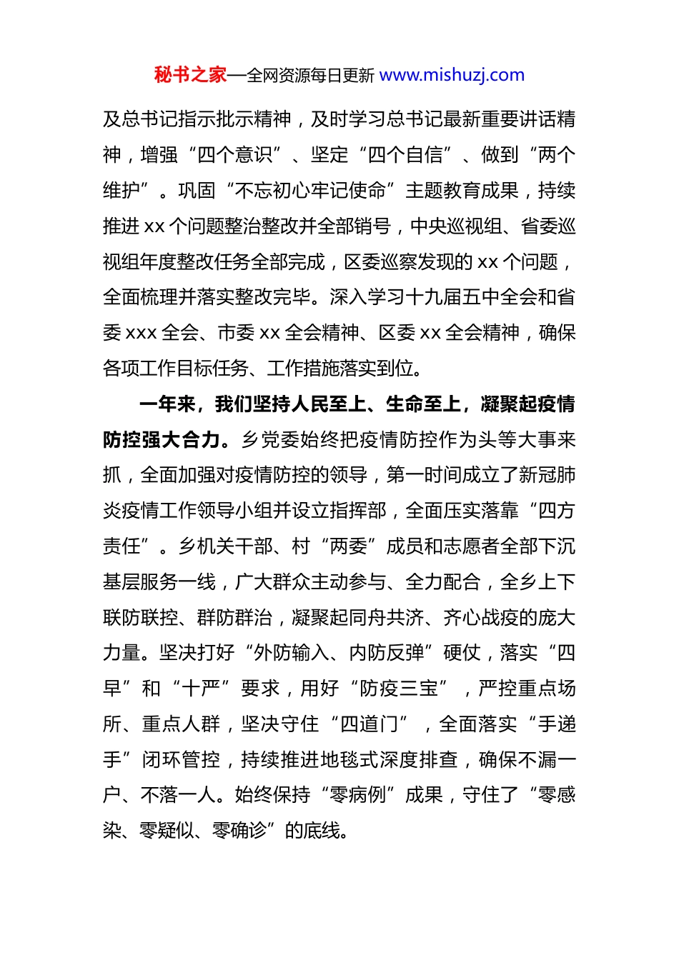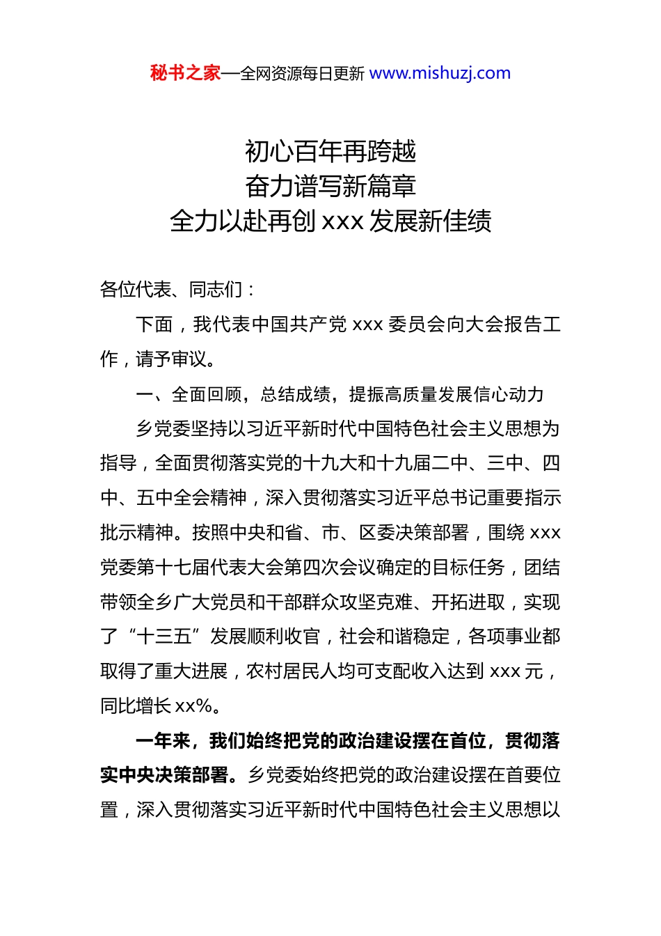 秘书之家—全网资源每日更新 www.mishuzj.com初心百年再跨越奋力谱写新篇章全力以赴再创 xxx 发展新佳绩各位代表、同志们:下面,我代表中国共产党 xxx 委员会向大会报告工作,请予审议。一、全面回顾,总结成绩,提振高质量发展信心动力乡党委坚持以习近平新时代中国特色社会主义思想为指导,全面贯彻落实党的十九大和十九届二中、三中、四中、五中全会精神,深入贯彻落实习近平总书记重要指示批示精神。按照中央和省、市、区委决策部署,围绕 xxx党委第十七届代表大会第四次会议确定的目标任务,团结带领全乡广大党员和干部群众攻坚克难、开拓进取,实现了“十三五”发展顺利收官,社会和谐稳定,各项事业都取得了重大进展,农村居民人均可支配收入达到 xxx 元,同比增长 xx%。一年来,我们始终把党的政治建设摆在首位,贯彻落实中央决策部署。乡党委始终把党的政治建设摆在首要位置,深入贯彻落实习近平新时代中国特色社会主义思想以秘书之家—全网资源每日更新 www.mishuzj.com及总书记指示批示精神,及时学习总书记最新重要讲话精神,增强“四个意识”、坚定“四个自信”、做到“两个维护”。巩固“不忘初心牢记使命”主题教育成果,持续推进 xx 个问题整治整改并全部销号,中央巡视组、省委巡视组年度整改任务全部完成,区委巡察发现的 xx 个问题,全面梳理并落实整改完毕。深入学习十九届五中全会和省委 xxx 全会、市委 xx 全会精神、区委 xx 全会精神,确保各项工作目标任务、工作措施落实到位。一年来,我们坚持人民至上、生命至上,凝聚起疫情防控强大合力。乡党委始终把疫情防控作为头等大事来抓,全面加强对疫情防控的领导,第一时间成立了新冠肺炎疫情工作领导小组并设立指挥部,全面压实落靠“四方责任”。乡机关干部、村“两委”成员和志愿者全部下沉基层服务一线,广大群众主动参与、全力配合,全乡上下联防联控、群防群治,凝聚起同舟共济、齐心战疫的庞大力量。坚决打好“外防输入、内防反弹”硬仗,落实“四早”和“十严”要求,用好“防疫三宝”,严控重点场所、重点人群,坚决守住“四道门”,全面落实“手递手”闭环管控,持续推进地毯式深度排查,确保不漏一户、不落一人。始终保持“零病例”成果,守住了“零感染、零疑似、零确诊”的底线。秘书之家—全网资源每日更新 www.mishuzj.com一年来,我们全力推动高质量发展,农业农村经济发展水平稳步提升。乡党委主动应对疫情冲击,全力抓好农业生产,发展优质高效生态农业。xx 村“棚室”种植蔬菜年产 xx 余吨,年产 xx 万余吨。推进 xx 村为主体的优质米基地建设,带动村民加入到水稻种子繁育项目,鼓励村民与水稻研究所签订合约 xxx 亩。落实水稻和玉米减肥、减药、减除草剂“三减”面积 xxx 余亩。稳定畜牧业生产安全。畜牧站通过春秋两季集中免疫和平时补免相结合,禽畜免疫率达到 xxx%以上,全年实施产地检疫生猪 xxx头、牛 xx 头、羊 xxx 只,定期进行“瘦肉精检测,确保畜牧业生产质量安全”。农机站为农机户检证、检修机车xxx 台套,安装大型农机作业监测仪 xx 台,办理农机补贴xx 台,发放补贴 xx 万元。大力推进“清化收”工作,清理违规合同 xx 份,化解债务 xxx 万元,新增地源面积 xxx亩、收费 xxx 万元。大力发展村集体经济,xx 村 xxx 项目为村集体年增收 xx 万元,相关经验被编入《xxx 市发展壮大村集体经济案例选编》。一年来,我们固底板补弱项,打好决胜全面小康三大攻坚战。为彻底巩固脱贫成果,建立长线帮扶巩固机制,制订了《xxx 返贫检测工作方案》,切实做到了“四个不秘书之家—全网资源每日更新 www.mishuzj.com摘”。通过公益性岗位、种养植产业、小额贷款等方式,实现了产业经营性收入、务工就业工资性收入提高,依靠政策转移性收入相对减少,内生动力不断得到激发。乡建档立卡户人均收入逐年提升,2020 年建档立卡户人均收入达到 xx 万元,近三年保持增长 xx%以上。扶贫领域问题和整改全部销号清零,防止返贫机制和帮扶机制全面落实,高质量通过了省、市、区验收。全面提升防范化解重大风险的能力,面对 x ...