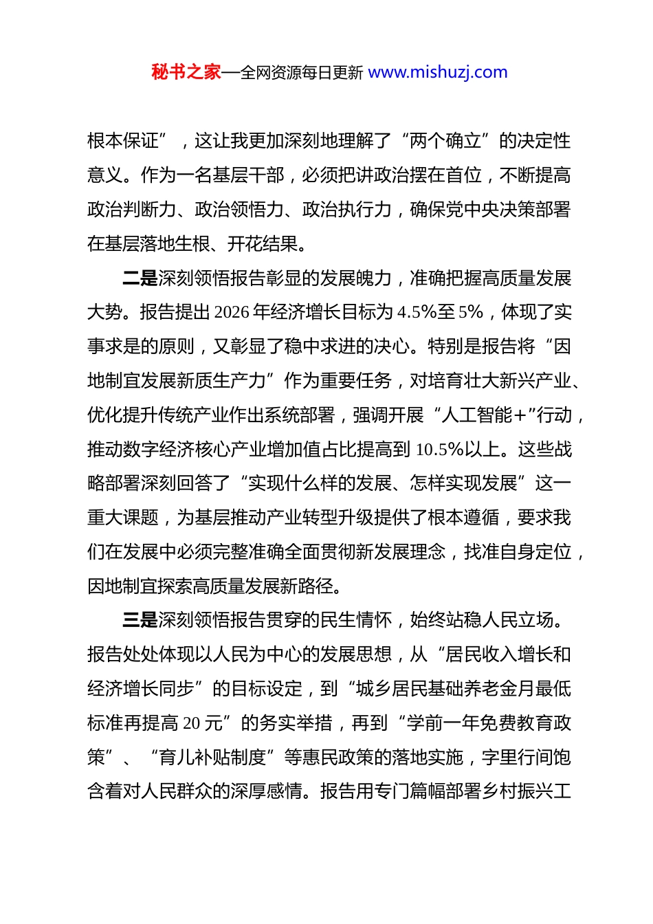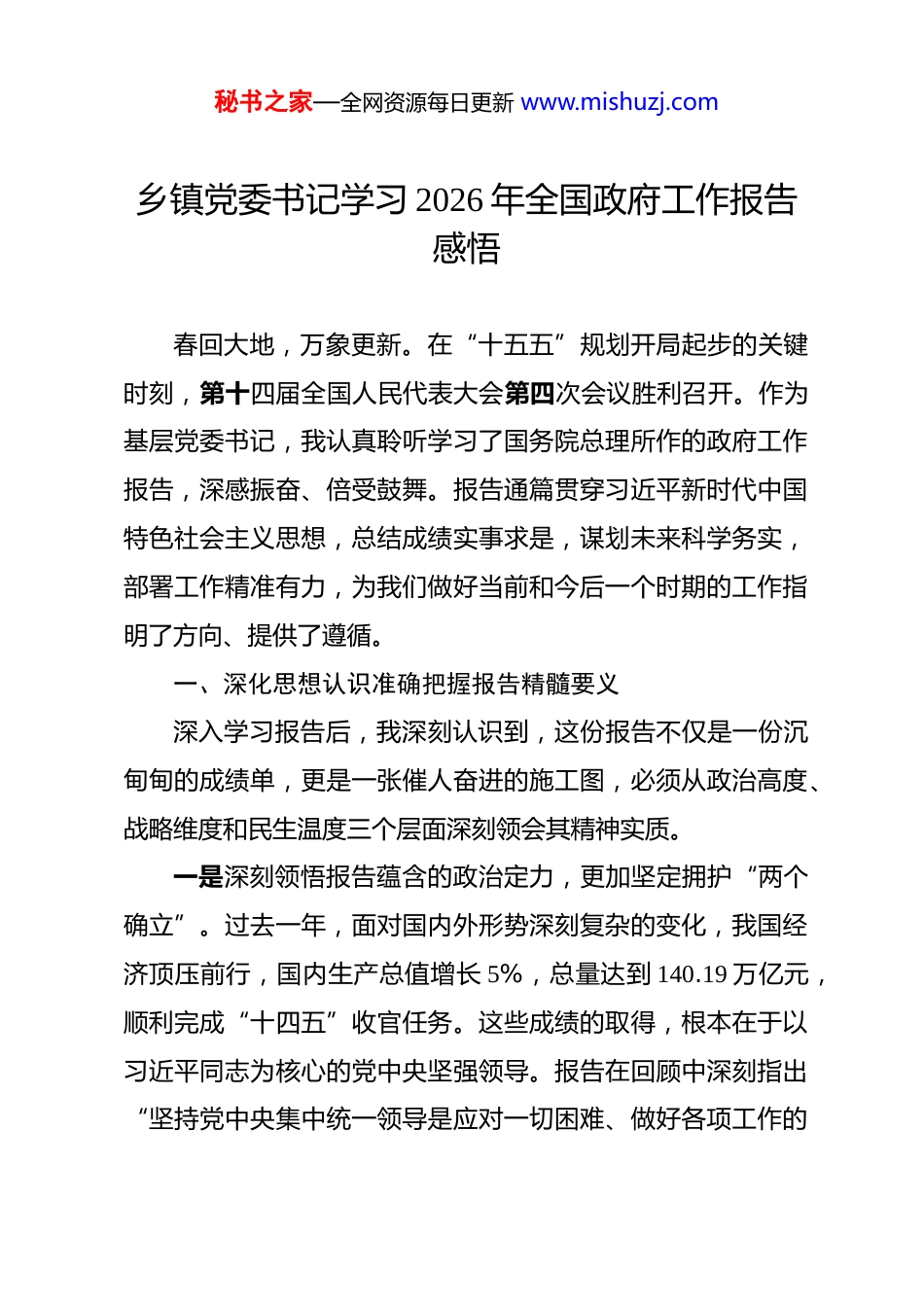 秘书之家—全网资源每日更新 www.mishuzj.com乡镇党委书记学习 2026 年全国政府工作报告感悟 春回大地,万象更新。在“十五五”规划开局起步的关键时刻,第十四届全国人民代表大会第四次会议胜利召开。作为基层党委书记,我认真聆听学习了国务院总理所作的政府工作报告,深感振奋、倍受鼓舞。报告通篇贯穿习近平新时代中国特色社会主义思想,总结成绩实事求是,谋划未来科学务实,部署工作精准有力,为我们做好当前和今后一个时期的工作指明了方向、提供了遵循。一、深化思想认识准确把握报告精髓要义深入学习报告后,我深刻认识到,这份报告不仅是一份沉甸甸的成绩单,更是一张催人奋进的施工图,必须从政治高度、战略维度和民生温度三个层面深刻领会其精神实质。一是深刻领悟报告蕴含的政治定力,更加坚定拥护“两个确立”。过去一年,面对国内外形势深刻复杂的变化,我国经济顶压前行,国内生产总值增长 5%,总量达到 140.19 万亿元,顺利完成“十四五”收官任务。这些成绩的取得,根本在于以习近平同志为核心的党中央坚强领导。报告在回顾中深刻指出“坚持党中央集中统一领导是应对一切困难、做好各项工作的秘书之家—全网资源每日更新 www.mishuzj.com根本保证”,这让我更加深刻地理解了“两个确立”的决定性意义。作为一名基层干部,必须把讲政治摆在首位,不断提高政治判断力、政治领悟力、政治执行力,确保党中央决策部署在基层落地生根、开花结果。二是深刻领悟报告彰显的发展魄力,准确把握高质量发展大势。报告提出 2026 年经济增长目标为 4.5%至 5%,体现了实事求是的原则,又彰显了稳中求进的决心。特别是报告将“因地制宜发展新质生产力”作为重要任务,对培育壮大新兴产业、优化提升传统产业作出系统部署,强调开展“人工智能+”行动,推动数字经济核心产业增加值占比提高到 10.5%以上。这些战略部署深刻回答了“实现什么样的发展、怎样实现发展”这一重大课题,为基层推动产业转型升级提供了根本遵循,要求我们在发展中必须完整准确全面贯彻新发展理念,找准自身定位,因地制宜探索高质量发展新路径。三是深刻领悟报告贯穿的民生情怀,始终站稳人民立场。报告处处体现以人民为中心的发展思想,从“居民收入增长和经济增长同步”的目标设定,到“城乡居民基础养老金月最低标准再提高 20 元”的务实举措,再到“学前一年免费教育政策”、“育儿补贴制度”等惠民政策的落地实施,字里行间饱含着对人民群众的深厚感情。报告用专门篇幅部署乡村振兴工秘书之家—全网资源每日更新 www.mishuzj.com作,强调“毫不放松抓好粮食生产”,粮食产量目标设定在 1.4万亿斤左右,并明确提出“完善联农带农机制,促进农民稳定增收”。这要求基层干部必须时刻把群众冷暖放在心上,把增进民生福祉作为一切工作的出发点和落脚点,用心用情用力解决好群众急难愁盼问题。二、坚持深学细悟迅速掀起学习贯彻热潮报告内容丰富、内涵深刻,必须把学习贯彻作为当前首要政治任务,以高度的政治自觉、思想自觉和行动自觉,推动报告精神入脑入心、走深走实。一是突出系统性,做到原原本本学。报告涵盖了经济、政治、文化、社会、生态等方方面面,既有宏观战略部署,又有具体政策措施。必须坚持读原著、学原文、悟原理,逐字逐句研读报告全文,特别是对“十五五”时期主要目标和重大任务、2026 年经济社会发展总体要求和政策取向等重点章节,要反复学习、深入领会。要结合学习党的二十届三中全会和四中全会精神,将报告学习融入习近平新时代中国特色社会主义思想理论体系,准确把握其理论逻辑、历史逻辑和实践逻辑,切实做到知其然更知其所以然。二是突出针对性,做到联系实际学。学习的目的在于运用。作为乡镇一级,必须紧密结合基层实际,找准学习的切入点和秘书之家—全网资源每日更新 www.mishuzj.com着力点。报告中关于“扎实推进乡村全面振兴”的部署,包括稳定粮油生产、巩固拓展脱贫攻坚成果、推进农村改革发展等内容,直接关系到基层工作的方方面面。要对照报告提出的目标任务,深入思考乡镇在粮食安全、产业发展、乡村建设、基层治理等方面的短板弱项,研究制定贯...