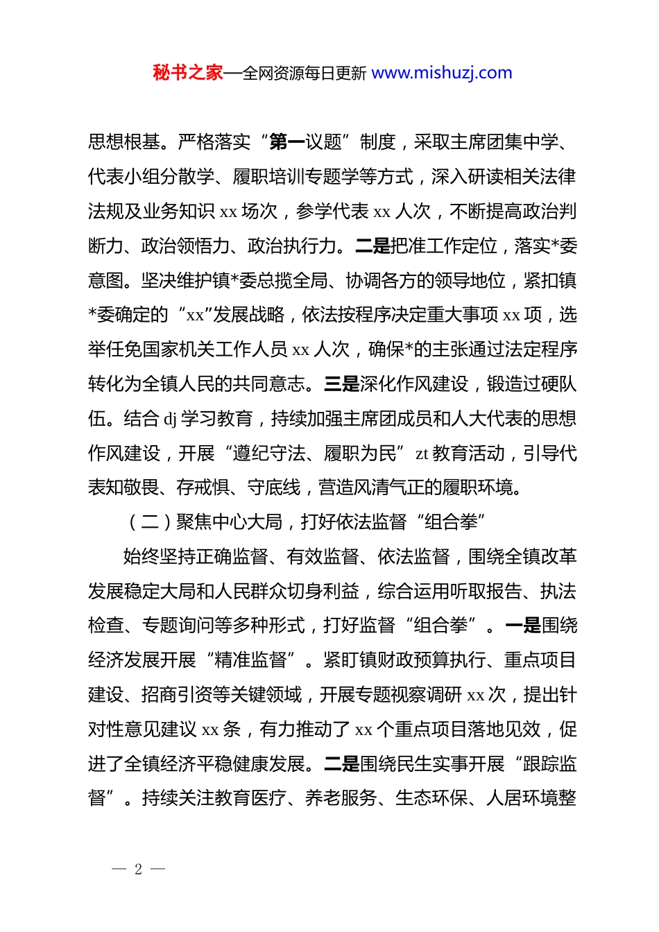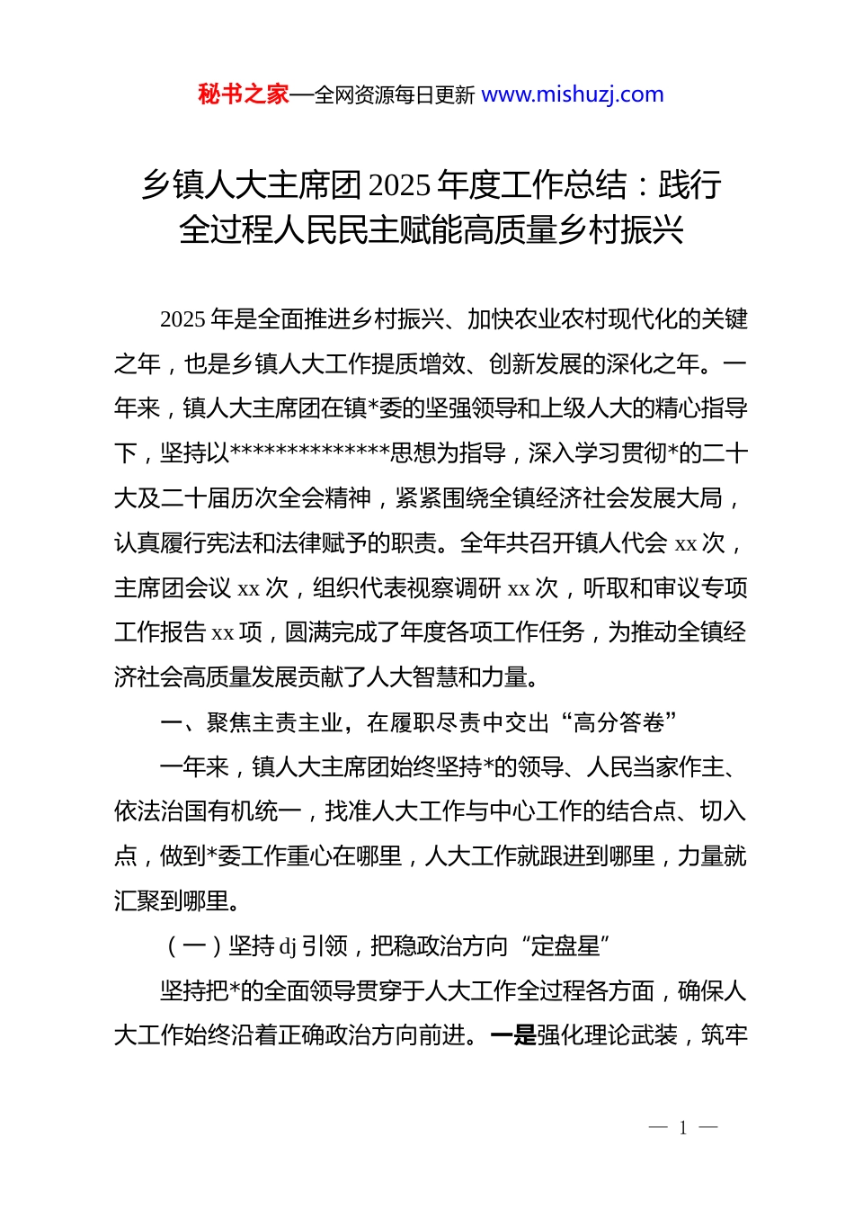 秘书之家—全网资源每日更新 www.mishuzj.com乡镇人大主席团 2025 年度工作总结:践行全过程人民民主赋能高质量乡村振兴2025 年是全面推进乡村振兴、加快农业农村现代化的关键之年,也是乡镇人大工作提质增效、创新发展的深化之年。一年来,镇人大主席团在镇*委的坚强领导和上级人大的精心指导下,坚持以**************思想为指导,深入学习贯彻*的二十大及二十届历次全会精神,紧紧围绕全镇经济社会发展大局,认真履行宪法和法律赋予的职责。全年共召开镇人代会 xx 次,主席团会议 xx 次,组织代表视察调研 xx 次,听取和审议专项工作报告 xx 项,圆满完成了年度各项工作任务,为推动全镇经济社会高质量发展贡献了人大智慧和力量。一、聚焦主责主业,在履职尽责中交出“高分答卷”一年来,镇人大主席团始终坚持*的领导、人民当家作主、依法治国有机统一,找准人大工作与中心工作的结合点、切入点,做到*委工作重心在哪里,人大工作就跟进到哪里,力量就汇聚到哪里。(一)坚持 dj 引领,把稳政治方向“定盘星”坚持把*的全面领导贯穿于人大工作全过程各方面,确保人大工作始终沿着正确政治方向前进。一是强化理论武装,筑牢— 1 —秘书之家—全网资源每日更新 www.mishuzj.com思想根基。严格落实“第一议题”制度,采取主席团集中学、代表小组分散学、履职培训专题学等方式,深入研读相关法律法规及业务知识 xx 场次,参学代表 xx 人次,不断提高政治判断力、政治领悟力、政治执行力。二是把准工作定位,落实*委意图。坚决维护镇*委总揽全局、协调各方的领导地位,紧扣镇*委确定的“xx”发展战略,依法按程序决定重大事项 xx 项,选举任免国家机关工作人员 xx 人次,确保*的主张通过法定程序转化为全镇人民的共同意志。三是深化作风建设,锻造过硬队伍。结合 dj 学习教育,持续加强主席团成员和人大代表的思想作风建设,开展“遵纪守法、履职为民”zt 教育活动,引导代表知敬畏、存戒惧、守底线,营造风清气正的履职环境。(二)聚焦中心大局,打好依法监督“组合拳”始终坚持正确监督、有效监督、依法监督,围绕全镇改革发展稳定大局和人民群众切身利益,综合运用听取报告、执法检查、专题询问等多种形式,打好监督“组合拳”。一是围绕经济发展开展“精准监督”。紧盯镇财政预算执行、重点项目建设、招商引资等关键领域,开展专题视察调研 xx 次,提出针对性意见建议 xx 条,有力推动了 xx 个重点项目落地见效,促进了全镇经济平稳健康发展。二是围绕民生实事开展“跟踪监督”。持续关注教育医疗、养老服务、生态环保、人居环境整— 2 —秘书之家—全网资源每日更新 www.mishuzj.com治等民生热点难点问题,对 xx 件民生实事项目实施情况进行全过程跟踪监督,推行“季督查、半年报、年终评”工作机制,确保民生工程真正成为民心工程。三是围绕法治建设开展“法律监督”。积极配合上级人大开展相关法律法规执法检查,组织代表旁听法庭庭审 xx 次,督促政府及有关部门严格依法行政、公正司法,推动法治政府建设迈上新台阶。(三)践行根本宗旨,架起为民服务“连心桥”始终把人民放在心中最高位置,丰富人大代表联系人民群众的内容和形式,拓宽社情民意反映渠道,支持和保障代表更好依法履职。一是建好履职平台,延伸服务触角。按照“六有”标准,提档升级人大代表联络站 xx 个,新建村级联络点 xx个,构建起“镇—村—组”三级联络网络,实现了代表进站全覆盖、联系群众全天候。二是深化主题活动,激发代表活力。深入开展“我为群众办实事”、“代表进网格”等主题实践活动,组织 xx 名市镇两级人大代表下沉到 xx 个网格,开展走访慰问、矛盾调解、政策宣传等服务 xx 次,收集群众意见建议 xx条,帮助解决实际困难 xx 件。三是注重建议办理,回应群众关切。完善代表建议“提出、交办、督办、反馈”闭环管理机制,对人代会期间收到的 xx 件建议和闭会期间收集的 xx 条意见,实行清单化管理、销号式落实,建议办结率达 100%,满意率— 3 —秘书之家—全网资源每日更新 www.mishuzj.com达 xx%,切实解决了一批群众急...