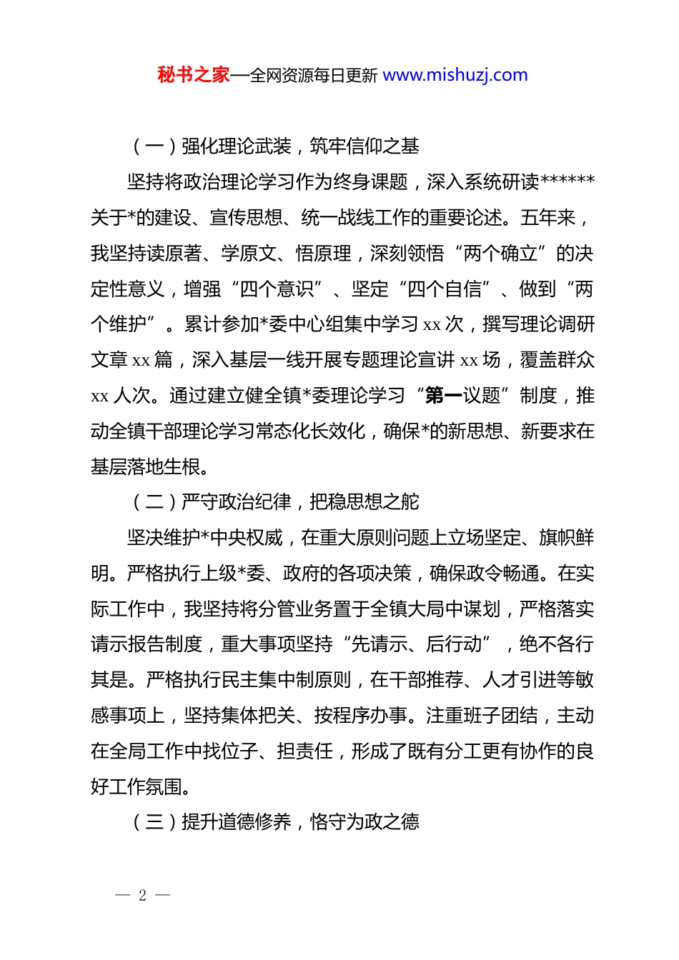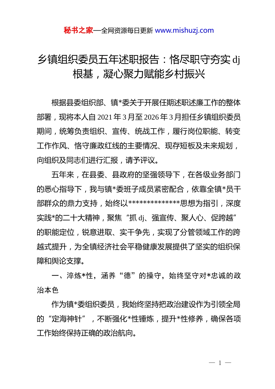 秘书之家—全网资源每日更新 www.mishuzj.com乡镇组织委员五年述职报告:恪尽职守夯实 dj根基,凝心聚力赋能乡村振兴根据县委组织部、镇*委关于开展任期述职述廉工作的整体部署,现将本人自 2021 年 3 月至 2026 年 3 月担任乡镇组织委员期间,统筹负责组织、宣传、统战工作,履行岗位职能、转变工作作风、恪守廉政红线的主要情况、现存短板及未来规划,向组织及同志们进行汇报,请予评议。五年来,在县委、县政府的坚强领导下,在各级业务部门的悉心指导下,我与镇*委班子成员紧密配合,依靠全镇*员干部群众的鼎力支持,始终以**************思想为指引,深度实践*的二十大精神,聚焦“抓 dj、强宣传、聚人心、促跨越”的职能定位,锐意进取、实干争先,实现了分管领域工作的跨越式提升,为全镇经济社会平稳健康发展提供了坚实的组织保障和舆论支撑。一、淬炼*性,涵养“德”的操守,始终坚守对*忠诚的政治本色作为镇*委组织委员,我始终坚持把政治建设作为引领全局的“定海神针”,不断强化*性锤炼,提升*性修养,确保各项工作始终保持正确的政治航向。— 1 —秘书之家—全网资源每日更新 www.mishuzj.com(一)强化理论武装,筑牢信仰之基坚持将政治理论学习作为终身课题,深入系统研读******关于*的建设、宣传思想、统一战线工作的重要论述。五年来,我坚持读原著、学原文、悟原理,深刻领悟“两个确立”的决定性意义,增强“四个意识”、坚定“四个自信”、做到“两个维护”。累计参加*委中心组集中学习 xx 次,撰写理论调研文章 xx 篇,深入基层一线开展专题理论宣讲 xx 场,覆盖群众xx 人次。通过建立健全镇*委理论学习“第一议题”制度,推动全镇干部理论学习常态化长效化,确保*的新思想、新要求在基层落地生根。(二)严守政治纪律,把稳思想之舵坚决维护*中央权威,在重大原则问题上立场坚定、旗帜鲜明。严格执行上级*委、政府的各项决策,确保政令畅通。在实际工作中,我坚持将分管业务置于全镇大局中谋划,严格落实请示报告制度,重大事项坚持“先请示、后行动”,绝不各行其是。严格执行民主集中制原则,在干部推荐、人才引进等敏感事项上,坚持集体把关、按程序办事。注重班子团结,主动在全局工作中找位子、担责任,形成了既有分工更有协作的良好工作氛围。(三)提升道德修养,恪守为政之德— 2 —秘书之家—全网资源每日更新 www.mishuzj.com大力弘扬社会主义核心价值观,保持健康向上的生活情趣做到慎独慎微。在处理公权力时,坚持秉公办事、不徇私情。工作中力戒虚功、务求实效,带头抵制形式主义。我注重从先进典型中汲取精神力量,时刻警醒自己保持共产*人的高尚操守。同时,严于律己、严管家人,持续净化个人社交圈与生活圈,以良好的个人形象赢得广大干部群众的信任。二、精进笃行,提升“能”的素养,不断增强履职尽责的过硬本领面对新时代基层工作的新考验,我始终坚持干中学、学中干,不断丰富知识储备,全面提升统筹调度、攻坚硬仗的专业能力。(一)着力提升统筹协调能力组织、宣传、统战工作点多面广,我坚持“一盘棋”考量在基层 dj 中,联动各村社力量,破解阵地薄弱难题;在宣传工作中,融合文化、教育、群团资源,构建“大宣传”格局;在统战领域,广泛联络非公经济人士与*外代表,汇聚发展合力。我积极对接上级部门争取政策支持,加强与周边乡镇的互联互通,通过资源整合与统筹兼顾,实现了各项工作齐头并进。(二)着力提升政策执行能力坚持把吃透上级精神与摸清基层实情相结合,推动政策精— 3 —秘书之家—全网资源每日更新 www.mishuzj.com准落地。在执行新时代*的组织路线中,我严格按照《干部任用条例》和*员发展规范办事。五年来,全镇共严把关口接收预备*员 xx 名,*员队伍质量显著提升。在意识形态工作中,严格落实责任制,确保主旋律在基层唱响。在统战政策落实上,依法规范**事务管理,有效凝聚社会各界共识,确保各项政策不走样、见实效。(三)着力提升攻坚克难能力面对基层治理中的顽瘴痼疾,我敢于动真碰硬。针对部分村级*组织战斗力不强的问题,我牵头实施了“软弱涣散*组织集中清零行动”,通...