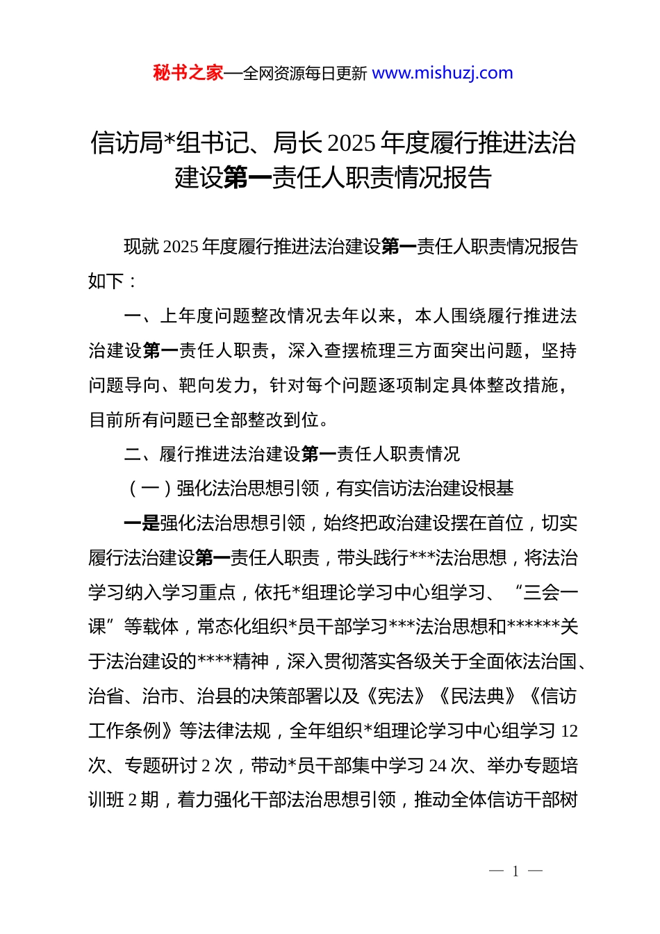 秘书之家—全网资源每日更新 www.mishuzj.com信访局*组书记、局长 2025 年度履行推进法治建设第一责任人职责情况报告现就 2025 年度履行推进法治建设第一责任人职责情况报告如下:一、上年度问题整改情况去年以来,本人围绕履行推进法治建设第一责任人职责,深入查摆梳理三方面突出问题,坚持问题导向、靶向发力,针对每个问题逐项制定具体整改措施,目前所有问题已全部整改到位。二、履行推进法治建设第一责任人职责情况(一)强化法治思想引领,有实信访法治建设根基一是强化法治思想引领,始终把政治建设摆在首位,切实履行法治建设第一责任人职责,带头践行***法治思想,将法治学习纳入学习重点,依托*组理论学习中心组学习、“三会一课”等载体,常态化组织*员干部学习***法治思想和******关于法治建设的****精神,深入贯彻落实各级关于全面依法治国、治省、治市、治县的决策部署以及《宪法》《民法典》《信访工作条例》等法律法规,全年组织*组理论学习中心组学习 12次、专题研讨 2 次,带动*员干部集中学习 24 次、举办专题培训班 2 期,着力强化干部法治思想引领,推动全体信访干部树— 1 —秘书之家—全网资源每日更新 www.mishuzj.com牢法治思维、提升依法履职能力。二是抓实法治培训实践。积极组织干部参加国家、省、市、县各级信访工作法治化专题培训 7 次,覆盖县、乡(镇)各级170 余名信访业务工作人员,精准破解基层信访工作难点堵点,推动学习成果转化为破解信访难题、推动工作落实的实际举措,不断夯实信访法治建设思想和能力根基。(二)聚焦信访主责主业、抓实“五个法治化”建设坚持以身作则、率先垂范,自觉践行依法用权、秉公用权要求,以“五个法治化”为抓手,将法治思维贯穿信访工作全过程,推动信访工作提质增效。一是预防法治化,健全矛盾纠纷排查预警机制,常态化开展矛盾纠纷排查化解工作。充分发挥“夕阳红”“板凳队”“瓘罐茶”等特色调解模式优势,依托基层力量精准化解各类苗头性、倾向性矛盾问题、提前介入、精准化解、从源头上遇制信访增量。二是受理法治化。严格落实信访工作法治化“路线图”,全面规范信访受理全流程,明确受理范围、登记标准、办理时限和流转程序,细化受理环节的操作规范和责任分工,对群众通过来访、来信、网上信访等各类渠道反映的诉求,坚持“有诉必接、有访必登”原则,做到应接尽接、分类精准登记,坚— 2 —秘书之家—全网资源每日更新 www.mishuzj.com决杜绝推诿扯皮、敷衍塞责、拖延受理等现象。三是办理法治化。规范办理流程,明确办理环节、办理时限和责任人员,规范答复文书制作,答复内容必须事实清楚、依据充分、表述规范、意见明确,明确告知当事人办理结果、法律依据以及不服办理结果的救济途径和时限。坚持实事求是、依法依规处置,确保每一项诉求都能依法办结、处置恰当、有理有据,切实提升群众对信访办理结果的认可度和满意度。四是监督追责法治化。健全完善信访事项办理监督检查机制,对信访事项受理、办理、答复、反馈等各个环节进行常态化监督。及时发现和纠正办理过程中存在的问题。严格履行信访工作“三项建议”,对信访工作中发现的履职不力、作风不实等问题,及时向相关部门提出改进建议,层层压实工作责任。五是维护秩序法治化。积极引导群众依法理性表达诉求,依法规范处置缠访闹访信访行为。在县信访接待大厅设立警务室,由县公安局选派 6 名干警长期驻点履职,依法规范信访秩序。切实维护正常信访秩序和社会和谐稳定。”(三)深化法治普法宣传,凝聚信访治理法治合力一是丰富宣传载体。在信访接待场所张贴依法信访指引,印制发放宣传品 200 余份,解答群众咨询 800 余人次,多渠道拓寬普法覆盖面、提升宣传实效性深— 3 —秘书之家—全网资源每日更新 www.mishuzj.com二是坚持普法与信访实践深度融合。将法治宣传融入信访事项受理、办理全过程,在化解矛盾、解答咨询中传递法治理念,引导群众依法理性表达诉求,推动形成“办事依法、遇事找法”的良好氛围。三、存在的问题一是理论武装不扎实,学习机制不完善。学法形式较为单一,多以集中领学为主,缺乏...