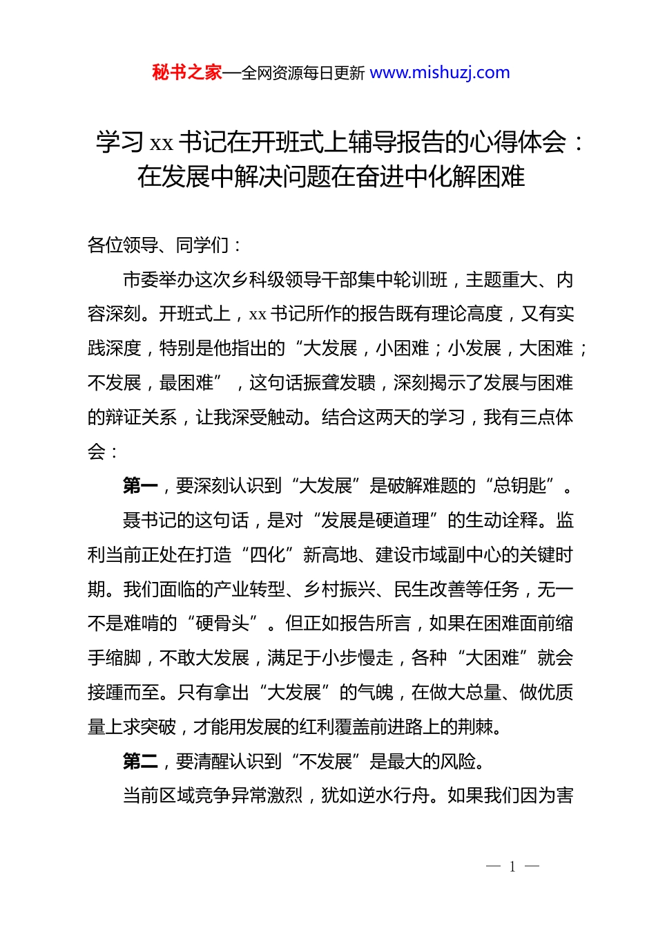 秘书之家—全网资源每日更新 www.mishuzj.com学习 xx 书记在开班式上辅导报告的心得体会:在发展中解决问题在奋进中化解困难各位领导、同学们:市委举办这次乡科级领导干部集中轮训班,主题重大、内容深刻。开班式上,xx 书记所作的报告既有理论高度,又有实践深度,特别是他指出的“大发展,小困难;小发展,大困难;不发展,最困难”,这句话振聋发聩,深刻揭示了发展与困难的辩证关系,让我深受触动。结合这两天的学习,我有三点体会:第一,要深刻认识到“大发展”是破解难题的“总钥匙”。聂书记的这句话,是对“发展是硬道理”的生动诠释。监利当前正处在打造“四化”新高地、建设市域副中心的关键时期。我们面临的产业转型、乡村振兴、民生改善等任务,无一不是难啃的“硬骨头”。但正如报告所言,如果在困难面前缩手缩脚,不敢大发展,满足于小步慢走,各种“大困难”就会接踵而至。只有拿出“大发展”的气魄,在做大总量、做优质量上求突破,才能用发展的红利覆盖前进路上的荆棘。第二,要清醒认识到“不发展”是最大的风险。当前区域竞争异常激烈,犹如逆水行舟。如果我们因为害— 1 —秘书之家—全网资源每日更新 www.mishuzj.com怕风险、畏惧矛盾而选择“躺平”,或者搞“为了不出事、宁可不干事”的“佛系”心态,那么现在的小问题就会积累成未来的大难题,最终错失良机,陷入“最困难”的境地。聂书记强调要“强化担当作为”,就是告诫我们必须时刻保持忧患意识,绝不能以规避矛盾为借口来“挤”发展。第三,要自觉践行“实干”要求,将“起势”转化为“胜势”。道理千万条,落实第一条。作为乡科级干部,我们是执行落地的“腰部”力量。在接下来的工作中,我将把这次轮训班的精神带回去,紧紧围绕市委确定的产业发展、交通赋能、民生提质等中心工作,把“规划图”变成“施工图”,主动到项目建设的一线、矛盾调解的前沿去磨炼,用实打实的业绩检验学习成效,为监利高质量发展贡献自己的力量。— 2 —