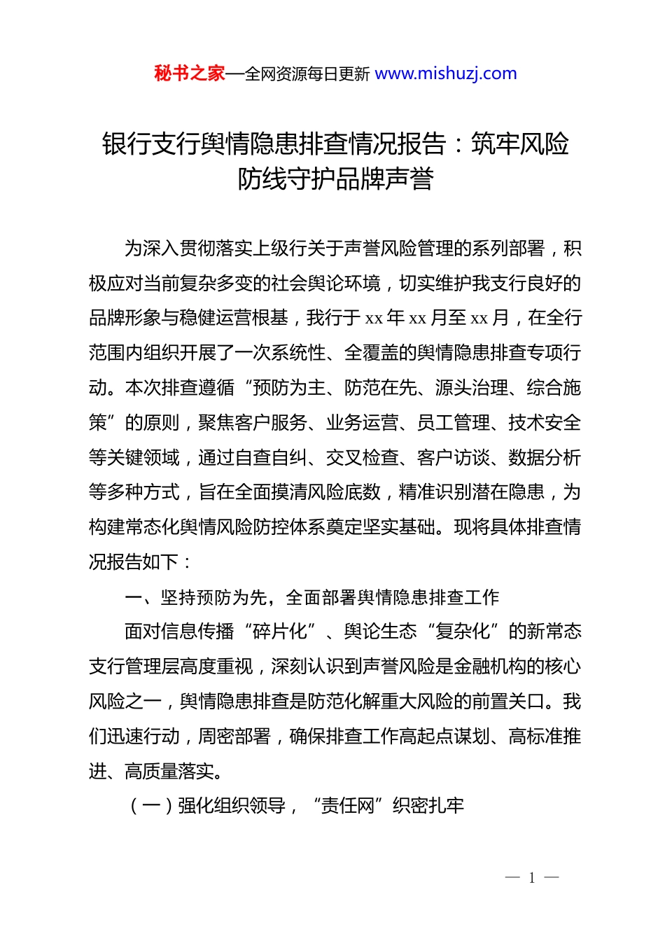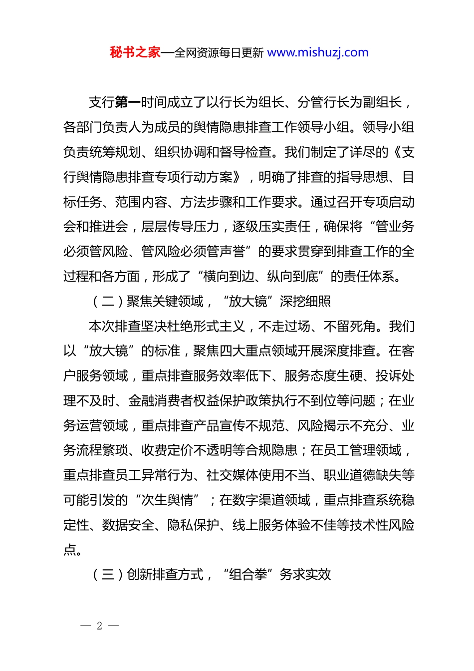 秘书之家—全网资源每日更新 www.mishuzj.com银行支行舆情隐患排查情况报告:筑牢风险防线守护品牌声誉为深入贯彻落实上级行关于声誉风险管理的系列部署,积极应对当前复杂多变的社会舆论环境,切实维护我支行良好的品牌形象与稳健运营根基,我行于 xx 年 xx 月至 xx 月,在全行范围内组织开展了一次系统性、全覆盖的舆情隐患排查专项行动。本次排查遵循“预防为主、防范在先、源头治理、综合施策”的原则,聚焦客户服务、业务运营、员工管理、技术安全等关键领域,通过自查自纠、交叉检查、客户访谈、数据分析等多种方式,旨在全面摸清风险底数,精准识别潜在隐患,为构建常态化舆情风险防控体系奠定坚实基础。现将具体排查情况报告如下:一、坚持预防为先,全面部署舆情隐患排查工作面对信息传播“碎片化”、舆论生态“复杂化”的新常态支行管理层高度重视,深刻认识到声誉风险是金融机构的核心风险之一,舆情隐患排查是防范化解重大风险的前置关口。我们迅速行动,周密部署,确保排查工作高起点谋划、高标准推进、高质量落实。(一)强化组织领导,“责任网”织密扎牢— 1 —秘书之家—全网资源每日更新 www.mishuzj.com支行第一时间成立了以行长为组长、分管行长为副组长,各部门负责人为成员的舆情隐患排查工作领导小组。领导小组负责统筹规划、组织协调和督导检查。我们制定了详尽的《支行舆情隐患排查专项行动方案》,明确了排查的指导思想、目标任务、范围内容、方法步骤和工作要求。通过召开专项启动会和推进会,层层传导压力,逐级压实责任,确保将“管业务必须管风险、管风险必须管声誉”的要求贯穿到排查工作的全过程和各方面,形成了“横向到边、纵向到底”的责任体系。(二)聚焦关键领域,“放大镜”深挖细照本次排查坚决杜绝形式主义,不走过场、不留死角。我们以“放大镜”的标准,聚焦四大重点领域开展深度排查。在客户服务领域,重点排查服务效率低下、服务态度生硬、投诉处理不及时、金融消费者权益保护政策执行不到位等问题;在业务运营领域,重点排查产品宣传不规范、风险揭示不充分、业务流程繁琐、收费定价不透明等合规隐患;在员工管理领域,重点排查员工异常行为、社交媒体使用不当、职业道德缺失等可能引发的“次生舆情”;在数字渠道领域,重点排查系统稳定性、数据安全、隐私保护、线上服务体验不佳等技术性风险点。(三)创新排查方式,“组合拳”务求实效— 2 —秘书之家—全网资源每日更新 www.mishuzj.com为确保排查的深度和广度,我们综合运用了多种排查手段打好“组合拳”。一是组织全员自查自纠,要求各岗位员工对照排查清单,深入反思日常工作中的薄弱环节。二是开展跨部门交叉互查,通过角色互换和第三方视角,发现单一部们难以察觉的“灯下黑”问题。三是深入开展客户访谈,随机邀请不同类型的客户进行座谈或电话回访,主动倾听“第一手”的服务体验和意见建议,累计收集有效反馈 xx 条。四是运用数据分析手段,对近半年的客户投诉数据、网络评论、热线电话记录进行汇总分析,精准定位高频问题和潜在热点。二、正视突出问题,精准锁定潜在舆情风险点通过本次系统性排查,我行整体声誉风险管控情况处于良好水平,未发现重大、急迫的舆情引爆点。但同时也必须清醒地认识到,对标高标准金融服务要求和客户日益增长的期望,我们在一些关键环节仍然存在短板和不足,这些问题若不及时整改,极有可能在特定条件下演变为负面舆情事件。(一)客户服务环节:服务体验仍有“温差”排查发现,尽管我行持续优化服务标准,但在执行层面仍存在“温差”。一是高峰时段服务供给不足。部分网点在客流高峰期,柜面窗口弹性设置不够,智能设备引导分流不充分,导致客户等待时间过长,易引发客户不满情绪,相关网络抱怨— 3 —秘书之家—全网资源每日更新 www.mishuzj.com偶有发生。二是特殊客群服务不够精细。虽然设置了爱心窗口,但在老年客户、残障人士等特殊群体的服务细节上(如方言沟通、操作辅导)仍有提升空间。三是投诉处理的“首问负责制”落实不够彻底,个别员工在面对复杂投诉时,存在推诿、解释生硬的情况,未能有效在第一时间...