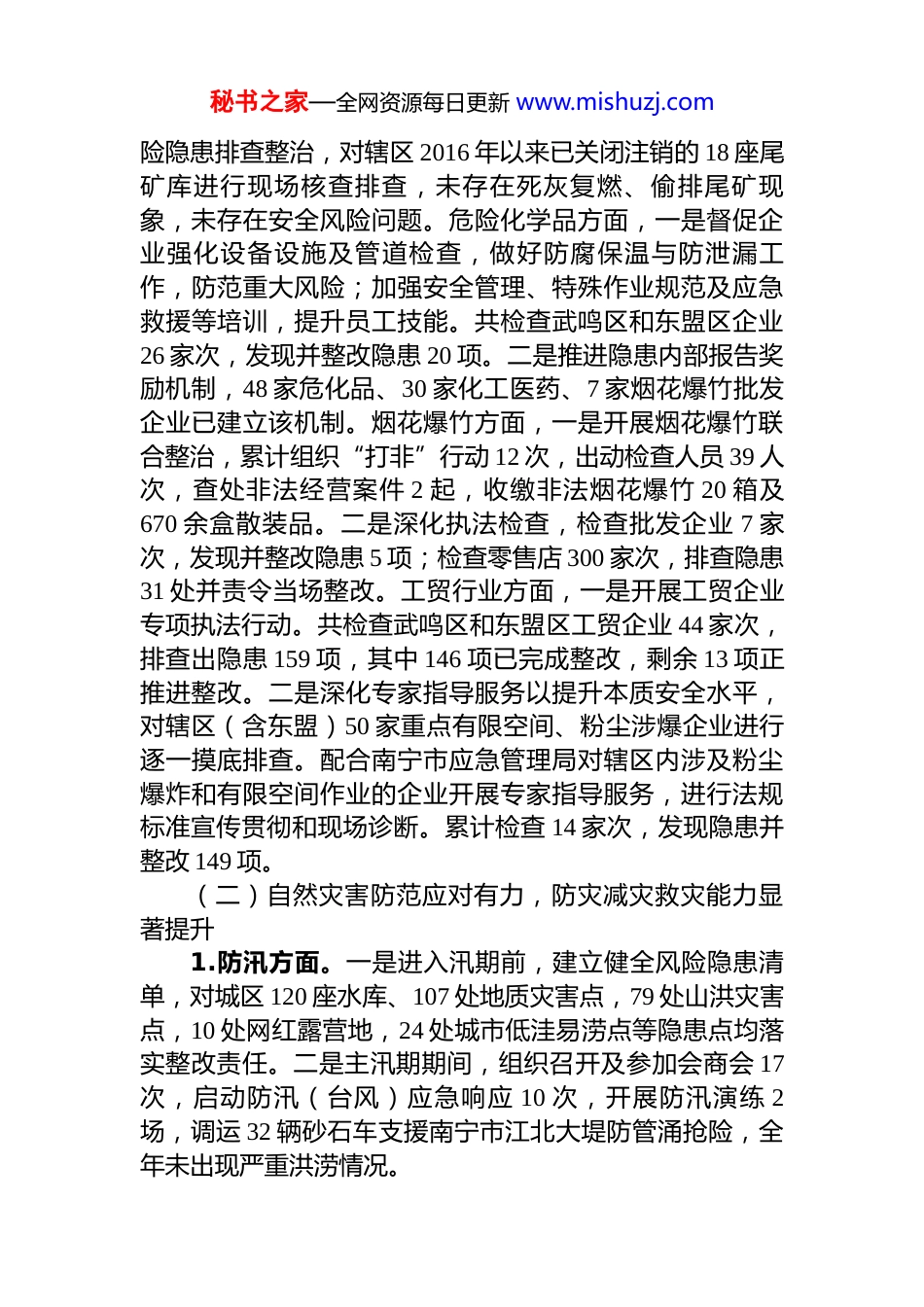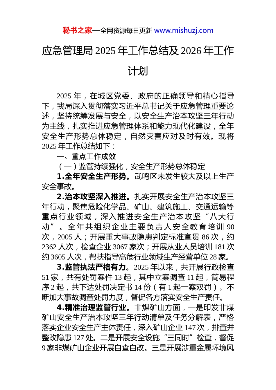 秘书之家—全网资源每日更新 www.mishuzj.com应急管理局 2025 年工作总结及 2026 年工作计划2025 年,在城区党委、政府的正确领导和精心指导下,我局深入贯彻落实习近平总书记关于应急管理重要论述,坚持统筹发展与安全,以安全生产治本攻坚三年行动为主线,扎实推进应急管理体系和能力现代化建设,全年安全生产形势总体稳定,自然灾害应对及时有效。现将2025 年工作总结如下:一、重点工作成效(一)监管持续强化,安全生产形势总体稳定1.全年安全生产形势。武鸣区未发生较大及以上生产安全事故。2.治本攻坚深入推进。扎实开展安全生产治本攻坚三年行动,聚焦危险化学品、矿山、建筑施工、交通运输等重点行业领域,深入推进安全生产治本攻坚“八大行动 ” 。 全 年 共 组 织 企 业 主 要 负 责 人 安 全 教 育 培 训 90次,2005 人;开展重大事故隐患判定标准宣贯 86 次,约2362 人次,检查企业 3067 家次;开展从业人员培训 181 次约 3605 人次,帮扶指导高危行业领域生产经营单位 28 家。3.监管执法严格有力。2025 年以来,共开展行政检查51 家,共有处罚案件 13 起,其中立案调查 11 起,简易程序 2 起,共下达处罚决定书 14 份(有 1 起一案双罚)。不断加大事故调查处罚力度,督促各方落实安全生产责任。4.精准治理监管行业。非煤矿山方面,一是印发非煤矿山安全生产治本攻坚三年行动清单及任务分解表,严格落实企业安全生产主体责任,深入矿山企业 147 次,排查并整改隐患 127 处。二是开展安全设施“三同时”检查,督促9 家非煤矿山企业开展自查自改。三是开展涉重金属环境风秘书之家—全网资源每日更新 www.mishuzj.com险隐患排查整治,对辖区 2016 年以来已关闭注销的 18 座尾矿库进行现场核查排查,未存在死灰复燃、偷排尾矿现象,未存在安全风险问题。危险化学品方面,一是督促企业强化设备设施及管道检查,做好防腐保温与防泄漏工作,防范重大风险;加强安全管理、特殊作业规范及应急救援等培训,提升员工技能。共检查武鸣区和东盟区企业26 家次,发现并整改隐患 20 项。二是推进隐患内部报告奖励机制,48 家危化品、30 家化工医药、7 家烟花爆竹批发企业已建立该机制。烟花爆竹方面,一是开展烟花爆竹联合整治,累计组织“打非”行动 12 次,出动检查人员 39 人次,查处非法经营案件 2 起,收缴非法烟花爆竹 20 箱及670 余盒散装品。二是深化执法检查,检查批发企业 7 家次,发现并整改隐患 5 项;检查零售店 300 家次,排查隐患31 处并责令当场整改。工贸行业方面,一是开展工贸企业专项执法行动。共检查武鸣区和东盟区工贸企业 44 家次,排查出隐患 159 项,其中 146 项已完成整改,剩余 13 项正推进整改。二是深化专家指导服务以提升本质安全水平,对辖区(含东盟)50 家重点有限空间、粉尘涉爆企业进行逐一摸底排查。配合南宁市应急管理局对辖区内涉及粉尘爆炸和有限空间作业的企业开展专家指导服务,进行法规标准宣传贯彻和现场诊断。累计检查 14 家次,发现隐患并整改 149 项。(二)自然灾害防范应对有力,防灾减灾救灾能力显著提升1.防汛方面。一是进入汛期前,建立健全风险隐患清单,对城区 120 座水库、107 处地质灾害点,79 处山洪灾害点,10 处网红露营地,24 处城市低洼易涝点等隐患点均落实整改责任。二是主汛期期间,组织召开及参加会商会 17次,启动防汛(台风)应急响应 10 次,开展防汛演练 2场,调运 32 辆砂石车支援南宁市江北大堤防管涌抢险,全年未出现严重洪涝情况。秘书之家—全网资源每日更新 www.mishuzj.com2.森林防灭火方面。一是联合组建 2 个督导组,对 13个镇开展“四不两直”督导 12 次,整改问题 18 项。重点时段设 225 处进山守卡点,出动约 6700 名志愿巡防员严查火种,登记 8.6 万人次,发放告知书 12 万份。二是为破解石头山火人工灭火难题,组建 3 支无人机灭火专业队,共参与山火扑灭任务 8 次。三是组织城区专业森林消防队员到各镇指导开展森林防灭火知识培训和实战演练 8 次(含无...