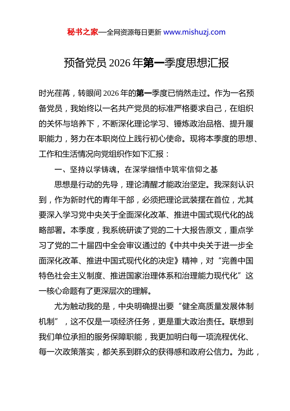 秘书之家—全网资源每日更新 www.mishuzj.com预备党员 2026 年第一季度思想汇报 时光荏苒,转眼间 2026 年的第一季度已悄然走过。作为一名预备党员,我始终以一名共产党员的标准严格要求自己,在组织的关怀与培养下,不断深化理论学习、锤炼政治品格、提升履职能力,努力在本职岗位上践行初心使命。现将本季度的思想、工作和生活情况向党组织作如下汇报:一、坚持以学铸魂,在深学细悟中筑牢信仰之基思想是行动的先导,理论清醒才能政治坚定。我深刻认识到,作为新时代的青年干部,必须把理论武装摆在首位,尤其要深入学习党中央关于全面深化改革、推进中国式现代化的战略部署。本季度,我系统研读了党的二十大报告原文,重点学习了党的二十届四中全会审议通过的《中共中央关于进一步全面深化改革、推进中国式现代化的决定》精神,对“完善中国特色社会主义制度、推进国家治理体系和治理能力现代化”这一核心命题有了更深层次的理解。尤为触动我的是,中央明确提出要“健全高质量发展体制机制”,这不仅是一项经济任务,更是重大政治责任。联想到我们单位承担的服务保障职能,我更加明白每一项流程优化、每一次政策落实,都关系到群众的获得感和政府公信力。为此,秘书之家—全网资源每日更新 www.mishuzj.com我坚持每天抽出半小时阅读《人民日报》评论版和“学习强国”平台推送的重点文章,积极参与党支部组织的专题研讨,围绕“如何在基层岗位上体现改革担当”交流心得。通过学习,我进一步廓清了思想迷雾,增强了“四个意识”、坚定了“四个自信”,自觉做到在思想上政治上行动上同党中央保持高度一致。二、坚持知行合一,在履职尽责中彰显实干之为理论的价值在于指导实践,党员的先进性体现在具体工作中。本季度,我所在的部门承接了年度重点工作任务分解与督办机制优化项目。面对时间紧、标准高的要求,我没有退缩,主动请缨加入专项小组,承担数据汇总与进度跟踪职责。在工作中,我始终坚持实事求是的原则,每一条信息都反复核对来源,每一个节点都精准标注时限,确保督查台账真实可靠。有一次,某科室报送的阶段性进展存在模糊表述,我及时沟通核实,帮助其细化量化指标,避免了后续评估中的偏差。让我印象深刻的还有参与社区共建活动的经历。春节前夕按照机关党委统一安排,我赴结对社区开展走访慰问。在与一位独居老党员交谈时,他提到小区路灯老化影响夜间出行,虽已反映多次但迟迟未解决。我立即将此问题记录下来,并通过单位协调机制反馈至市政管理部门。两周后回访得知,该路段秘书之家—全网资源每日更新 www.mishuzj.com已完成照明设施更新。这件事让我深切体会到,群众的一桩“小事”,就是我们党员干部心头的“大事”。只有把群众关切放在心上、抓在手上,才能真正赢得信任和支持。同时,我也清醒地看到自身存在的不足:一是统筹协调能力有待加强,在多任务并行时偶有顾此失彼现象;二是调查研究不够深入,有时满足于完成既定动作,缺乏主动发现问题的敏锐性。针对这些问题,我已在个人年度提升计划中列出改进措施,拟通过参加办公自动化培训、定期撰写基层观察笔记等方式加以弥补。三、坚持修身律己,在严于律己中涵养清廉之风作风建设永远在路上,廉洁自律是党员干部的生命线。作为机关单位的一员,我深知手中哪怕微小的行政权力,也都承载着组织的信任和人民的期待。本季度,我认真学习新修订的《中国共产党纪律处分条例》,特别关注其中关于形式主义、官僚主义问题的界定与处理规定,对照检视自身是否存在“重痕迹轻实效”“会议落实会议”等苗头倾向。在日常工作中,我严格执行中央八项规定及其实施细则精神,坚决抵制任何形式的吃请宴请,不越红线一步。单位近期通报的几起年轻干部违纪案例也给我敲响了警钟个别同志因沉迷网络赌博、虚报差旅费用而断送前程,令人痛秘书之家—全网资源每日更新 www.mishuzj.com惜。我由此更加警醒:理想信念滑坡是最危险的滑坡,必须从一开始就扣好廉洁从政的“第一粒扣子”。为此,我主动接受家庭助廉教育,邀请家人共同观看廉政警示教育片,筑牢家庭防线。在生活中,我崇尚俭朴,反对铺张浪费,注重培养健康的生...