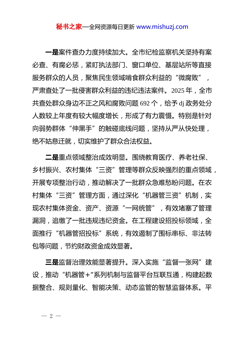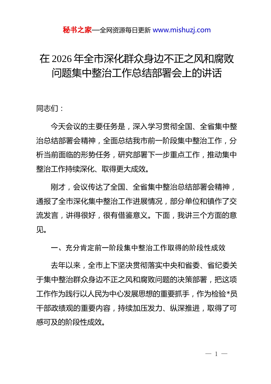 秘书之家—全网资源每日更新 www.mishuzj.com在 2026 年全市深化群众身边不正之风和腐败问题集中整治工作总结部署会上的讲话同志们:今天会议的主要任务是,深入学习贯彻全国、全省集中整治总结部署会精神,全面总结我市前一阶段集中整治工作,分析当前面临的形势任务,研究部署下一步重点工作,推动集中整治工作持续深化、取得更大成效。刚才,会议传达了全国、全省集中整治总结部署会精神,通报了全市深化集中整治工作进展情况,部分单位和镇作了交流发言,讲得很好,很有借鉴意义。下面,我讲三个方面的意见。一、充分肯定前一阶段集中整治工作取得的阶段性成效去年以来,全市上下坚决贯彻落实中央和省委、省纪委关于集中整治群众身边不正之风和腐败问题的决策部署,把这项工作作为践行以人民为中心发展思想的重要抓手,作为检验*员干部政绩观的重要内容,持续加压发力、纵深推进,取得了可感可及的阶段性成效。— 1 —秘书之家—全网资源每日更新 www.mishuzj.com一是案件查办力度持续加大。全市纪检监察机关坚持有案必查、有腐必惩,紧盯执法部门、窗口单位、基层站所等直接服务群众的人员,聚焦民生领域啃食群众利益的“微腐败”,严肃查处了一批侵害群众利益的违纪违法案件。2025 年,全市共查处群众身边不正之风和腐败问题 692 个,给予 dj 政务处分人数较上年度有较大幅度增长,形成了有力震慑。特别是针对向弱势群体“伸黑手”的触碰底线问题,坚持从严从快处理,绝不姑息迁就,切实维护了群众合法权益。二是重点领域整治成效明显。围绕教育医疗、养老社保、乡村振兴、农村集体“三资”管理等群众反映强烈的重点领域,开展专项整治行动,推动解决了一批群众急难愁盼问题。在农村集体“三资”管理方面,通过深化“机器管三资”机制,实现农村集体资金、资产、资源“一网统管”,有效堵塞了管理漏洞,追缴了一批违规违纪资金。在工程建设招投标领域,全面推行“机器管招投标”系统,有效遏制了围标串标、非法转包等问题,节约财政资金成效显著。三是监督治理效能显著提升。深入实施“监督一张网”建设,推动“机器管+”系列机制与监督平台互联互通,构建起数据整合、规则量化、智能决策、动态监管的智慧监督体系。平— 2 —秘书之家—全网资源每日更新 www.mishuzj.com台归集数据量持续增长,发起并推动办结问题数量大幅提升,到期办结率达到较高水平。通过大数据筛查、智能预警等技术手段,深挖了一批隐形变异问题线索,破解了基层“人情干扰”办案难题,提升了监督精准性和实效性。四是制度建设逐步健全完善。坚持标本兼治、系统施治,把查办案件与堵塞制度漏洞、强化监督管理结合起来,推动建立健全长效机制。针对整治中发现的制度机制漏洞,督促相关职能部门完善规章制度,形成了一批制度性成果。建立定期分析研判机制,加强信访工作源头治理和系统治理,推动从源头上预防和减少群众身边不正之风和腐败问题发生。五是群众获得感满意度增强。坚持开门搞整治,主动听取群众意见建议,及时回应群众关切。通过问卷调查、电话征询、集中评议等多种方式开展群众满意度调查,群众对整治工作的知晓率、认同感和参与度不断提升。从调查结果看,群众对集中整治工作总体满意度较整治前有明显提升,一批群众反映强烈的问题得到有效解决,群众的获得感、幸福感、安全感切实增强。在肯定成绩的同时,也要清醒认识到,当前工作中还存在一些问题和不足。有的地方和单位思想认识还不够到位,把集— 3 —秘书之家—全网资源每日更新 www.mishuzj.com中整治当作一般性工作来抓,推进力度不够大;有的部门协同配合不够紧密,工作衔接还不够顺畅,齐抓共管的工作格局尚未完全形成;有的地方案件查办质量还不够高,深挖细究不够,以案促改促治效果有待提升;有的地方宣传引导不够到位,群众对整治成效的知晓率还不够高。对于这些问题,必须高度重视,切实加以解决。二、准确把握深化集中整治工作的形势任务和总体要求深化群众身边不正之风和腐败问题集中整治,是贯彻落实*中央决策部署的政治任务,是践行以人民为中心发展思想的具体行动,是推进全面从严治*向基层延伸的重要...