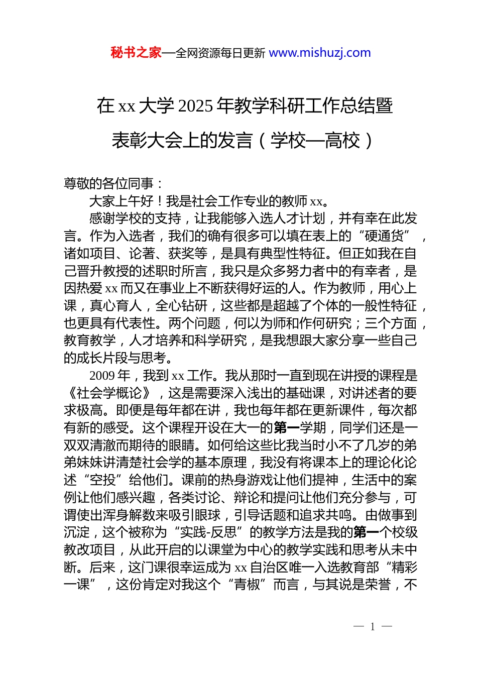 秘书之家—全网资源每日更新 www.mishuzj.com在 xx 大学 2025 年教学科研工作总结暨表彰大会上的发言(学校—高校)尊敬的各位同事:大家上午好!我是社会工作专业的教师 xx。感谢学校的支持,让我能够入选人才计划,并有幸在此发言。作为入选者,我们的确有很多可以填在表上的“硬通货”,诸如项目、论著、获奖等,是具有典型性特征。但正如我在自己晋升教授的述职时所言,我只是众多努力者中的有幸者,是因热爱 xx 而又在事业上不断获得好运的人。作为教师,用心上课,真心育人,全心钻研,这些都是超越了个体的一般性特征,也更具有代表性。两个问题,何以为师和作何研究;三个方面,教育教学,人才培养和科学研究,是我想跟大家分享一些自己的成长片段与思考。2009 年,我到 xx 工作。我从那时一直到现在讲授的课程是《社会学概论》,这是需要深入浅出的基础课,对讲述者的要求极高。即便是每年都在讲,我也每年都在更新课件,每次都有新的感受。这个课程开设在大一的第一学期,同学们还是一双双清澈而期待的眼睛。如何给这些比我当时小不了几岁的弟弟妹妹讲清楚社会学的基本原理,我没有将课本上的理论化论述“空投”给他们。课前的热身游戏让他们提神,生活中的案例让他们感兴趣,各类讨论、辩论和提问让他们充分参与,可谓使出浑身解数来吸引眼球,引导话题和追求共鸣。由做事到沉淀,这个被称为“实践-反思”的教学方法是我的第一个校级教改项目,从此开启的以课堂为中心的教学实践和思考从未中断。后来,这门课很幸运成为 xx 自治区唯一入选教育部“精彩一课”,这份肯定对我这个“青椒”而言,与其说是荣誉,不— 1 —秘书之家—全网资源每日更新 www.mishuzj.com如说是一份坚定的嘱托。当老师 17 年,给本硕学生讲授了 17门课程,下学期又各有一门新课。上课耗费了我很多的时间,上课又何尝不是我们育人最主要的地方。四处寻找备课资料,用学术的热情感染课堂上的每一位学生,这是我们作为师者传道授业解惑义不容辞的责任。我甚至迷信,当我用心对待每一位我的学生,我的孩子也必将获得他的老师应有的善待。教学之于我的正向反馈很多,最后一节课同学们热烈的掌声,多年前的学生相遇后的夸赞,都是满满的情绪价值。教学与科研的相互影响也十分显著。我给研究生讲授了六次的《社会工作理论》,直接的产出是已经写了 12 万字的《构建中国社会工作的自主知识体系》。想方设法讲好课,让孩子们在课堂上增加知识,启动思考,这是我们做老师的基本原则和最高追求。我的第一个感受是:为人师表,学术的根必须扎进生活的土壤,教育的光要能照亮学生脚下的路。我的学术地图很简单。西北师范大学读社会学硕士的时候研究方向是农村社会学。作为农家子弟,研究村庄里的事,自然得心应手,研究也应该如同作物一样向下扎根,向上生长。我的博士论文研究的是救灾的村庄里,国家、社会和灾民之间的互动关系,依旧属于农村社会学。自从到 xx 工作以后,我的学术研究就开始有点像牧民了。从早期的“xx 社会稳定研究”,到后来的“xx 社会工作理论和实践探索”“xx 社会治理现代化”,再到如今聚焦的“dj 引领的 xx 社会工作和基层治理创新”,变换的研究主题有内在的逻辑关系,关键是都紧密联系xx 的实际。走进 xx,研究 xx,服务 xx,是我们社会工作专业硕士人才培养的做法,也是我自己学术研究的基本原则。xx 年完成的 x 项国家社科基金项目,发表的 xx 余篇学术论文,始终紧扣 xx 的主题。我的第二个感受是:不是我在研究 xx,而是xx 在教育和重塑着我,xx 成全了我。今天我特别想分享与学生共同成长的经历以及衍生的“副— 2 —秘书之家—全网资源每日更新 www.mishuzj.com产品”。我是 xxxx 级社会工作本科班的班主任,与这个班同学一起开成长小组,一起阅读英文文献,一起运动锻炼,我们这个被同学们自诩不输《死亡诗社》的班级,一半同学应届考入“双一流”大学研究生,应该是 xx 历史上前无古人的佳绩。即便是他们在研究生期间的选题和论文写作,甚至博士毕业之后如何在教学科研之间取舍,我依然是他们要联系交流的那个“船长...
