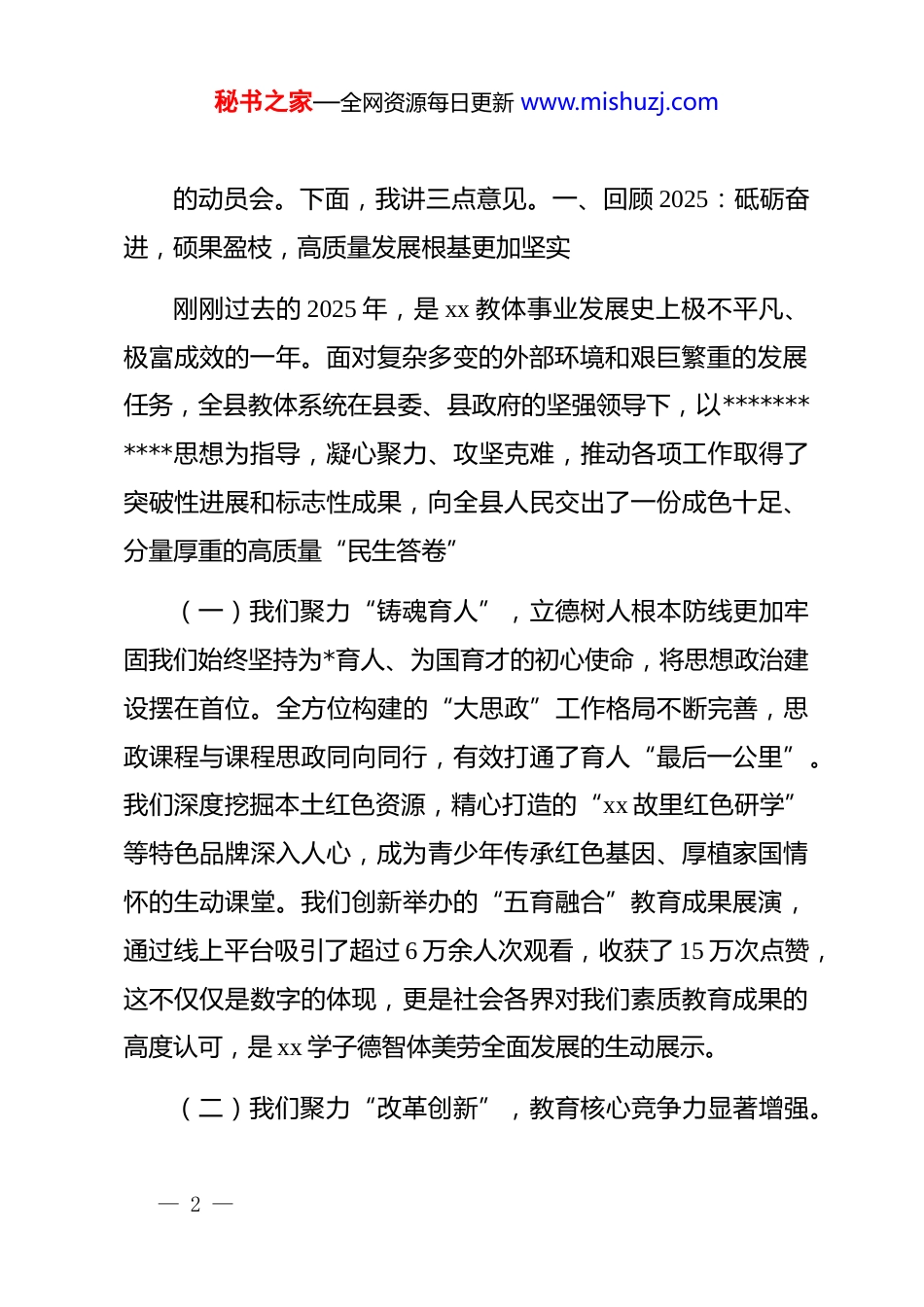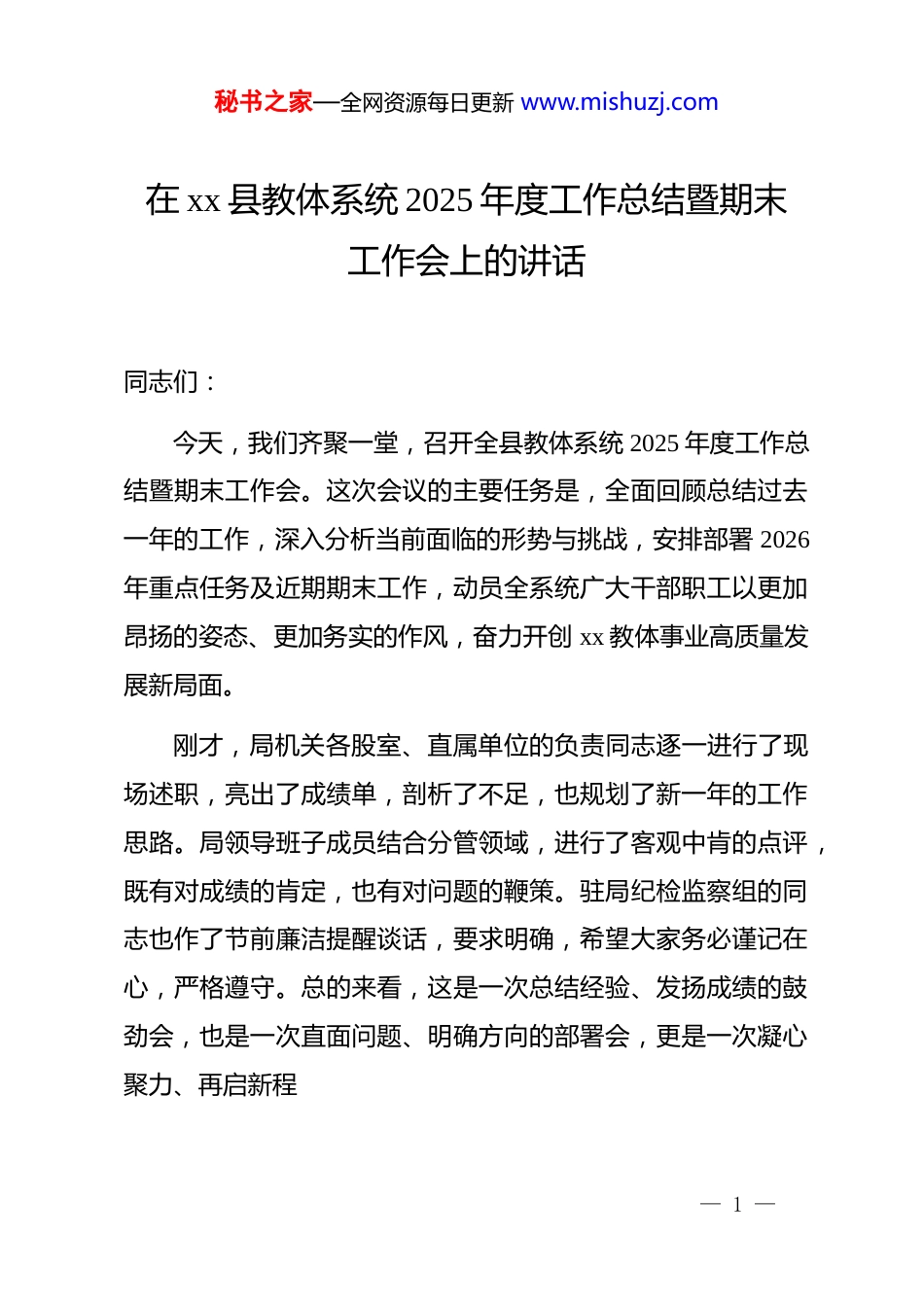 秘书之家—全网资源每日更新 www.mishuzj.com在 xx 县教体系统 2025 年度工作总结暨期末工作会上的讲话同志们:今天,我们齐聚一堂,召开全县教体系统 2025 年度工作总结暨期末工作会。这次会议的主要任务是,全面回顾总结过去一年的工作,深入分析当前面临的形势与挑战,安排部署 2026年重点任务及近期期末工作,动员全系统广大干部职工以更加昂扬的姿态、更加务实的作风,奋力开创 xx 教体事业高质量发展新局面。刚才,局机关各股室、直属单位的负责同志逐一进行了现场述职,亮出了成绩单,剖析了不足,也规划了新一年的工作思路。局领导班子成员结合分管领域,进行了客观中肯的点评,既有对成绩的肯定,也有对问题的鞭策。驻局纪检监察组的同志也作了节前廉洁提醒谈话,要求明确,希望大家务必谨记在心,严格遵守。总的来看,这是一次总结经验、发扬成绩的鼓劲会,也是一次直面问题、明确方向的部署会,更是一次凝心聚力、再启新程— 1 —秘书之家—全网资源每日更新 www.mishuzj.com的动员会。下面,我讲三点意见。一、回顾 2025:砥砺奋进,硕果盈枝,高质量发展根基更加坚实刚刚过去的 2025 年,是 xx 教体事业发展史上极不平凡、极富成效的一年。面对复杂多变的外部环境和艰巨繁重的发展任务,全县教体系统在县委、县政府的坚强领导下,以***********思想为指导,凝心聚力、攻坚克难,推动各项工作取得了突破性进展和标志性成果,向全县人民交出了一份成色十足、分量厚重的高质量“民生答卷”(一)我们聚力“铸魂育人”,立德树人根本防线更加牢固我们始终坚持为*育人、为国育才的初心使命,将思想政治建设摆在首位。全方位构建的“大思政”工作格局不断完善,思政课程与课程思政同向同行,有效打通了育人“最后一公里”。我们深度挖掘本土红色资源,精心打造的“xx 故里红色研学”等特色品牌深入人心,成为青少年传承红色基因、厚植家国情怀的生动课堂。我们创新举办的“五育融合”教育成果展演,通过线上平台吸引了超过 6 万余人次观看,收获了 15 万次点赞,这不仅仅是数字的体现,更是社会各界对我们素质教育成果的高度认可,是 xx 学子德智体美劳全面发展的生动展示。(二)我们聚力“改革创新”,教育核心竞争力显著增强。— 2 —秘书之家—全网资源每日更新 www.mishuzj.com改革是发展的根本动力。我们勇于先行先试,在教育评价改革领域积极探索,破除“唯分数、唯升学、唯文凭、唯论文、唯帽子”的顽瘴痼疾,形成了一套符合 xx 实际、具有推广价值的实践模式,为全市乃至全省提供了可借鉴的“xx 样本”。凭借扎实的教学管理和卓越的育人质量,我县基础教育继续稳居全市“一方阵”的领先地位。我们敢于抢抓机遇,成功争取并启动筹建全国首个“xx 现场工程师学院”,为探索产教融合、科教融汇新路径迈出了关键一步。我们着力贯通培养,积极探索的小初高一体化人才培养模式,因其科学性和前瞻性,获得了省教育厅的高度肯定并予以推广,彰显了 xx 教育的创新活力。(三)我们聚力“固本强基”,事业发展保障更加坚实。教师是立教之本、兴教之源。我们全年共补充优质师资 137 人,其中研究生学历占比高达 21.2%,高素质、专业化、创新型教师队伍的结构持续优化,为教育高质量发展注入了源源不断的“活水”。我们全力推进项目建设,备受瞩目的县体育馆顺利建成并投入使用,这不仅极大改善了我县体育基础设施条件,更成为我们成功承办全国性体育赛事的重要平台。通过高水平赛事的举办,“运动 xx”这张城市名片变得更加亮丽,全民健身的氛围日益浓厚,体育事业与教育事业实现了“两翼齐飞”。— 3 —秘书之家—全网资源每日更新 www.mishuzj.com(四)我们聚力“平安和谐”,教书育人环境持续优化。安全是发展的前提,和谐是进步的保障。我们常态化、精细化推进平安校园建设,将安全责任压实到每个岗位、每个环节。我们创新构建的“1+3+34”心理健康服务三级网络运行高效、成效显著,为广大学生的心理健康撑起了一把坚实的“保护伞”,有效预防和化解了各类心理危机。一年来,全系统上下团结一心,奋勇争先,全年累计斩获市县级...
