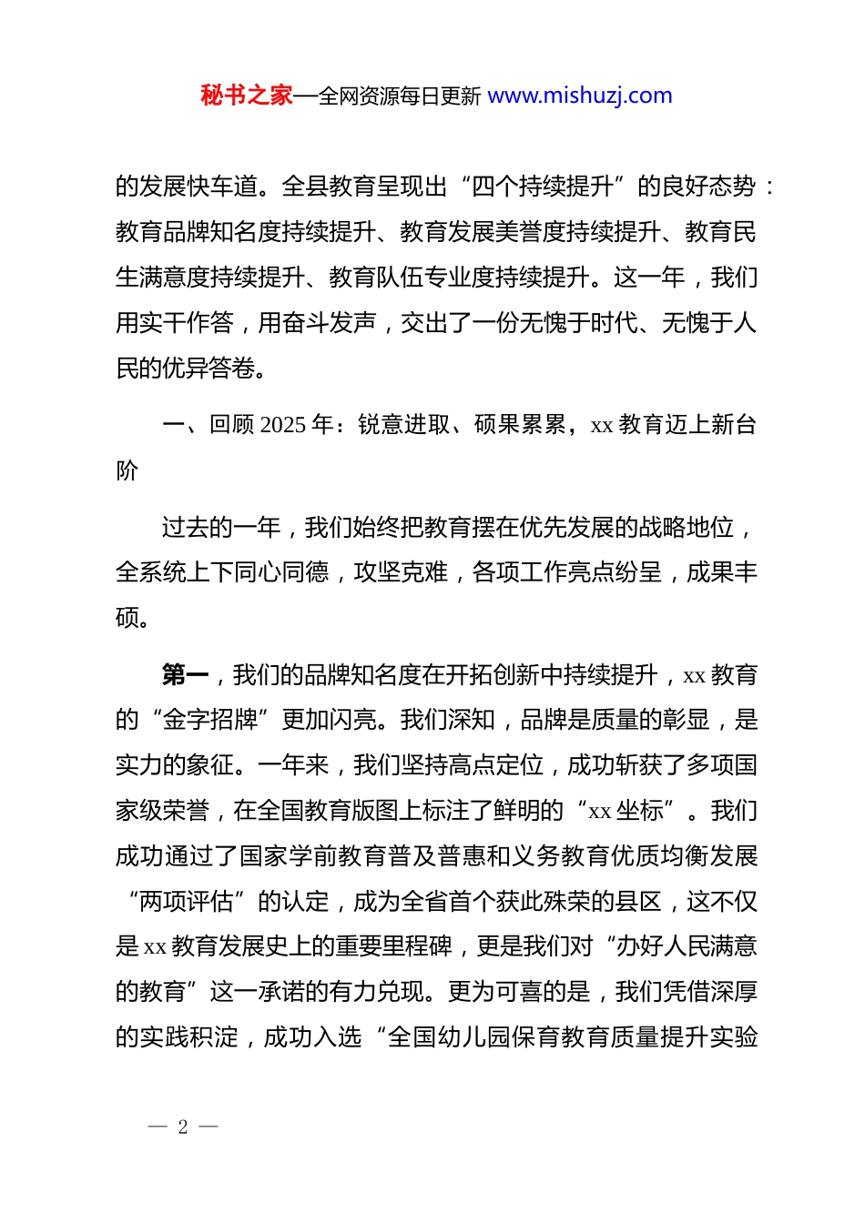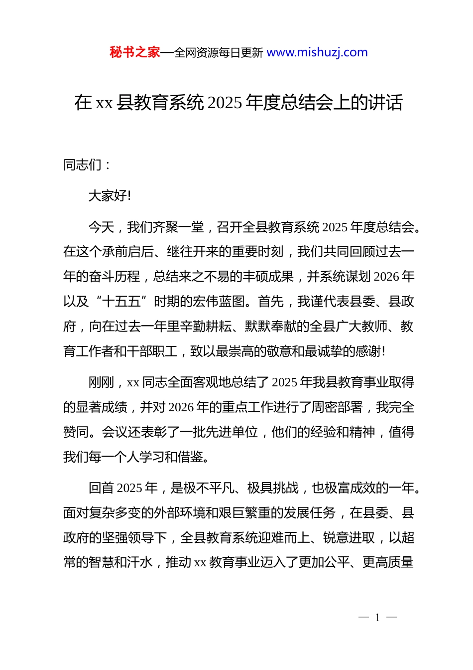 秘书之家—全网资源每日更新 www.mishuzj.com在 xx 县教育系统 2025 年度总结会上的讲话同志们:大家好!今天,我们齐聚一堂,召开全县教育系统 2025 年度总结会。在这个承前启后、继往开来的重要时刻,我们共同回顾过去一年的奋斗历程,总结来之不易的丰硕成果,并系统谋划 2026 年以及“十五五”时期的宏伟蓝图。首先,我谨代表县委、县政府,向在过去一年里辛勤耕耘、默默奉献的全县广大教师、教育工作者和干部职工,致以最崇高的敬意和最诚挚的感谢!刚刚,xx 同志全面客观地总结了 2025 年我县教育事业取得的显著成绩,并对 2026 年的重点工作进行了周密部署,我完全赞同。会议还表彰了一批先进单位,他们的经验和精神,值得我们每一个人学习和借鉴。回首 2025 年,是极不平凡、极具挑战,也极富成效的一年。面对复杂多变的外部环境和艰巨繁重的发展任务,在县委、县政府的坚强领导下,全县教育系统迎难而上、锐意进取,以超常的智慧和汗水,推动 xx 教育事业迈入了更加公平、更高质量— 1 —秘书之家—全网资源每日更新 www.mishuzj.com的发展快车道。全县教育呈现出“四个持续提升”的良好态势:教育品牌知名度持续提升、教育发展美誉度持续提升、教育民生满意度持续提升、教育队伍专业度持续提升。这一年,我们用实干作答,用奋斗发声,交出了一份无愧于时代、无愧于人民的优异答卷。一、回顾 2025 年:锐意进取、硕果累累,xx 教育迈上新台阶过去的一年,我们始终把教育摆在优先发展的战略地位,全系统上下同心同德,攻坚克难,各项工作亮点纷呈,成果丰硕。第一,我们的品牌知名度在开拓创新中持续提升,xx 教育的“金字招牌”更加闪亮。我们深知,品牌是质量的彰显,是实力的象征。一年来,我们坚持高点定位,成功斩获了多项国家级荣誉,在全国教育版图上标注了鲜明的“xx 坐标”。我们成功通过了国家学前教育普及普惠和义务教育优质均衡发展“两项评估”的认定,成为全省首个获此殊荣的县区,这不仅是 xx 教育发展史上的重要里程碑,更是我们对“办好人民满意的教育”这一承诺的有力兑现。更为可喜的是,我们凭借深厚的实践积淀,成功入选“全国幼儿园保育教育质量提升实验— 2 —秘书之家—全网资源每日更新 www.mishuzj.com区”、“全国义务教育教学改革实验区”、“全国首批中小学科学教育实验区”、“全国学校家庭社会协同育人实验区”以及“全国中小学劳动教育实验区”等一系列国家级改革实验区。这“五大国家级实验区”的集中落户,充分证明了 xx 教育改革的探索与实践已经走在了全国前列,获得了国家层面的高度认可,我们的教育品牌不再仅仅是区域性的,而是具有了全国性的影响力和示范效应。第二,我们的教育美誉度在内涵建设中持续提升,xx 教育的“优质口碑”更加响亮。美誉度源于人民群众的真切感受和社会的广泛赞誉。我们始终坚持“立德树人·全域优质”的核心理念,不驰于空想、不骛于虚声,扎扎实实推进教育内涵发展。学前教育阶段,我们独创的“乡味育人”模式,让孩子们在乡土文化的浸润中茁壮成长,相关经验做法得到了国家级媒体的关注和推广。义务教育阶段,我们以 xx 中学等标杆学校为引领,提炼形成了一批可复制、可推广的“xx 范式”,有效带动了全县中小学办学水平的整体跃升。我们构建了近 30 个风格各异、特色鲜明的校园文化体系,让每一所学校都成为有故事、有品位、有温度的育人殿堂。这些看得见、摸得着的质量提升和特色发展,让社会各界对 xx 教育的认可度和赞誉度达到了新的高— 3 —秘书之家—全网资源每日更新 www.mishuzj.com度。第三,我们的民生满意度在均衡发展中持续提升,人民群众的“教育获得感”更加充实。教育是最大的民生。我们始终将促进教育公平作为工作的重中之重,努力让每一个孩子都能在家门口“上好学”。县委、县政府坚持教育投入“两个只增不减”,县财政连续三年将超过 20%的支出用于教育,教育经费年均增长达到 10.65%,真金白银的投入为教育发展提供了最坚实的保障。我们大力实施“全面改薄”与能力提升工程,确保城乡学校在硬件设施上无差别,信息化建设实现全覆盖...