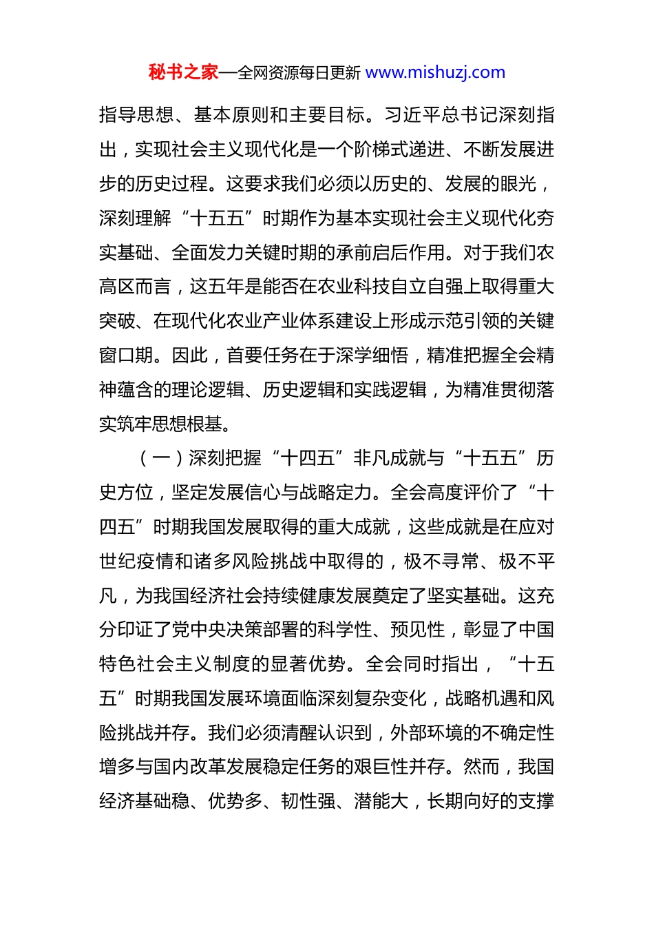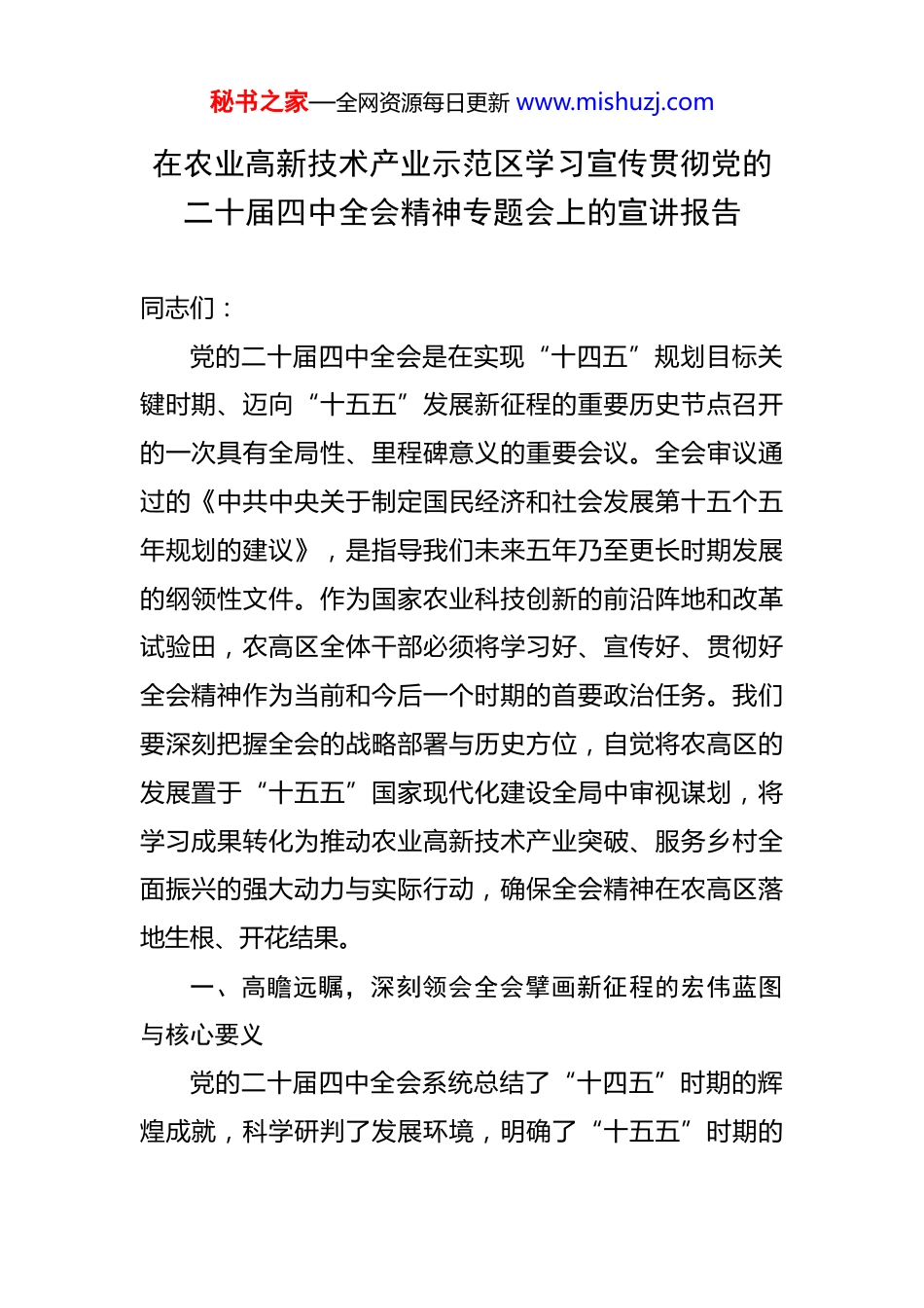 秘书之家—全网资源每日更新 www.mishuzj.com在农业高新技术产业示范区学习宣传贯彻党的二十届四中全会精神专题会上的宣讲报告 同志们:党的二十届四中全会是在实现“十四五”规划目标关键时期、迈向“十五五”发展新征程的重要历史节点召开的一次具有全局性、里程碑意义的重要会议。全会审议通过的《中共中央关于制定国民经济和社会发展第十五个五年规划的建议》,是指导我们未来五年乃至更长时期发展的纲领性文件。作为国家农业科技创新的前沿阵地和改革试验田,农高区全体干部必须将学习好、宣传好、贯彻好全会精神作为当前和今后一个时期的首要政治任务。我们要深刻把握全会的战略部署与历史方位,自觉将农高区的发展置于“十五五”国家现代化建设全局中审视谋划,将学习成果转化为推动农业高新技术产业突破、服务乡村全面振兴的强大动力与实际行动,确保全会精神在农高区落地生根、开花结果。一、高瞻远瞩,深刻领会全会擘画新征程的宏伟蓝图与核心要义党的二十届四中全会系统总结了“十四五”时期的辉煌成就,科学研判了发展环境,明确了“十五五”时期的秘书之家—全网资源每日更新 www.mishuzj.com指导思想、基本原则和主要目标。习近平总书记深刻指出,实现社会主义现代化是一个阶梯式递进、不断发展进步的历史过程。这要求我们必须以历史的、发展的眼光,深刻理解“十五五”时期作为基本实现社会主义现代化夯实基础、全面发力关键时期的承前启后作用。对于我们农高区而言,这五年是能否在农业科技自立自强上取得重大突破、在现代化农业产业体系建设上形成示范引领的关键窗口期。因此,首要任务在于深学细悟,精准把握全会精神蕴含的理论逻辑、历史逻辑和实践逻辑,为精准贯彻落实筑牢思想根基。(一)深刻把握“十四五”非凡成就与“十五五”历史方位,坚定发展信心与战略定力。全会高度评价了“十四五”时期我国发展取得的重大成就,这些成就是在应对世纪疫情和诸多风险挑战中取得的,极不寻常、极不平凡,为我国经济社会持续健康发展奠定了坚实基础。这充分印证了党中央决策部署的科学性、预见性,彰显了中国特色社会主义制度的显著优势。全会同时指出,“十五五”时期我国发展环境面临深刻复杂变化,战略机遇和风险挑战并存。我们必须清醒认识到,外部环境的不确定性增多与国内改革发展稳定任务的艰巨性并存。然而,我国经济基础稳、优势多、韧性强、潜能大,长期向好的支撑秘书之家—全网资源每日更新 www.mishuzj.com条件和基本趋势没有变。具体到农高区,我们的信心来源于国家坚定不移推进农业强国建设的战略决心,来源于科技革命与产业变革为农业带来的历史性机遇,更来源于我们多年来在特色产业培育、创新平台搭建、人才资源聚集等方面积累的独特优势。面对新形势,全体干部必须保持战略定力,增强必胜信心,发扬历史主动精神,积极识变应变求变,集中力量办好农高区自己的事。我们要将思想和行动统一到党中央对形势的科学判断上来,既看到风险挑战,做好应对预案,更看到光明前景,把握战略主动。要善于从国家发展全局中找准农高区的定位,将国家超大规模市场优势、完整产业体系优势转化为农高区科技成果转化和产业升级的具体动能。要坚定贯彻新发展理念,决不因暂时的困难而动摇高质量发展的决心,而是要将压力转化为深化改革、推动创新的动力,在“十五五”这个关键时期展现农高区的担当作为。(二)精准锚定“十五五”核心目标与基本原则,把准发展方向与行动遵循。全会提出了“十五五”时期经济社会发展的七大主要目标,涵盖高质量发展、科技自立自强、深化改革、社会文明、人民生活、美丽中国、国家安全等方方面面。这七大目标相互关联、有机统一,构成了“十五五”发展的全景图。同时,全会明确了必须遵循的秘书之家—全网资源每日更新 www.mishuzj.com六项基本原则:坚持党的全面领导、坚持人民至上、坚持高质量发展、坚持全面深化改革、坚持有效市场和有为政府相结合、坚持统筹发展和安全。这六项原则是改革开放以来特别是新时代宝贵经验的科学总结,是确保“十五五”发展行稳致远的根本保证。对农高区工作而言,这七大目标和六项原则就是我们一切...