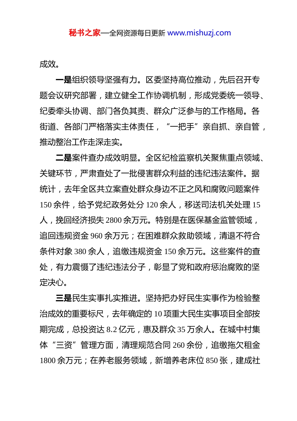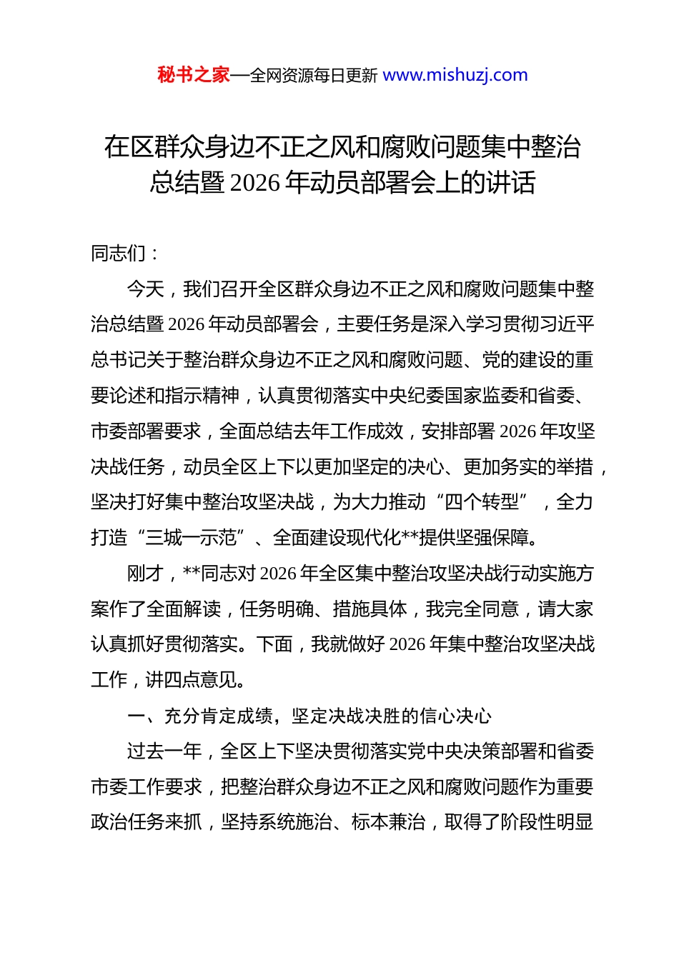 秘书之家—全网资源每日更新 www.mishuzj.com在区群众身边不正之风和腐败问题集中整治总结暨 2026 年动员部署会上的讲话 同志们:今天,我们召开全区群众身边不正之风和腐败问题集中整治总结暨 2026 年动员部署会,主要任务是深入学习贯彻习近平总书记关于整治群众身边不正之风和腐败问题、党的建设的重要论述和指示精神,认真贯彻落实中央纪委国家监委和省委、市委部署要求,全面总结去年工作成效,安排部署 2026 年攻坚决战任务,动员全区上下以更加坚定的决心、更加务实的举措,坚决打好集中整治攻坚决战,为大力推动“四个转型”,全力打造“三城一示范”、全面建设现代化**提供坚强保障。刚才,**同志对 2026 年全区集中整治攻坚决战行动实施方案作了全面解读,任务明确、措施具体,我完全同意,请大家认真抓好贯彻落实。下面,我就做好 2026 年集中整治攻坚决战工作,讲四点意见。一、充分肯定成绩,坚定决战决胜的信心决心过去一年,全区上下坚决贯彻落实党中央决策部署和省委市委工作要求,把整治群众身边不正之风和腐败问题作为重要政治任务来抓,坚持系统施治、标本兼治,取得了阶段性明显秘书之家—全网资源每日更新 www.mishuzj.com成效。一是组织领导坚强有力。区委坚持高位推动,先后召开专题会议研究部署,建立健全工作协调机制,形成党委统一领导、纪委牵头协调、部门各负其责、群众广泛参与的工作格局。各街道、各部门严格落实主体责任,“一把手”亲自抓、亲自管,推动整治工作走深走实。二是案件查办成效明显。全区纪检监察机关聚焦重点领域、关键环节,严肃查处了一批侵害群众利益的违纪违法案件。据统计,去年全区共立案查处群众身边不正之风和腐败问题案件150 余件,给予党纪政务处分 120 余人,移送司法机关处理 15人,挽回经济损失 2800 余万元。特别是在医保基金监管领域,追回违规资金 960 余万元;在困难群众救助领域,清退不符合条件对象 380 余人,追缴违规资金 150 余万元。这些案件的查处,有力震慑了违纪违法分子,彰显了党和政府惩治腐败的坚定决心。三是民生实事扎实推进。坚持把办好民生实事作为检验整治成效的重要标尺,去年确定的 10 项重大民生实事项目全部按期完成,总投资达 8.2 亿元,惠及群众 35 万余人。在城中村集体“三资”管理方面,清理规范合同 260 余份,追缴拖欠租金1800 余万元;在养老服务领域,新增养老床位 850 张,建成社秘书之家—全网资源每日更新 www.mishuzj.com区养老服务站点 25 个;在物业服务领域,有效化解矛盾纠纷430 余起,群众满意度持续提升。四是制度机制逐步完善。坚持“当下改”与“长久立”相结合,针对整治中发现的制度漏洞和监管盲区,推动建立健全各项规章制度 40 余项。探索运用大数据、人工智能等数智化手段提升监管效能,搭建民生资金监管平台,实现对资金使用的全流程动态监控,有效堵塞了权力运行漏洞。五是群众获得感不断增强。通过集中整治,一大批群众反映强烈的突出问题得到有效解决,群众满意度测评显示,对集中整治工作的满意率达到 92.5%,较上年提升 8.3 个百分点。实践证明,整治群众身边不正之风和腐败问题,是得民心、顺民意、惠民生的德政工程,必须一抓到底、久久为功。二、深刻认清形势,增强攻坚克难的责任担当在肯定成绩的同时,我们也要清醒看到,整治工作还存在一些不容忽视的问题和短板。一是思想认识还不够到位。少数单位和干部对整治工作的重要性认识不足,存在“差不多”、“过得去”的思想,工作推进不够有力。二是问题整改还不够彻底。有的问题整改浮于表面、就事论事,没有深挖根源、举一反三,存在边改边犯、改了又犯的现象。三是监管机制还不够健全。一些领域制度执行不够严格,监管存在薄弱环节,给秘书之家—全网资源每日更新 www.mishuzj.com违纪违法行为可乘之机。四是群众参与还不够广泛。整治工作的知晓率、参与率还有待提高,群众监督作用发挥不够充分。中央明确,2026 年是集中整治三年行动的最后一年,也是决战决胜的关键之年。收官之年关乎整体成色,更为紧要、极为关键。如果我们不能在今年啃下“硬骨头...