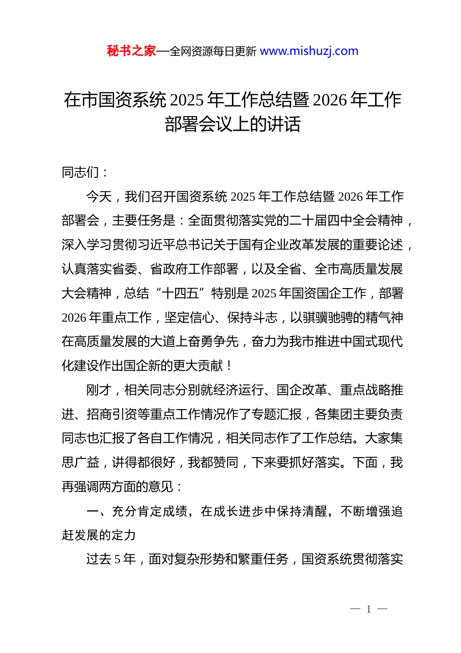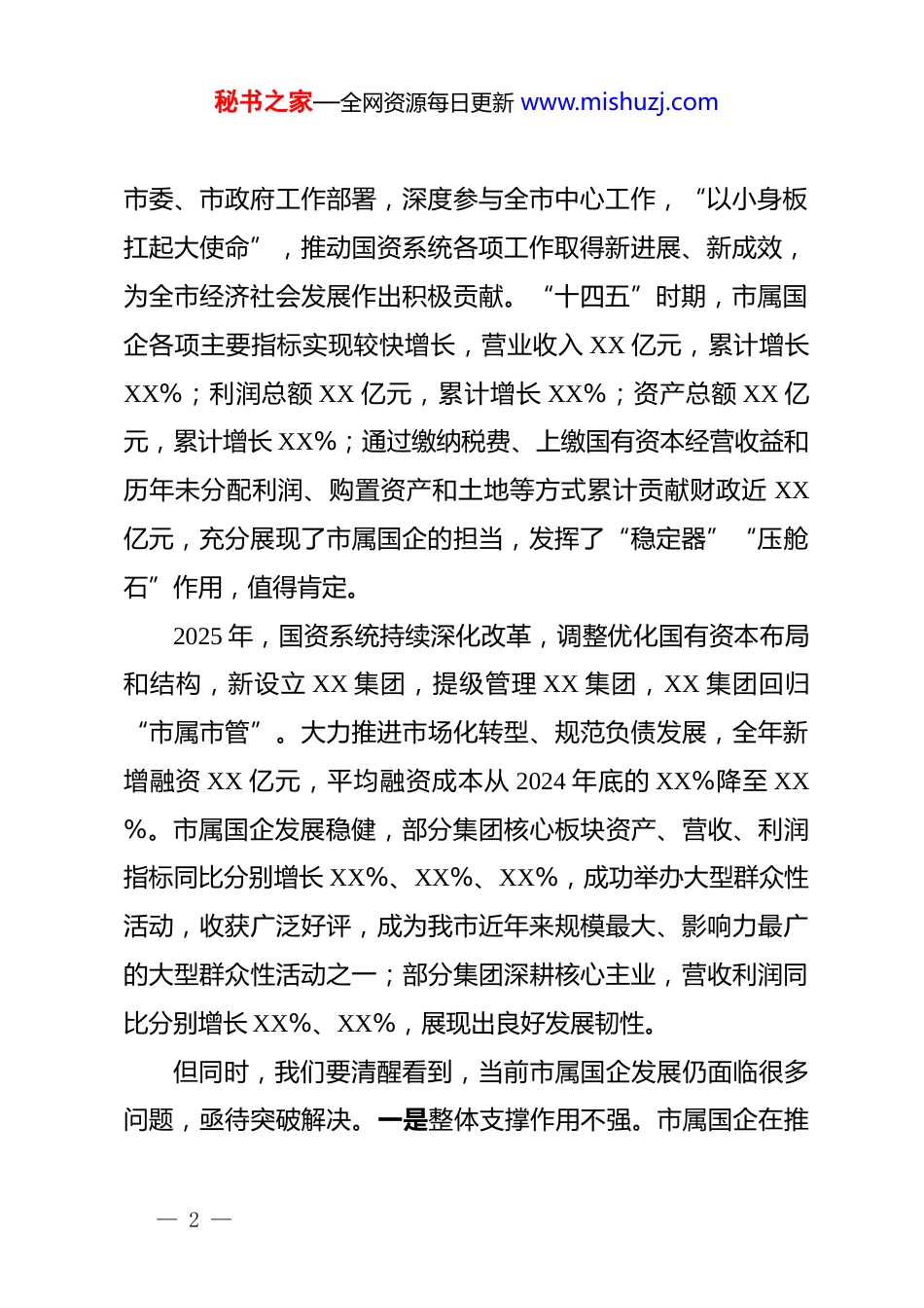 秘书之家—全网资源每日更新 www.mishuzj.com在市国资系统 2025 年工作总结暨 2026 年工作部署会议上的讲话同志们:今天,我们召开国资系统 2025 年工作总结暨 2026 年工作部署会,主要任务是:全面贯彻落实党的二十届四中全会精神,深入学习贯彻习近平总书记关于国有企业改革发展的重要论述,认真落实省委、省政府工作部署,以及全省、全市高质量发展大会精神,总结“十四五”特别是 2025 年国资国企工作,部署2026 年重点工作,坚定信心、保持斗志,以骐骥驰骋的精气神在高质量发展的大道上奋勇争先,奋力为我市推进中国式现代化建设作出国企新的更大贡献!刚才,相关同志分别就经济运行、国企改革、重点战略推进、招商引资等重点工作情况作了专题汇报,各集团主要负责同志也汇报了各自工作情况,相关同志作了工作总结。大家集思广益,讲得都很好,我都赞同,下来要抓好落实。下面,我再强调两方面的意见:一、充分肯定成绩,在成长进步中保持清醒,不断增强追赶发展的定力过去 5 年,面对复杂形势和繁重任务,国资系统贯彻落实— 1 —秘书之家—全网资源每日更新 www.mishuzj.com市委、市政府工作部署,深度参与全市中心工作,“以小身板扛起大使命”,推动国资系统各项工作取得新进展、新成效,为全市经济社会发展作出积极贡献。“十四五”时期,市属国企各项主要指标实现较快增长,营业收入 XX 亿元,累计增长XX%;利润总额 XX 亿元,累计增长 XX%;资产总额 XX 亿元,累计增长 XX%;通过缴纳税费、上缴国有资本经营收益和历年未分配利润、购置资产和土地等方式累计贡献财政近 XX亿元,充分展现了市属国企的担当,发挥了“稳定器”“压舱石”作用,值得肯定。2025 年,国资系统持续深化改革,调整优化国有资本布局和结构,新设立 XX 集团,提级管理 XX 集团,XX 集团回归“市属市管”。大力推进市场化转型、规范负债发展,全年新增融资 XX 亿元,平均融资成本从 2024 年底的 XX%降至 XX%。市属国企发展稳健,部分集团核心板块资产、营收、利润指标同比分别增长 XX%、XX%、XX%,成功举办大型群众性活动,收获广泛好评,成为我市近年来规模最大、影响力最广的大型群众性活动之一;部分集团深耕核心主业,营收利润同比分别增长 XX%、XX%,展现出良好发展韧性。但同时,我们要清醒看到,当前市属国企发展仍面临很多问题,亟待突破解决。一是整体支撑作用不强。市属国企在推— 2 —秘书之家—全网资源每日更新 www.mishuzj.com动我市经济社会发展中发挥了重要作用,但与省内同类城市相比,我市市属国企底子薄、基础弱、规模体量小,营业收入、资产总额等核心指标的增长速度偏慢[2025 年,我市市属国企营业收入位列全省第 XX、同类城市第 XX,同比增速位列全省第XX、同类城市第 XX;资产总额位列全省第 XX、同类城市第XX,同比增速位列全省第 XX、同类城市第 XX。],对全市高质量发展的支撑作用还不明显,距离市委、市政府关于推动市国资国企高质量发展的期待仍有较大差距。二是资产结构不优、质量不高。对比周边地市的资产周转率,同类城市普遍在 XX%左右,我们只有 XX%,这说明我们 XX 亿元的资产里面,有相当一部分都是低效、无效甚至沉睡的资产,这些资产不但没有产生经济效益,还占用了大量的管理成本,亟待盘活增值。三是企业结构有待进一步优化。市属国企营业总收入中,将近XX%都是少数几家集团贡献的,其余集团占比偏低,说明我们的企业过度依赖传统主业,新兴板块薄弱,需要加大力度培育。四是企业增长乏力、盈利困难。2025 年,市属国企营业收入同比下降 XX%,利润略有增长,部分集团出现亏损,部分盈利集团利润额较去年有所下降,说明我们的企业市场化经营和“造血”能力不足。二、坚持“拼”和“干”的主基调,切实扛起国企担当,— 3 —秘书之家—全网资源每日更新 www.mishuzj.com为全市高质量发展贡献更大力量2026 年,是“十五五”开局之年,也是进一步深化国资国企改革、加快推动市属国企做优做强做大的重要窗口期,做好今年国资国企工作意义重大。大家要深刻认识肩上沉甸甸的责任,全力“拼改革”“...