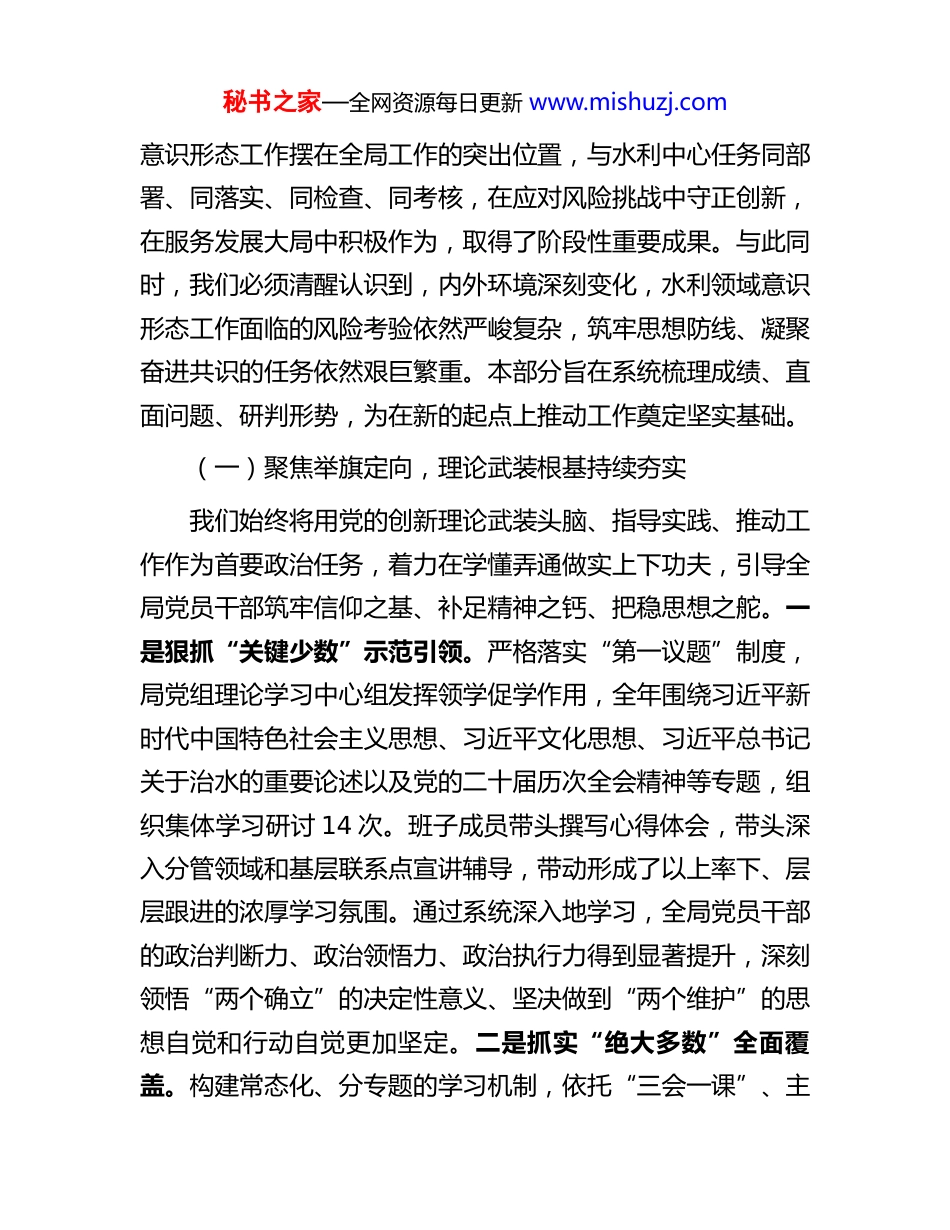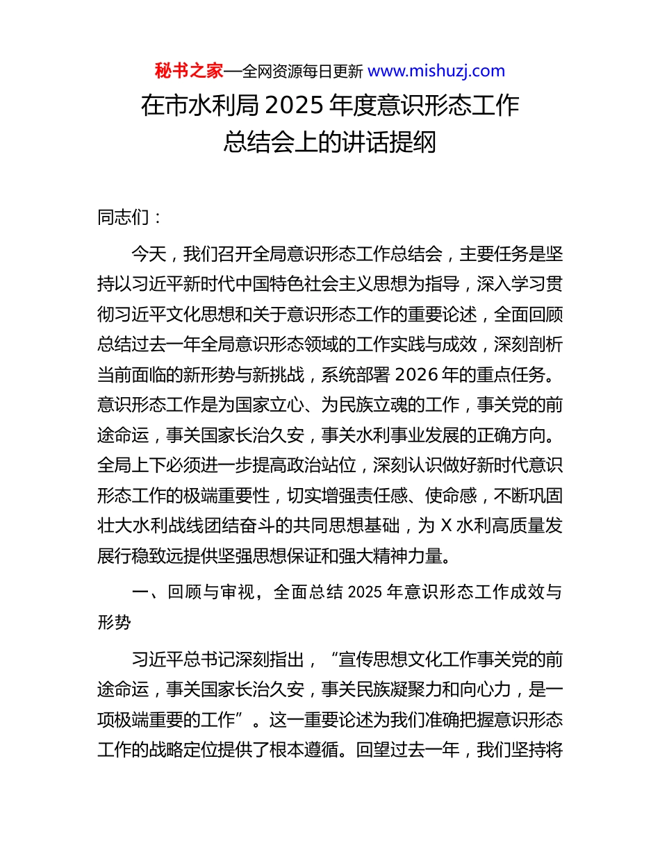 秘书之家—全网资源每日更新 www.mishuzj.com在市水利局 2025 年度意识形态工作总结会上的讲话提纲同志们:今天,我们召开全局意识形态工作总结会,主要任务是坚持以习近平新时代中国特色社会主义思想为指导,深入学习贯彻习近平文化思想和关于意识形态工作的重要论述,全面回顾总结过去一年全局意识形态领域的工作实践与成效,深刻剖析当前面临的新形势与新挑战,系统部署 2026 年的重点任务。意识形态工作是为国家立心、为民族立魂的工作,事关党的前途命运,事关国家长治久安,事关水利事业发展的正确方向。全局上下必须进一步提高政治站位,深刻认识做好新时代意识形态工作的极端重要性,切实增强责任感、使命感,不断巩固壮大水利战线团结奋斗的共同思想基础,为 X 水利高质量发展行稳致远提供坚强思想保证和强大精神力量。一、回顾与审视,全面总结 2025 年意识形态工作成效与形势习近平总书记深刻指出,“宣传思想文化工作事关党的前途命运,事关国家长治久安,事关民族凝聚力和向心力,是一项极端重要的工作”。这一重要论述为我们准确把握意识形态工作的战略定位提供了根本遵循。回望过去一年,我们坚持将秘书之家—全网资源每日更新 www.mishuzj.com意识形态工作摆在全局工作的突出位置,与水利中心任务同部署、同落实、同检查、同考核,在应对风险挑战中守正创新,在服务发展大局中积极作为,取得了阶段性重要成果。与此同时,我们必须清醒认识到,内外环境深刻变化,水利领域意识形态工作面临的风险考验依然严峻复杂,筑牢思想防线、凝聚奋进共识的任务依然艰巨繁重。本部分旨在系统梳理成绩、直面问题、研判形势,为在新的起点上推动工作奠定坚实基础。(一)聚焦举旗定向,理论武装根基持续夯实我们始终将用党的创新理论武装头脑、指导实践、推动工作作为首要政治任务,着力在学懂弄通做实上下功夫,引导全局党员干部筑牢信仰之基、补足精神之钙、把稳思想之舵。一是狠抓“关键少数”示范引领。严格落实“第一议题”制度,局党组理论学习中心组发挥领学促学作用,全年围绕习近平新时代中国特色社会主义思想、习近平文化思想、习近平总书记关于治水的重要论述以及党的二十届历次全会精神等专题,组织集体学习研讨 14 次。班子成员带头撰写心得体会,带头深入分管领域和基层联系点宣讲辅导,带动形成了以上率下、层层跟进的浓厚学习氛围。通过系统深入地学习,全局党员干部的政治判断力、政治领悟力、政治执行力得到显著提升,深刻领悟“两个确立”的决定性意义、坚决做到“两个维护”的思想自觉和行动自觉更加坚定。二是抓实“绝大多数”全面覆盖。构建常态化、分专题的学习机制,依托“三会一课”、主秘书之家—全网资源每日更新 www.mishuzj.com题党日、青年理论学习小组、水利大讲堂等载体,组织全局党员干部集体学习 29 次。创新学习形式,综合运用专题辅导、在线学习、实地研学、知识竞赛等方式,增强理论学习的吸引力和感染力。特别是结合深入开展学习深入贯彻中央八项规定精神学习教育,组织观看警示教育片、召开警示教育会议 5次,开展专题交流研讨 6 次,引导党员干部在对照检视中强化纪律规矩意识,拧紧世界观、人生观、价值观的“总开关”。三是推动学用结合知行合一。坚持理论联系实际的马克思主义学风,着力将学习成果转化为推动新阶段水利高质量发展的思路举措和实际成效。围绕保障水安全、强化水资源刚性约束、建设幸福河湖等中心工作,组织开展专题调研和务虚研讨,形成了一批有价值的调研成果和政策建议。在应对水旱灾害防御、推进重大水利工程建设、强化河湖管理保护等急难险重任务中,全局党员干部自觉运用党的创新理论中蕴含的立场观点方法分析问题、解决问题,彰显了理论武装的强大实践力量。(二)聚焦责任落实,意识形态阵地稳固筑牢我们深刻认识到,意识形态领域看不见硝烟的战争无处不在,必须牢牢掌握领导权、管理权、话语权。一是全面压实主体责任链条。局党组切实履行意识形态工作全面领导责任,党组书记认真履行“第一责任人”职责,坚持亲自部署、亲自过问、亲自处置。班子成员严格履行“一岗双责”,将意识形态秘书...