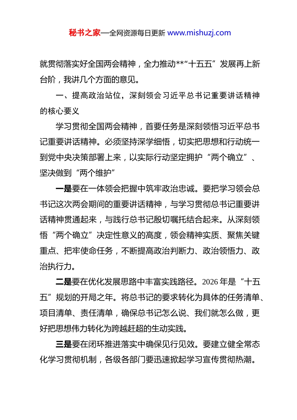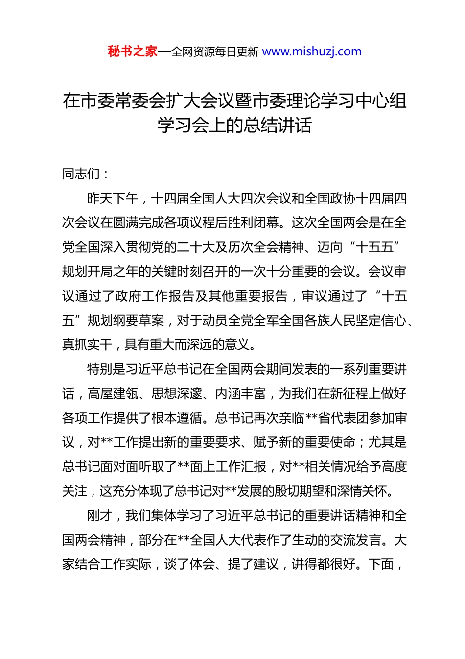 秘书之家—全网资源每日更新 www.mishuzj.com在市委常委会扩大会议暨市委理论学习中心组学习会上的总结讲话 同志们:昨天下午,十四届全国人大四次会议和全国政协十四届四次会议在圆满完成各项议程后胜利闭幕。这次全国两会是在全党全国深入贯彻党的二十大及历次全会精神、迈向“十五五”规划开局之年的关键时刻召开的一次十分重要的会议。会议审议通过了政府工作报告及其他重要报告,审议通过了“十五五”规划纲要草案,对于动员全党全军全国各族人民坚定信心、真抓实干,具有重大而深远的意义。特别是习近平总书记在全国两会期间发表的一系列重要讲话,高屋建瓴、思想深邃、内涵丰富,为我们在新征程上做好各项工作提供了根本遵循。总书记再次亲临**省代表团参加审议,对**工作提出新的重要要求、赋予新的重要使命;尤其是总书记面对面听取了**面上工作汇报,对**相关情况给予高度关注,这充分体现了总书记对**发展的殷切期望和深情关怀。刚才,我们集体学习了习近平总书记的重要讲话精神和全国两会精神,部分在**全国人大代表作了生动的交流发言。大家结合工作实际,谈了体会、提了建议,讲得都很好。下面,秘书之家—全网资源每日更新 www.mishuzj.com就贯彻落实好全国两会精神,全力推动**“十五五”发展再上新台阶,我讲几个方面的意见。一、提高政治站位,深刻领会习近平总书记重要讲话精神的核心要义学习贯彻全国两会精神,首要任务是深刻领悟习近平总书记重要讲话精神。必须坚持深学细悟,切实把思想和行动统一到党中央决策部署上来,以实际行动坚定拥护“两个确立”、坚决做到“两个维护”一是要在一体领会把握中筑牢政治忠诚。要把学习领会总书记这次两会期间的重要讲话精神,与学习贯彻总书记重要讲话精神贯通起来,与践行总书记殷切嘱托结合起来。从深刻领悟“两个确立”决定性意义的高度,领会精神实质、聚焦关键重点、把牢使命任务,不断提高政治判断力、政治领悟力、政治执行力。二是要在优化发展思路中丰富实践路径。2026 年是“十五五”规划的开局之年。将总书记的要求转化为具体的任务清单、项目清单、责任清单,确保总书记怎么说、我们就怎么做,更好把思想伟力转化为跨越赶超的生动实践。三是要在闭环推进落实中确保见行见效。要建立健全常态化学习贯彻机制,各级各部门要迅速掀起学习宣传贯彻热潮。秘书之家—全网资源每日更新 www.mishuzj.com通过领导带头学、深入系统学、知行合一学,切实学出对总书记的绝对忠诚,学出推动高质量发展的具体举措,学出为民增福祉的责任担当,确保党中央决策部署在**落地生根、开花结果。二、聚焦新质生产力,加快构建以先进制造业为骨干的现代化产业体系全国两会明确指出,2026 年经济增长目标设定在 4.5%至5.0%之间,城镇新增就业目标在 1200 万人以上。习近平总书记强调要“因地制宜发展新质生产力”。**必须紧紧抓牢这一核心要求,聚焦新型工业化不偏移、不飘然、不飘浮,加快产业向智能化、绿色化、融合化方向发展。一是要坚持创新驱动提升产业“含新量”。要深刻领会“在因地制宜发展新质生产力上走在前列”的重要要求。今年全市编排了 385 个重大产业项目,年度计划投资达 1674 亿元。要紧盯科技创新这个核心,加强关键核心技术攻关,推动**在集成电路、航空航天、生物医药、低空经济等新兴领域实现新突破。二是要深化数实融合提升产业“含智量”。要深入实施“智改数转网联”行动,推动传统产业高端化、智能化改造。鼓励企业开放人工智能应用场景,以数字技术赋能产业链供应秘书之家—全网资源每日更新 www.mishuzj.com链优化升级。2026 年我们要确保战略性新兴产业集群产值增长达到 9.1%以上,工业投资增长保持在 10%左右。三是要突出绿色转型提升产业“含绿量”。要锚定“双碳”目标,加快绿色能源产业布局。利用好**在氢能、盐穴压气储能等方面的优势,打造国家绿色工业园区。要确保单位国内生产总值二氧化碳排放降低 3.8%左右,以生态文明建设的新成效,为高质量发展增添最亮丽的底色。三、增强经济韧性,确保“十五五”规划开局之年实现高质量跨越赶超总书记强调要“在增强经济韧性上持续用...