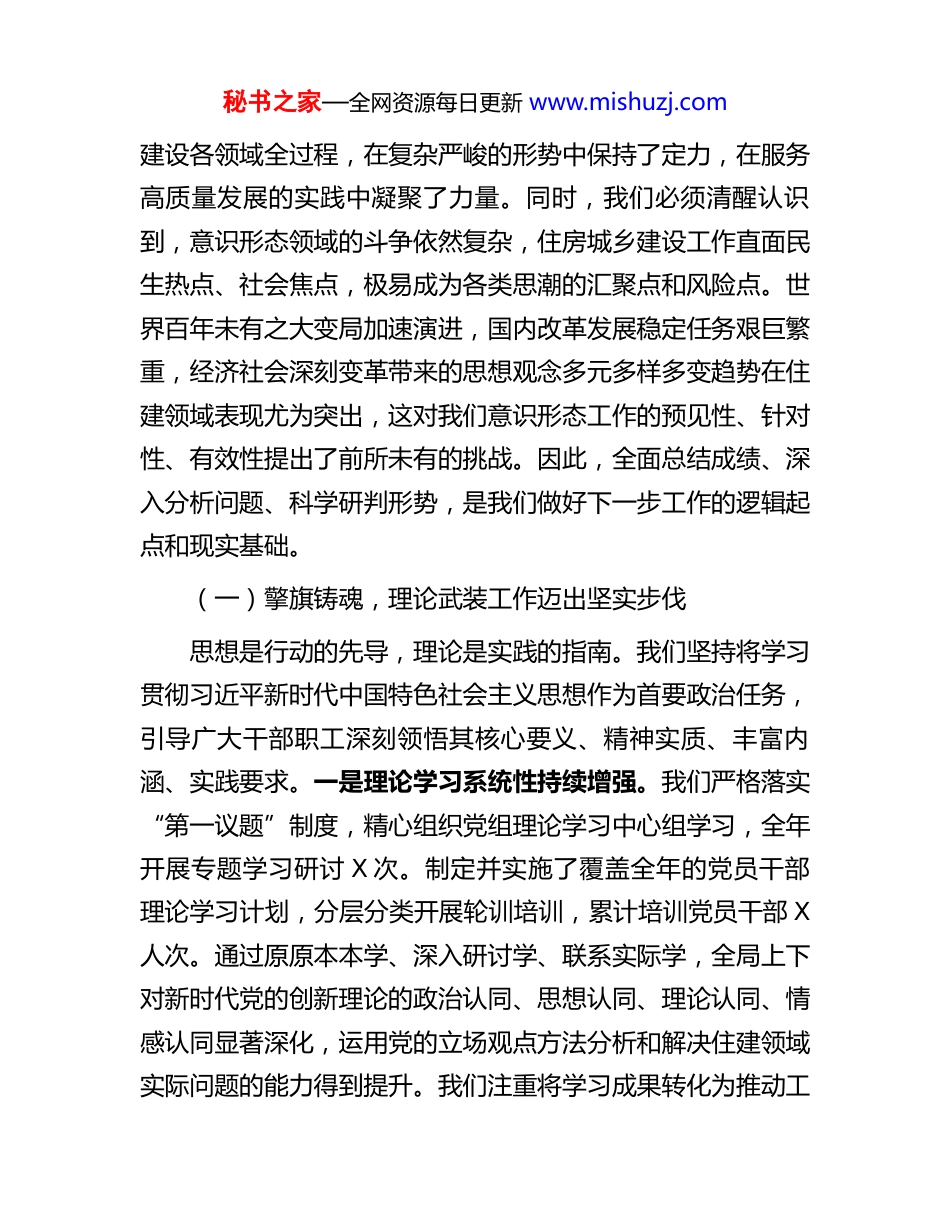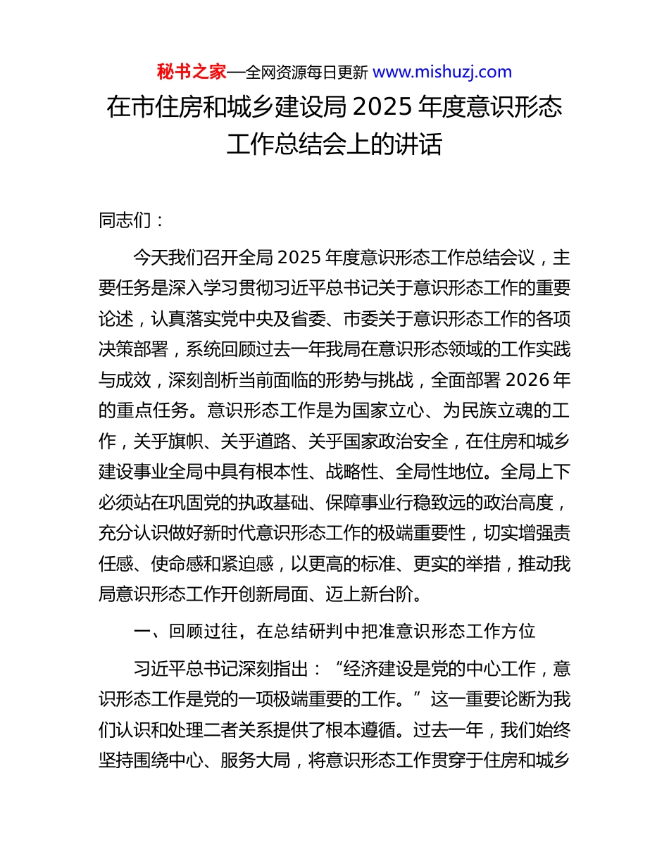 秘书之家—全网资源每日更新 www.mishuzj.com在市住房和城乡建设局 2025 年度意识形态工作总结会上的讲话同志们:今天我们召开全局 2025 年度意识形态工作总结会议,主要任务是深入学习贯彻习近平总书记关于意识形态工作的重要论述,认真落实党中央及省委、市委关于意识形态工作的各项决策部署,系统回顾过去一年我局在意识形态领域的工作实践与成效,深刻剖析当前面临的形势与挑战,全面部署 2026 年的重点任务。意识形态工作是为国家立心、为民族立魂的工作,关乎旗帜、关乎道路、关乎国家政治安全,在住房和城乡建设事业全局中具有根本性、战略性、全局性地位。全局上下必须站在巩固党的执政基础、保障事业行稳致远的政治高度,充分认识做好新时代意识形态工作的极端重要性,切实增强责任感、使命感和紧迫感,以更高的标准、更实的举措,推动我局意识形态工作开创新局面、迈上新台阶。一、回顾过往,在总结研判中把准意识形态工作方位习近平总书记深刻指出:“经济建设是党的中心工作,意识形态工作是党的一项极端重要的工作。”这一重要论断为我们认识和处理二者关系提供了根本遵循。过去一年,我们始终坚持围绕中心、服务大局,将意识形态工作贯穿于住房和城乡秘书之家—全网资源每日更新 www.mishuzj.com建设各领域全过程,在复杂严峻的形势中保持了定力,在服务高质量发展的实践中凝聚了力量。同时,我们必须清醒认识到,意识形态领域的斗争依然复杂,住房城乡建设工作直面民生热点、社会焦点,极易成为各类思潮的汇聚点和风险点。世界百年未有之大变局加速演进,国内改革发展稳定任务艰巨繁重,经济社会深刻变革带来的思想观念多元多样多变趋势在住建领域表现尤为突出,这对我们意识形态工作的预见性、针对性、有效性提出了前所未有的挑战。因此,全面总结成绩、深入分析问题、科学研判形势,是我们做好下一步工作的逻辑起点和现实基础。(一)擎旗铸魂,理论武装工作迈出坚实步伐思想是行动的先导,理论是实践的指南。我们坚持将学习贯彻习近平新时代中国特色社会主义思想作为首要政治任务,引导广大干部职工深刻领悟其核心要义、精神实质、丰富内涵、实践要求。一是理论学习系统性持续增强。我们严格落实“第一议题”制度,精心组织党组理论学习中心组学习,全年开展专题学习研讨 X 次。制定并实施了覆盖全年的党员干部理论学习计划,分层分类开展轮训培训,累计培训党员干部 X人次。通过原原本本学、深入研讨学、联系实际学,全局上下对新时代党的创新理论的政治认同、思想认同、理论认同、情感认同显著深化,运用党的立场观点方法分析和解决住建领域实际问题的能力得到提升。我们注重将学习成果转化为推动工秘书之家—全网资源每日更新 www.mishuzj.com作的具体思路和举措,围绕“人民城市人民建、人民城市为人民”等重要理念,开展专题调研 X 项,形成了一批有深度、有价值的调研报告和政策建议,为市委、市政府决策提供了参考。二是理想信念教育针对性有效提升。我们紧扣住建行业特点,深入开展社会主义核心价值观宣传教育,将其融入工程质量安全监管、房地产市场秩序规范、城乡历史文化保护等具体业务工作中。组织开展“弘扬工匠精神、建设精品工程”等主题教育活动,选树宣传行业先进典型 X 名,营造了崇尚实干、担当作为的良好氛围。利用重要节日、纪念日,组织开展形式多样的爱国主义、集体主义、社会主义教育活动,传承红色基因,赓续精神血脉。加强对青年干部的思想引导,建立常态化的谈心谈话机制,帮助他们扣好职业生涯“第一粒扣子”,筑牢信仰之基、补足精神之钙、把稳思想之舵。三是学用结合紧密性不断强化。我们坚决反对理论学习中的形式主义,大力弘扬理论联系实际的马克思主义学风。坚持把研究解决改革发展稳定的重大问题、人民群众反映强烈的突出问题、党的建设面临的紧迫问题作为学习的着眼点和落脚点。例如,在贯彻落实中央关于促进房地产市场平稳健康发展决策部署过程中,我们首先组织深入学习领会其精神实质和政策内涵,再结合本市实际研究制定具体落实方案,确保了政策执行不偏向、不走样。通过持续强化理论武装,全局干部职工...