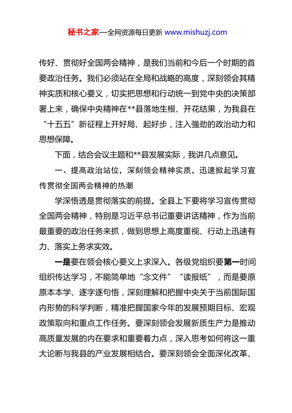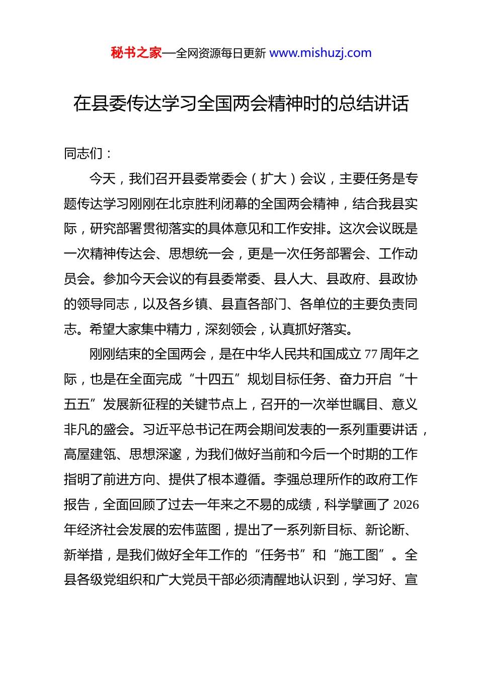 秘书之家—全网资源每日更新 www.mishuzj.com在县委传达学习全国两会精神时的总结讲话 同志们:今天,我们召开县委常委会(扩大)会议,主要任务是专题传达学习刚刚在北京胜利闭幕的全国两会精神,结合我县实际,研究部署贯彻落实的具体意见和工作安排。这次会议既是一次精神传达会、思想统一会,更是一次任务部署会、工作动员会。参加今天会议的有县委常委、县人大、县政府、县政协的领导同志,以及各乡镇、县直各部门、各单位的主要负责同志。希望大家集中精力,深刻领会,认真抓好落实。刚刚结束的全国两会,是在中华人民共和国成立 77 周年之际,也是在全面完成“十四五”规划目标任务、奋力开启“十五五”发展新征程的关键节点上,召开的一次举世瞩目、意义非凡的盛会。习近平总书记在两会期间发表的一系列重要讲话,高屋建瓴、思想深邃,为我们做好当前和今后一个时期的工作指明了前进方向、提供了根本遵循。李强总理所作的政府工作报告,全面回顾了过去一年来之不易的成绩,科学擘画了 2026年经济社会发展的宏伟蓝图,提出了一系列新目标、新论断、新举措,是我们做好全年工作的“任务书”和“施工图”。全县各级党组织和广大党员干部必须清醒地认识到,学习好、宣秘书之家—全网资源每日更新 www.mishuzj.com传好、贯彻好全国两会精神,是我们当前和今后一个时期的首要政治任务。我们必须站在全局和战略的高度,深刻领会其精神实质和核心要义,切实把思想和行动统一到党中央的决策部署上来,确保中央精神在**县落地生根、开花结果,为我县在“十五五”新征程上开好局、起好步,注入强劲的政治动力和思想保障。下面,结合会议主题和**县发展实际,我讲几点意见。一、提高政治站位,深刻领会精神实质,迅速掀起学习宣传贯彻全国两会精神的热潮学深悟透是贯彻落实的前提。全县上下要将学习宣传贯彻全国两会精神,特别是习近平总书记重要讲话精神,作为当前最重要的政治任务来抓,做到思想上高度重视、行动上迅速有力、落实上务求实效。一是要在领会核心要义上求深入。各级党组织要第一时间组织传达学习,不能简单地“念文件”“读报纸”,而是要原原本本学、逐字逐句悟,深刻理解和把握中央关于当前国际国内形势的科学判断,精准把握国家今年的发展预期目标、宏观政策取向和重点工作任务。要深刻领会发展新质生产力是推动高质量发展的内在要求和重要着力点,深入思考如何将这一重大论断与我县的产业发展相结合。要深刻领会全面深化改革、秘书之家—全网资源每日更新 www.mishuzj.com扩大高水平对外开放的坚定决心,思考我们如何在新一轮发展中抢抓机遇。要深刻领会保障和改善民生、加强和创新社会治理的部署要求,思考如何让我们发展的成果更多更公平地惠及全县人民。通过深学细悟,真正吃透精神实质,把握政策导向,明确实践要求,切实把学习的成效,转化为解决现实问题的能力、谋划未来工作的思路、推动跨越发展的具体举措。二是要在广泛宣传宣讲上求覆盖。宣传部门要牵头抓总,统筹运用好县融媒体中心的各类平台,开设专题专栏,全方位、多角度、深层次地宣传解读两会精神,及时报道全县各级各部门学习贯彻的进展和成效。要组织精干力量,成立宣讲团,深入企业、农村、机关、校园、社区,用群众听得懂的语言、喜闻乐见的形式,把两会的“大政策”转化为群众关心的“小道理”,把宏观的“国之大者”与我们**的“县之大计”“民之大事”紧密结合起来,推动两会精神入脑入心、家喻户晓,凝聚起全县上下奋进新征程、建功新时代的磅礴力量。三是要在学用结合转化上求实效。学习的目的全在于运用。全县各级领导干部要发挥“头雁效应”,带头学习、带头思考、带头贯彻。要把学习贯彻两会精神与巩固拓展主题教育成果结合起来,与我们正在推进的各项重点工作结合起来,坚持问题导向、目标导向、结果导向,紧密联系本乡镇、本部门的工作秘书之家—全网资源每日更新 www.mishuzj.com实际,深入开展调查研究,认真查找我们工作中存在的短板和不足,研究提出贯彻落实的具体措施。要坚决防止学习和实践“两张皮”,绝不能满足于开了会、学了文件,必须将学习成果转化为推动工作的...