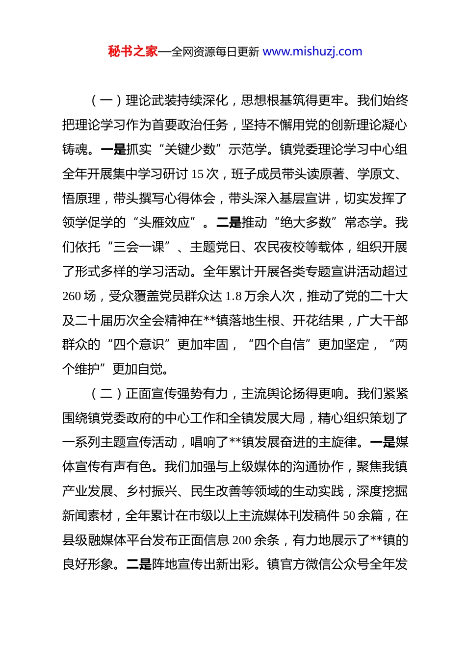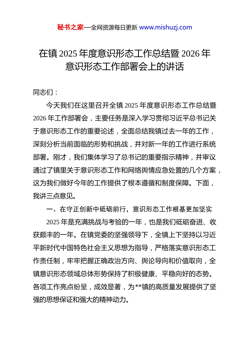 秘书之家—全网资源每日更新 www.mishuzj.com在镇 2025 年度意识形态工作总结暨 2026 年意识形态工作部署会上的讲话 同志们:今天我们在这里召开全镇 2025 年度意识形态工作总结暨2026 年工作部署会,主要任务是深入学习贯彻习近平总书记关于意识形态工作的重要论述,全面总结我镇过去一年的工作,深刻分析当前面临的形势和挑战,并对新一年的工作进行系统部署。刚才,我们集体学习了总书记的重要指示精神,并审议通过了镇里关于意识形态工作和网络舆情应急处置的几个方案,这为我们做好今年的工作提供了根本遵循和制度保障。下面,我讲三点意见。一、在守正创新中砥砺前行,意识形态工作根基更加坚实2025 年是充满挑战与考验的一年,也是我们砥砺奋进、收获颇丰的一年。在镇党委的坚强领导下,全镇上下坚持以习近平新时代中国特色社会主义思想为指导,严格落实意识形态工作责任制,牢牢把握正确政治方向、舆论导向和价值取向,全镇意识形态领域总体形势保持了积极健康、平稳向好的态势。各项工作亮点纷呈,成效显著,为**镇的高质量发展提供了坚强的思想保证和强大的精神动力。秘书之家—全网资源每日更新 www.mishuzj.com(一)理论武装持续深化,思想根基筑得更牢。我们始终把理论学习作为首要政治任务,坚持不懈用党的创新理论凝心铸魂。一是抓实“关键少数”示范学。镇党委理论学习中心组全年开展集中学习研讨 15 次,班子成员带头读原著、学原文、悟原理,带头撰写心得体会,带头深入基层宣讲,切实发挥了领学促学的“头雁效应”。二是推动“绝大多数”常态学。我们依托“三会一课”、主题党日、农民夜校等载体,组织开展了形式多样的学习活动。全年累计开展各类专题宣讲活动超过260 场,受众覆盖党员群众达 1.8 万余人次,推动了党的二十大及二十届历次全会精神在**镇落地生根、开花结果,广大干部群众的“四个意识”更加牢固,“四个自信”更加坚定,“两个维护”更加自觉。(二)正面宣传强势有力,主流舆论扬得更响。我们紧紧围绕镇党委政府的中心工作和全镇发展大局,精心组织策划了一系列主题宣传活动,唱响了**镇发展奋进的主旋律。一是媒体宣传有声有色。我们加强与上级媒体的沟通协作,聚焦我镇产业发展、乡村振兴、民生改善等领域的生动实践,深度挖掘新闻素材,全年累计在市级以上主流媒体刊发稿件 50 余篇,在县级融媒体平台发布正面信息 200 余条,有力地展示了**镇的良好形象。二是阵地宣传出新出彩。镇官方微信公众号全年发秘书之家—全网资源每日更新 www.mishuzj.com布信息超过 1000 条,总阅读量突破 30 万人次,成为传递政策、服务群众、展示形象的重要窗口。我们成功举办了“奋进中的**”主题图片展和年度成果汇报会等活动,全方位、多角度地展现了全镇人民团结奋斗的精神风貌,极大地提振了发展信心。(三)价值引领深入人心,文明新风育得更浓。我们坚持以社会主义核心价值观为引领,持续深化群众性精神文明创建活动,推动文明乡风、良好家风、淳朴民风在**镇蔚然成风。一是典型引路作用彰显。我们广泛开展了“最美家庭”“道德模范”“身边好人”等评选表彰活动,全年共选树出各级各类先进典型 62 名。通过举办事迹报告会、制作宣传展板等方式,大力宣传他们的感人事迹,用榜样的力量引导广大群众见贤思齐、崇德向善。二是文明实践活动丰富。全镇各村(社区)新时代文明实践站(所)功能不断完善,全年组织开展理论宣讲、文化惠民、扶贫帮困等志愿服务活动 400 余场次,服务群众超过 2 万人次,打通了宣传群众、教育群众、关心群众、服务群众的“最后一公里”。(四)阵地管理规范有序,安全防线守得更稳。我们严格落实“谁主管、谁负责”和属地管理原则,全面加强对各类意识形态阵地的管理。一是线下阵地管得住。对全镇范围内的报告会、研讨会、讲座论坛等活动实行严格的审批报备制度,确秘书之家—全网资源每日更新 www.mishuzj.com保各类阵地可管可控。加强对文化市场、出版物市场的监管,坚决抵制和清除各类非法出版物和有害信息。二是线上空间控得牢。我们建立了由宣传、公安、综治等部门组成的网络舆情联合研...