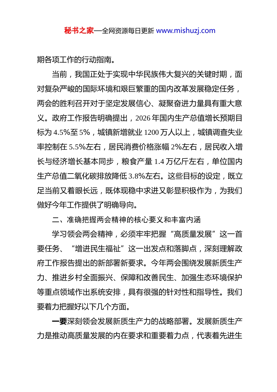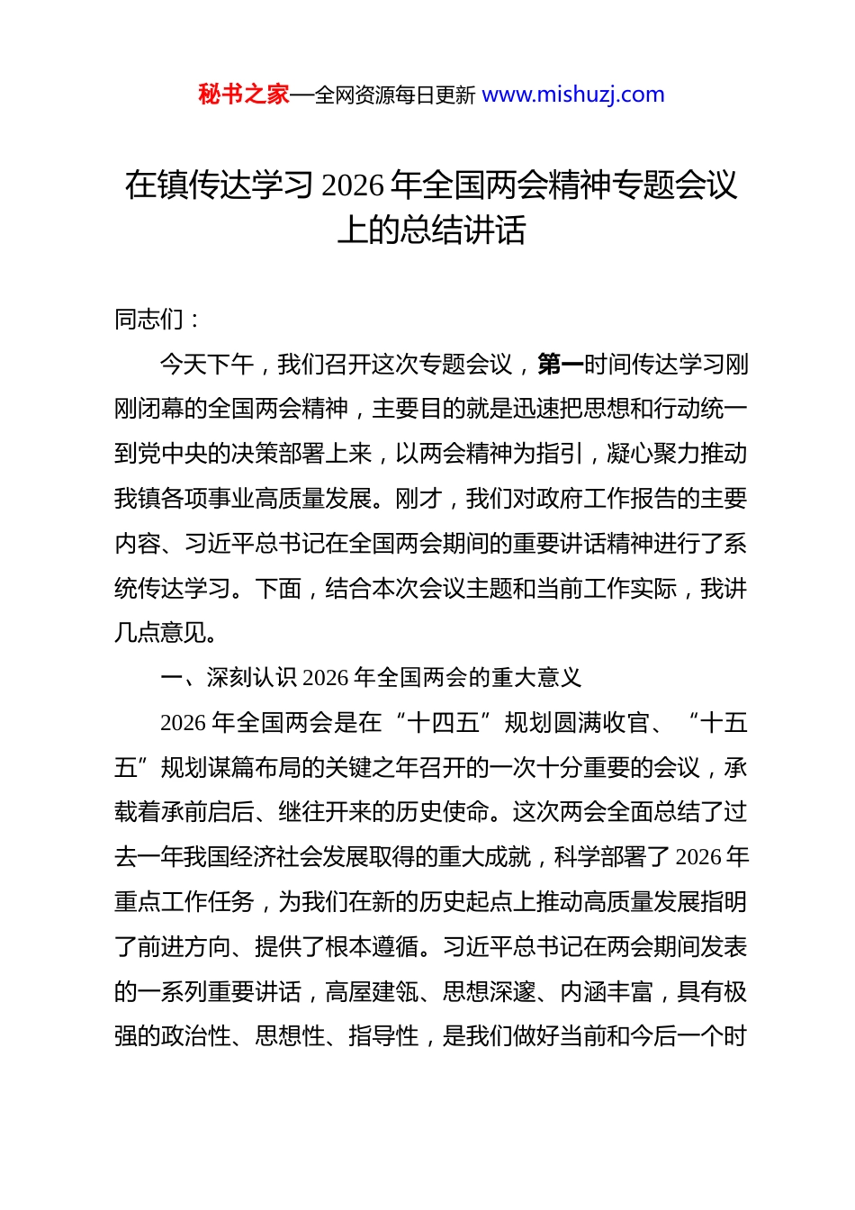 秘书之家—全网资源每日更新 www.mishuzj.com在镇传达学习 2026 年全国两会精神专题会议上的总结讲话 同志们:今天下午,我们召开这次专题会议,第一时间传达学习刚刚闭幕的全国两会精神,主要目的就是迅速把思想和行动统一到党中央的决策部署上来,以两会精神为指引,凝心聚力推动我镇各项事业高质量发展。刚才,我们对政府工作报告的主要内容、习近平总书记在全国两会期间的重要讲话精神进行了系统传达学习。下面,结合本次会议主题和当前工作实际,我讲几点意见。一、深刻认识 2026 年全国两会的重大意义2026 年全国两会是在“十四五”规划圆满收官、“十五五”规划谋篇布局的关键之年召开的一次十分重要的会议,承载着承前启后、继往开来的历史使命。这次两会全面总结了过去一年我国经济社会发展取得的重大成就,科学部署了 2026 年重点工作任务,为我们在新的历史起点上推动高质量发展指明了前进方向、提供了根本遵循。习近平总书记在两会期间发表的一系列重要讲话,高屋建瓴、思想深邃、内涵丰富,具有极强的政治性、思想性、指导性,是我们做好当前和今后一个时秘书之家—全网资源每日更新 www.mishuzj.com期各项工作的行动指南。当前,我国正处于实现中华民族伟大复兴的关键时期,面对复杂严峻的国际环境和艰巨繁重的国内改革发展稳定任务,两会的胜利召开对于坚定发展信心、凝聚奋进力量具有重大意义。政府工作报告明确提出,2026 年国内生产总值增长预期目标为 4.5%至 5%,城镇新增就业 1200 万人以上,城镇调查失业率控制在 5.5%左右,居民消费价格涨幅 2%左右,居民收入增长与经济增长基本同步,粮食产量 1.4 万亿斤左右,单位国内生产总值二氧化碳排放降低 3.8%左右。这些目标的设定,既立足当前又着眼长远,既体现稳中求进又彰显积极作为,为我们做好今年工作提供了明确导向。二、准确把握两会精神的核心要义和丰富内涵学习领会两会精神,必须牢牢把握“高质量发展”这一首要任务、“增进民生福祉”这一出发点和落脚点,深刻理解政府工作报告提出的新部署新要求。今年两会围绕发展新质生产力、推进乡村全面振兴、保障和改善民生、加强生态环境保护等重点领域作出系统安排,具有很强的针对性和指导性。我们要着力把握好以下几个方面。一要深刻领会发展新质生产力的战略部署。发展新质生产力是推动高质量发展的内在要求和重要着力点,代表着先进生秘书之家—全网资源每日更新 www.mishuzj.com产力的演进方向。2026 年中央一号文件首次明确提出“因地制宜发展农业新质生产力”,强调推动人工智能与农业发展相结合,拓展无人机、物联网、机器人等应用场景,加快农业生物制造关键技术创新。对于我镇而言,要积极探索智慧农业、精准农业发展路径,推动传统农业向数字化、智能化、绿色化方向转型升级,让科技创新真正成为驱动乡村产业振兴的强大引擎。要将新质生产力发展理念融入全镇经济社会发展全过程,以科技创新引领产业创新,以要素优化配置激发发展活力。二要深刻领会推进乡村全面振兴的重点任务。乡村振兴是实现农业农村现代化的必然要求,是全面建设社会主义现代化国家的重大历史任务。两会明确要求统筹推进新型城镇化和乡村全面振兴,加快农业农村现代化,提高城乡区域协调发展水平。我们要始终把“三农”工作摆在重中之重的位置,巩固拓展脱贫攻坚成果同乡村振兴有效衔接,健全防止返贫动态监测和常态化帮扶机制,坚决守住不发生规模性返贫的底线。要聚焦产业振兴这个关键,大力发展特色优势产业,延伸农畜产品产业链条,促进一二三产业融合发展,持续壮大村级集体经济,拓宽农民增收致富渠道。三要深刻领会保障和改善民生的根本要求。民生是最大的政治,增进民生福祉是发展的根本目的。两会强调要把保障和秘书之家—全网资源每日更新 www.mishuzj.com改善民生放在突出位置,着力解决人民群众急难愁盼问题。我们要始终坚持以人民为中心的发展思想,用心用情用力办好就业、教育、医疗、养老等民生实事,持续提升公共服务供给质量,不断增强人民群众的获得感、幸福感、安全感。要重点关注困难群体、特殊群体的基本生活保障,健全分层分类的...