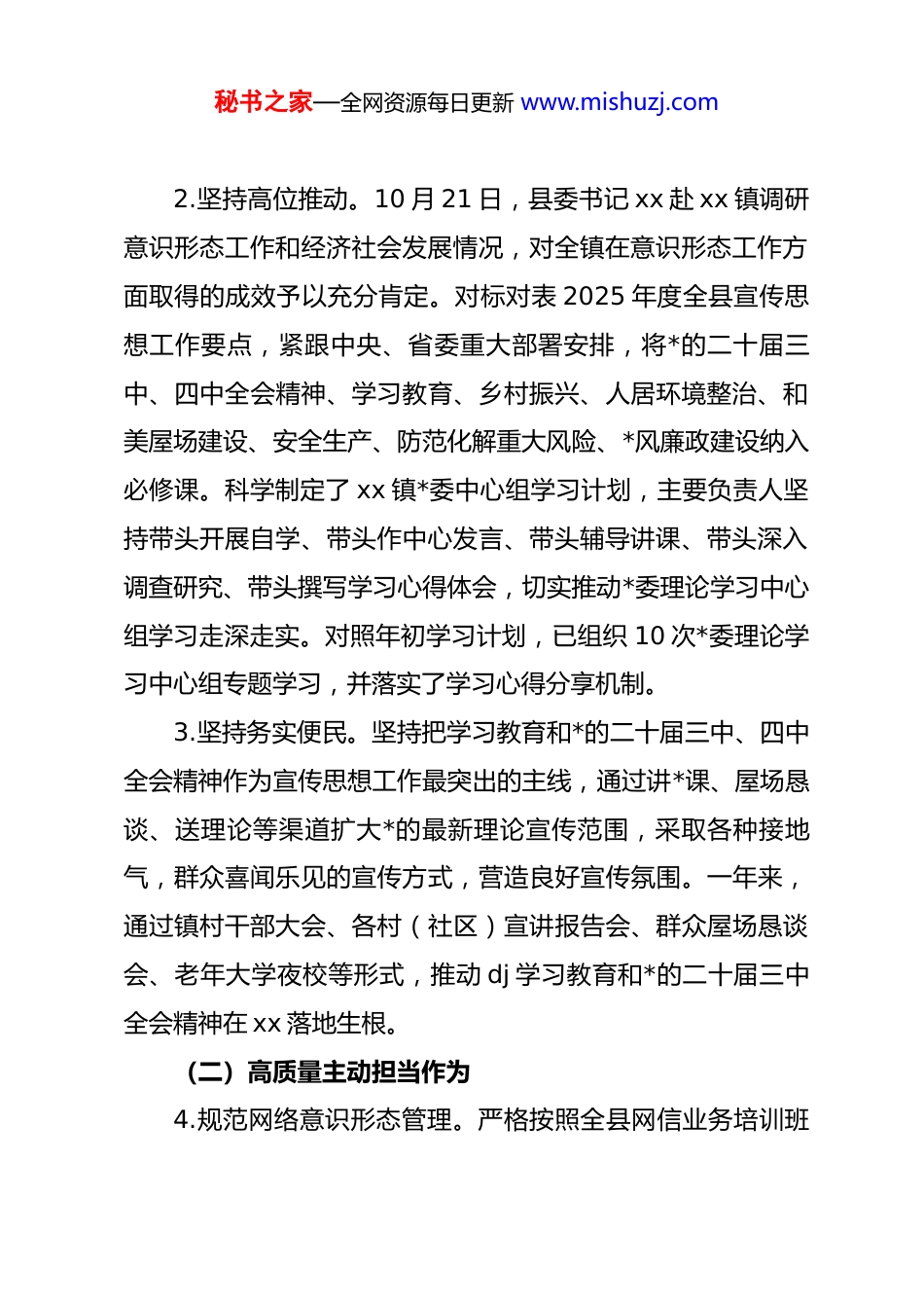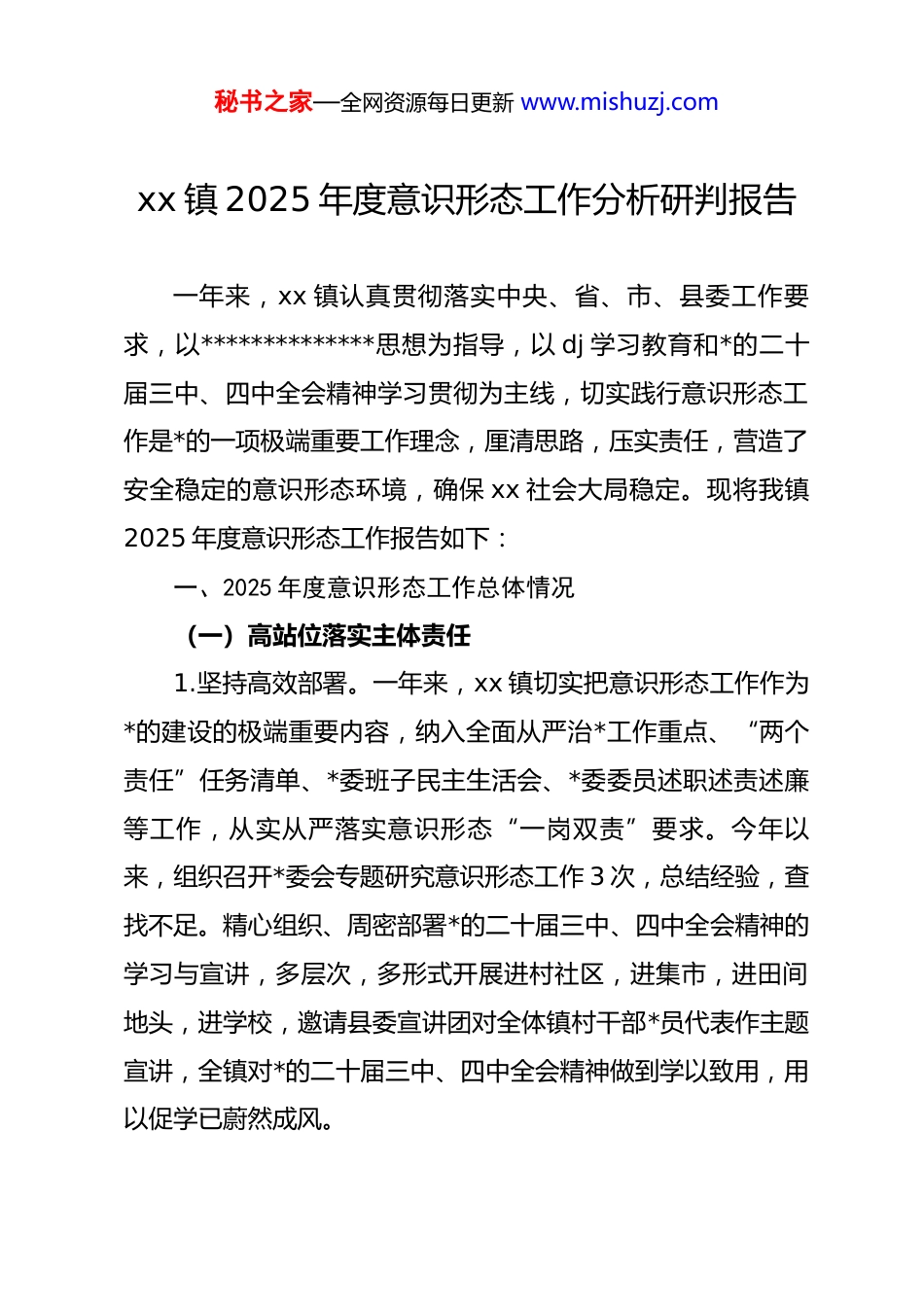 秘书之家—全网资源每日更新 www.mishuzj.comxx 镇 2025 年度意识形态工作分析研判报告一年来,xx 镇认真贯彻落实中央、省、市、县委工作要求,以**************思想为指导,以 dj 学习教育和*的二十届三中、四中全会精神学习贯彻为主线,切实践行意识形态工作是*的一项极端重要工作理念,厘清思路,压实责任,营造了安全稳定的意识形态环境,确保 xx 社会大局稳定。现将我镇2025 年度意识形态工作报告如下:一、2025 年度意识形态工作总体情况(一)高站位落实主体责任1.坚持高效部署。一年来,xx 镇切实把意识形态工作作为*的建设的极端重要内容,纳入全面从严治*工作重点、“两个责任”任务清单、*委班子民主生活会、*委委员述职述责述廉等工作,从实从严落实意识形态“一岗双责”要求。今年以来,组织召开*委会专题研究意识形态工作 3 次,总结经验,查找不足。精心组织、周密部署*的二十届三中、四中全会精神的学习与宣讲,多层次,多形式开展进村社区,进集市,进田间地头,进学校,邀请县委宣讲团对全体镇村干部*员代表作主题宣讲,全镇对*的二十届三中、四中全会精神做到学以致用,用以促学已蔚然成风。秘书之家—全网资源每日更新 www.mishuzj.com2.坚持高位推动。10 月 21 日,县委书记 xx 赴 xx 镇调研意识形态工作和经济社会发展情况,对全镇在意识形态工作方面取得的成效予以充分肯定。对标对表 2025 年度全县宣传思想工作要点,紧跟中央、省委重大部署安排,将*的二十届三中、四中全会精神、学习教育、乡村振兴、人居环境整治、和美屋场建设、安全生产、防范化解重大风险、*风廉政建设纳入必修课。科学制定了 xx 镇*委中心组学习计划,主要负责人坚持带头开展自学、带头作中心发言、带头辅导讲课、带头深入调查研究、带头撰写学习心得体会,切实推动*委理论学习中心组学习走深走实。对照年初学习计划,已组织 10 次*委理论学习中心组专题学习,并落实了学习心得分享机制。3.坚持务实便民。坚持把学习教育和*的二十届三中、四中全会精神作为宣传思想工作最突出的主线,通过讲*课、屋场恳谈、送理论等渠道扩大*的最新理论宣传范围,采取各种接地气,群众喜闻乐见的宣传方式,营造良好宣传氛围。一年来,通过镇村干部大会、各村(社区)宣讲报告会、群众屋场恳谈会、老年大学夜校等形式,推动 dj 学习教育和*的二十届三中全会精神在 xx 落地生根。(二)高质量主动担当作为4.规范网络意识形态管理。严格按照全县网信业务培训班秘书之家—全网资源每日更新 www.mishuzj.com要求,坚决维护网络意识形态安全,把牢网上意识形态斗争主动权,严格落实新闻稿件“三审”制,及时处置网上负面舆情,重点做好网上信访回复工作。今年以来,及时快速有效处置了石仓村邻里占地纠纷等舆情 3 起。5、强化阵地建设。结合 xx 镇新时代文明实践所和 12 个村(社区)的新时代文明实践站开展各类志愿活动,高标准创建了黄泥村、群英社区新时代文明实践站,组建了 13 支“xx群众”志愿服务队,xx 镇新时代文明实践所作用发挥明显,建立起教育管理*员和宣传服务群众的红色阵地。6、强化队伍建设。通过思想引领、教育培训,打造立场坚定、本领过硬、敢于亮剑的意识形态网宣干部人才队伍。目前,各村(社区)都配备了一名素质高、业务能力强的宣传专干,举办了一期村级宣传工作暨网信业务培训班,进一步规范村级宣传网信工作。(三)高标准强化思想引领7、涵养新风正气。讲好 xx 故事,传播 xx 声音,践行社会主义核心价值观,倡导文明新风。今年以来,全镇人民团结一心,慷慨解囊,踊跃捐资,对镇区内主要道路进行提质改造,汇聚了“爱我 xx、建设 xx”的强大合力。在全镇充分利用广场 led 大型户外电子屏开展旅发大会宣传,督促村、社区沿秘书之家—全网资源每日更新 www.mishuzj.com线电子屏刊载旅发大会宣传标语。贯彻落实加强新时代农村思想文化建设举措,发挥基层治理作用,深入开展“移风易俗、弘扬新风”行动,指导各村(社区)建立完善了基层自治队伍,乡贤理事会、红白理事会、禁毒禁赌会等村民自治队伍作用彰显。8、强化志愿服...