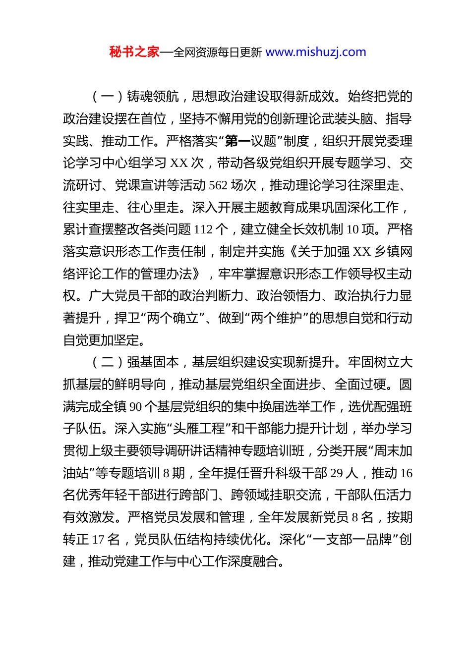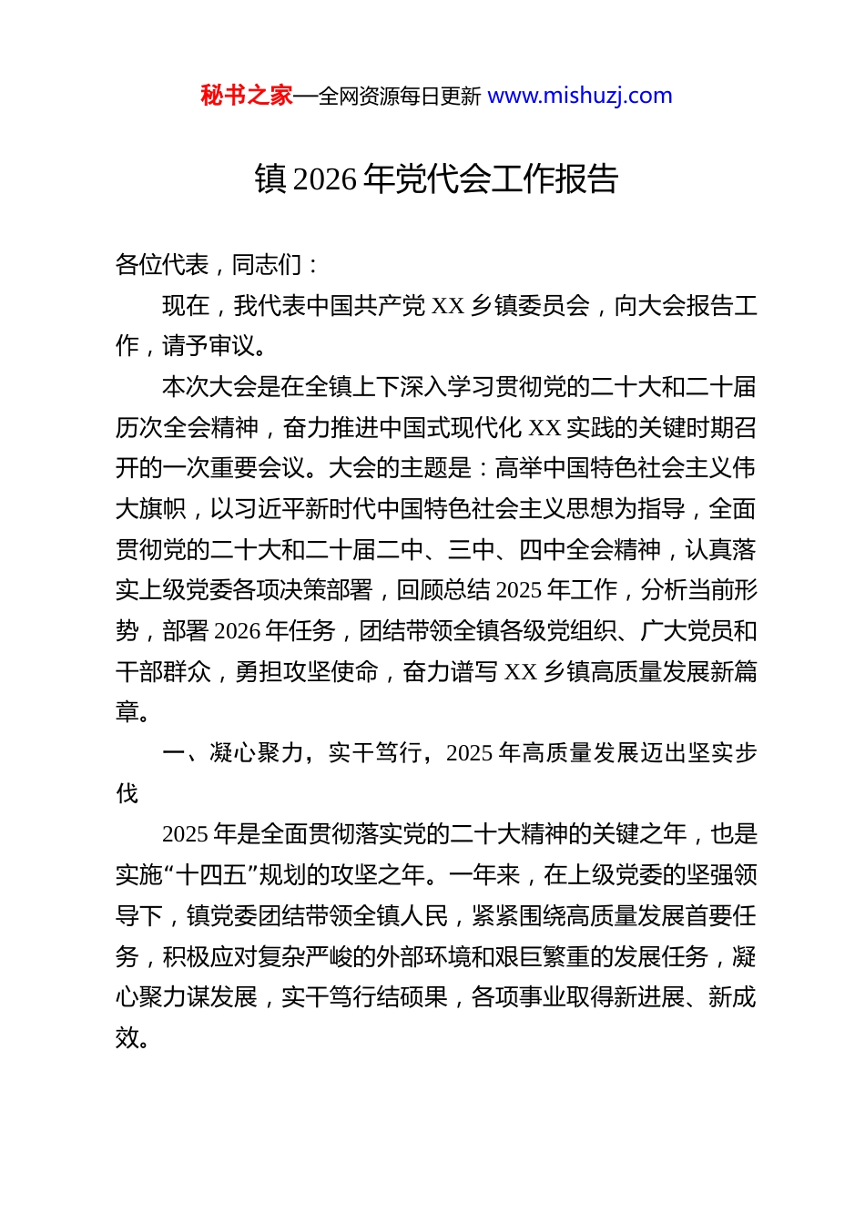 秘书之家—全网资源每日更新 www.mishuzj.com镇 2026 年党代会工作报告 各位代表,同志们:现在,我代表中国共产党 XX 乡镇委员会,向大会报告工作,请予审议。本次大会是在全镇上下深入学习贯彻党的二十大和二十届历次全会精神,奋力推进中国式现代化 XX 实践的关键时期召开的一次重要会议。大会的主题是:高举中国特色社会主义伟大旗帜,以习近平新时代中国特色社会主义思想为指导,全面贯彻党的二十大和二十届二中、三中、四中全会精神,认真落实上级党委各项决策部署,回顾总结 2025 年工作,分析当前形势,部署 2026 年任务,团结带领全镇各级党组织、广大党员和干部群众,勇担攻坚使命,奋力谱写 XX 乡镇高质量发展新篇章。一、凝心聚力,实干笃行,2025 年高质量发展迈出坚实步伐2025 年是全面贯彻落实党的二十大精神的关键之年,也是“”实施 十四五 规划的攻坚之年。一年来,在上级党委的坚强领导下,镇党委团结带领全镇人民,紧紧围绕高质量发展首要任务,积极应对复杂严峻的外部环境和艰巨繁重的发展任务,凝心聚力谋发展,实干笃行结硕果,各项事业取得新进展、新成效。秘书之家—全网资源每日更新 www.mishuzj.com(一)铸魂领航,思想政治建设取得新成效。始终把党的政治建设摆在首位,坚持不懈用党的创新理论武装头脑、指导“实践、推动工作。严格落实 第一”议题 制度,组织开展党委理论学习中心组学习 XX 次,带动各级党组织开展专题学习、交流研讨、党课宣讲等活动 562 场次,推动理论学习往深里走、往实里走、往心里走。深入开展主题教育成果巩固深化工作,累计查摆整改各类问题 112 个,建立健全长效机制 10 项。严格落实意识形态工作责任制,制定并实施《关于加强 XX 乡镇网络评论工作的管理办法》,牢牢掌握意识形态工作领导权主动权。广大党员干部的政治判断力、政治领悟力、政治执行力显“”“”著提升,捍卫 两个确立 、做到 两个维护 的思想自觉和行动自觉更加坚定。(二)强基固本,基层组织建设实现新提升。牢固树立大抓基层的鲜明导向,推动基层党组织全面进步、全面过硬。圆满完成全镇 90 个基层党组织的集中换届选举工作,选优配强班“”子队伍。深入实施 头雁工程 和干部能力提升计划,举办学习“贯彻上级主要领导调研讲话精神专题培训班,分类开展 周末加”油站 等专题培训 8 期,全年提任晋升科级干部 29 人,推动 16名优秀年轻干部进行跨部门、跨领域挂职交流,干部队伍活力有效激发。严格党员发展和管理,全年发展新党员 8 名,按期转正 17“”名,党员队伍结构持续优化。深化 一支部一品牌 创建,推动党建工作与中心工作深度融合。秘书之家—全网资源每日更新 www.mishuzj.com(三)正风肃纪,全面从严治党展现新作为。坚决扛起管党治党政治责任,纵深推进党风廉政建设和反腐败斗争。高质量完成上级巡察反馈意见整改,落实整改措施 231 条,修订完善制度机制 10“”项,做好巡察 后半篇文章 。精准运用监督执“”纪 四种形态 ,依规依纪依法给予党纪政务处分 14 人,开展诫勉谈话、提醒谈话 10 人次,抓早抓小、防微杜渐。坚持严管和“”厚爱结合、激励和约束并重,认真落实 三个区分开来 要求,为 2 名在改革探索、推动发展中出于公心、担当作为而出现工作失误的干部予以容错免责,旗帜鲜明地为敢于担当、踏实做事的干部撑腰鼓劲,营造了风清气正、干事创业的良好政治生态。(四)践行民主,全过程人民民主彰显新效能。坚持党的领导、人民当家作主、依法治国有机统一,不断丰富民主形“式,拓宽民主渠道。打造 石榴籽 e”家 等特色品牌,促进民族“”团结,联动高校开展 名企探岗 等活动,助力青年就业。高质量完成武装部规范化建设,成功创建三星级基层武装部,全年选送 2 名优秀青年光荣入伍。工会、共青团、妇联等群团组织“”桥梁纽带作用充分发挥,常态化开展 四季关爱 、职工劳动技“”能竞赛等活动,完成四个街区妇联组建及 活水园区 妇女组织覆盖工作,最广泛地凝聚了社会各界共识和力量。(五)聚焦发展,经济综合实力迈上新台阶。坚持发展是第一...