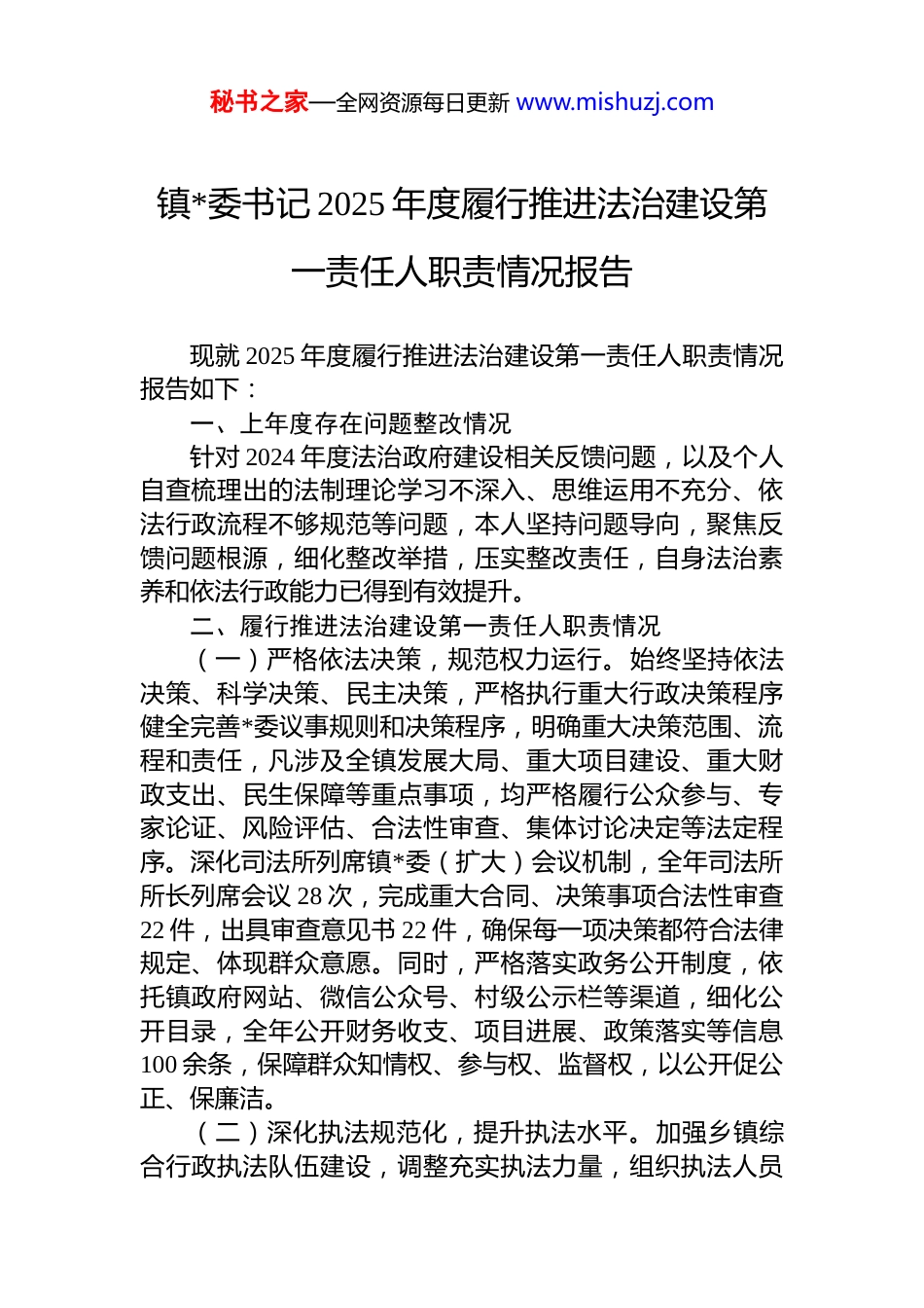 秘书之家—全网资源每日更新 www.mishuzj.com镇*委书记 2025 年度履行推进法治建设第一责任人职责情况报告现就 2025 年度履行推进法治建设第一责任人职责情况报告如下:一、上年度存在问题整改情况针对 2024 年度法治政府建设相关反馈问题,以及个人自查梳理出的法制理论学习不深入、思维运用不充分、依法行政流程不够规范等问题,本人坚持问题导向,聚焦反馈问题根源,细化整改举措,压实整改责任,自身法治素养和依法行政能力已得到有效提升。二、履行推进法治建设第一责任人职责情况(一)严格依法决策,规范权力运行。始终坚持依法决策、科学决策、民主决策,严格执行重大行政决策程序健全完善*委议事规则和决策程序,明确重大决策范围、流程和责任,凡涉及全镇发展大局、重大项目建设、重大财政支出、民生保障等重点事项,均严格履行公众参与、专家论证、风险评估、合法性审查、集体讨论决定等法定程序。深化司法所列席镇*委(扩大)会议机制,全年司法所所长列席会议 28 次,完成重大合同、决策事项合法性审查22 件,出具审查意见书 22 件,确保每一项决策都符合法律规定、体现群众意愿。同时,严格落实政务公开制度,依托镇政府网站、微信公众号、村级公示栏等渠道,细化公开目录,全年公开财务收支、项目进展、政策落实等信息100 余条,保障群众知情权、参与权、监督权,以公开促公正、保廉洁。(二)深化执法规范化,提升执法水平。加强乡镇综合行政执法队伍建设,调整充实执法力量,组织执法人员秘书之家—全网资源每日更新 www.mishuzj.com开展业务培训,重点学习行政处罚法、行政强制法等法律法规,提升执法人员法治素养和执法能力。严格规范执法程序,做到执法全过程留痕、可追溯。常态化开展执法监督和案卷评查,针对案卷归档不规范、证据材料不齐全等问题,及时组织整改,推动执法队伍严格规范公正文明执法。深化执法领域突出问题整治,排查梳理行政执法领域问题线索,解决群众急难愁盼,切实规范执法行为。(三)强化纠纷化解,筑牢基层平安防线。坚持和发展新时代“枫桥经验”,创新矛盾纠纷化解机制,构建“村社排查+镇街调解+部门联动”的矛盾化解体系,健全警情融通、信息畅通、意见沟通,“两所”联调、“镇村”联动、“多方”联处的“三通三联”矛盾纠纷预防化解机制。每季度召开矛盾纠纷分析研判会,通报排查化解情况,研究解决疑难复杂矛盾。深化“法律顾问+”服务模式,优化各村法律顾问驻点制度,组织律师事务所与村法律顾问、“法律明白人”结对帮带,通过以案释法、现场指导等方式提升调解能力。全年“线上+线下”共提供法律服务 40 余次,化解基层矛盾 100 余起,信访事项一次性办好率达 95%以上。高度关注社区矫正对象、刑满释放人员等重点人群,建立动态管控和帮扶机制,开展走访摸排和关爱帮扶 20 余次,协调解决就业、就医等实际困难 11 件,有效预防和减少不稳定因素。(四)深化普法宣传,营造浓厚法治氛围。以“八五”普法收官为抓手,深入推进全民普法工作,落实“谁执法谁普法”“谁管理谁普法”“谁服务谁普法”责任制制定年度普法责任清单并公开。结合新时代文明实践活动进一步充实普法队伍,新增普法志愿者 30 人,开展走村入户普法宣传。建强普法阵地,改造升级村级法治公园,将法治元素与景观相融合,打造特色法治宣传阵地。创新普法形式,针对群众生产生活特点,结合农村庙会、红白事等人员聚集时机,利用“ 4·15”全民国家安全教育日、秘书之家—全网资源每日更新 www.mishuzj.com“12·4”国家宪法日等重要节点,开展多次法治宣传活动,组织法治宣传队入户宣讲 100 余次,发放定制化宣传材料800 余份。走进中小学开展“开学第一课”“离校最后一课”等法治宣讲,推动法治意识深入人心,引导群众形成办事依法、遇事找法、解决问题用法、化解矛盾靠法的行为习惯。(五)规范基层治理,夯实法治建设根基。带头推进村规民约法治化修订,指导全镇所有村完成村规民约优化嵌入法治元素和公序良俗要求,健全村民议事、民主监督等机制,推动法治、自治、德治深度融合。组织开展“法治能力提升年”活动,分层...