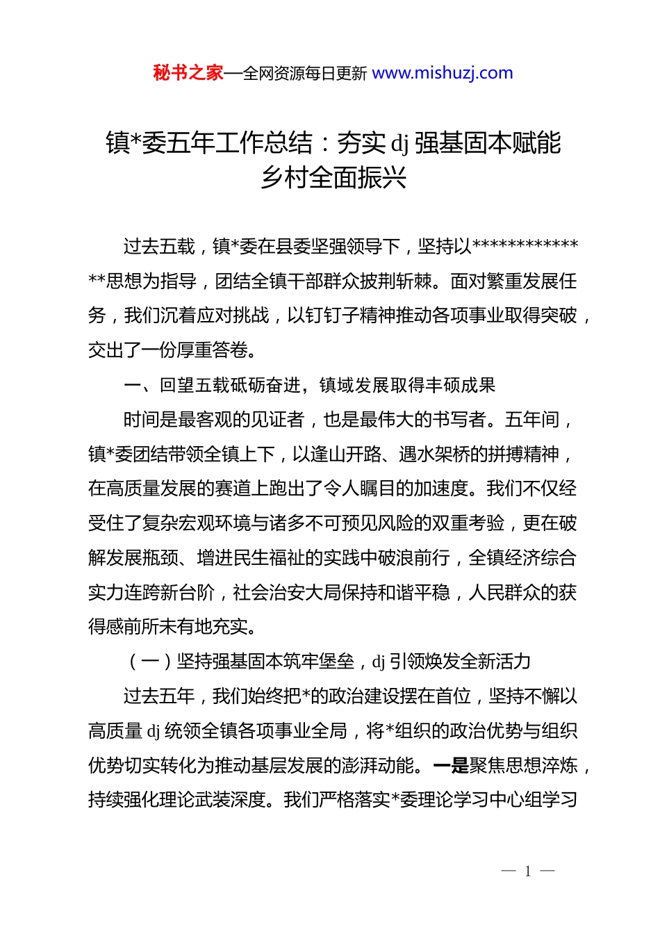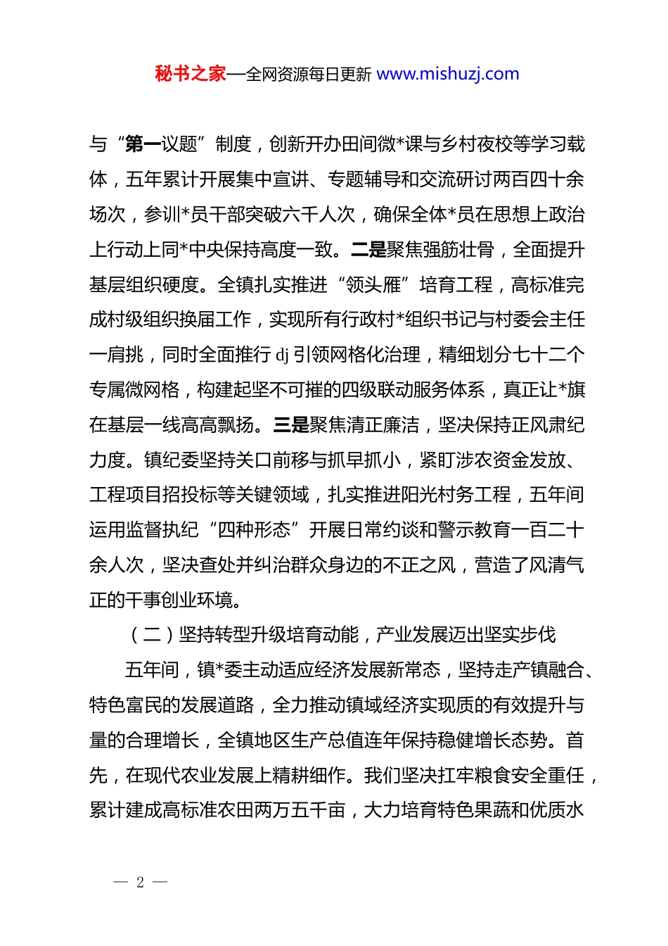 秘书之家—全网资源每日更新 www.mishuzj.com镇*委五年工作总结:夯实 dj 强基固本赋能乡村全面振兴过去五载,镇*委在县委坚强领导下,坚持以**************思想为指导,团结全镇干部群众披荆斩棘。面对繁重发展任务,我们沉着应对挑战,以钉钉子精神推动各项事业取得突破,交出了一份厚重答卷。一、回望五载砥砺奋进,镇域发展取得丰硕成果时间是最客观的见证者,也是最伟大的书写者。五年间,镇*委团结带领全镇上下,以逢山开路、遇水架桥的拼搏精神,在高质量发展的赛道上跑出了令人瞩目的加速度。我们不仅经受住了复杂宏观环境与诸多不可预见风险的双重考验,更在破解发展瓶颈、增进民生福祉的实践中破浪前行,全镇经济综合实力连跨新台阶,社会治安大局保持和谐平稳,人民群众的获得感前所未有地充实。(一)坚持强基固本筑牢堡垒,dj 引领焕发全新活力过去五年,我们始终把*的政治建设摆在首位,坚持不懈以高质量 dj 统领全镇各项事业全局,将*组织的政治优势与组织优势切实转化为推动基层发展的澎湃动能。一是聚焦思想淬炼,持续强化理论武装深度。我们严格落实*委理论学习中心组学习— 1 —秘书之家—全网资源每日更新 www.mishuzj.com与“第一议题”制度,创新开办田间微*课与乡村夜校等学习载体,五年累计开展集中宣讲、专题辅导和交流研讨两百四十余场次,参训*员干部突破六千人次,确保全体*员在思想上政治上行动上同*中央保持高度一致。二是聚焦强筋壮骨,全面提升基层组织硬度。全镇扎实推进“领头雁”培育工程,高标准完成村级组织换届工作,实现所有行政村*组织书记与村委会主任一肩挑,同时全面推行 dj 引领网格化治理,精细划分七十二个专属微网格,构建起坚不可摧的四级联动服务体系,真正让*旗在基层一线高高飘扬。三是聚焦清正廉洁,坚决保持正风肃纪力度。镇纪委坚持关口前移与抓早抓小,紧盯涉农资金发放、工程项目招投标等关键领域,扎实推进阳光村务工程,五年间运用监督执纪“四种形态”开展日常约谈和警示教育一百二十余人次,坚决查处并纠治群众身边的不正之风,营造了风清气正的干事创业环境。(二)坚持转型升级培育动能,产业发展迈出坚实步伐五年间,镇*委主动适应经济发展新常态,坚持走产镇融合、特色富民的发展道路,全力推动镇域经济实现质的有效提升与量的合理增长,全镇地区生产总值连年保持稳健增长态势。首先,在现代农业发展上精耕细作。我们坚决扛牢粮食安全重任,累计建成高标准农田两万五千亩,大力培育特色果蔬和优质水— 2 —秘书之家—全网资源每日更新 www.mishuzj.com产养殖两大主导产业,成功引进了五家市级农业产业化龙头企业,带动周边两千余户农户实现户均年增收一万五千元,农业产业现代化水平得到实质性飞跃。其次,在工业招商引资上蓄势突破。全镇盘活闲置工业用地四百余亩,围绕农产品深加工与新型建材等核心领域,累计签约落地千万元以上实体项目十五个,吸引固定资产投资超过八亿元,镇域规模以上工业总产值年均增长率达到百分之八点五,为地方财政和群众就业注入了强劲活力的源头活水。最后,在新兴业态培育上多点开花。我们依托本地独特的自然风光和历史文化资源,大力发展乡村生态游与采摘体验游,同步建成镇级农村电商公共服务中心,打通了农产品上行的最初一公里,五年累计实现农产品网络销售额突破五千万元,真正让绿水青山变成了群众口袋里的金山银山。(三)坚持内外兼修提升品质,镇村面貌呈现宜人气象我们始终践行绿水青山就是金山银山的理念,以全域统筹的视野推进人居环境整治与基础设施建设,努力让全镇呈现出移步换景、生机勃勃的崭新画卷,使得全镇的人居环境质量发生了根本性转变。一是高标准织密基础设施网络。五年累计投入财政资金一亿两千万元,不仅全面完成了五十公里乡村主干道的拓宽与黑化改造,还新建了三座高标准桥梁,实施了农村— 3 —秘书之家—全网资源每日更新 www.mishuzj.com饮水安全巩固提升工程,确保两万余名群众喝上了干净水与放心水,彻底打通了制约乡村发展的硬件设施瓶颈。二是出重拳打赢环境整治硬仗。全镇深入开展农村人居环境整治五年提升行动,全面推进“...
