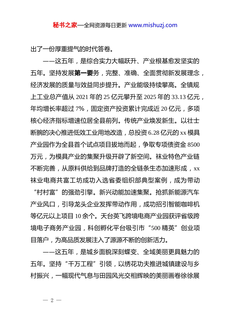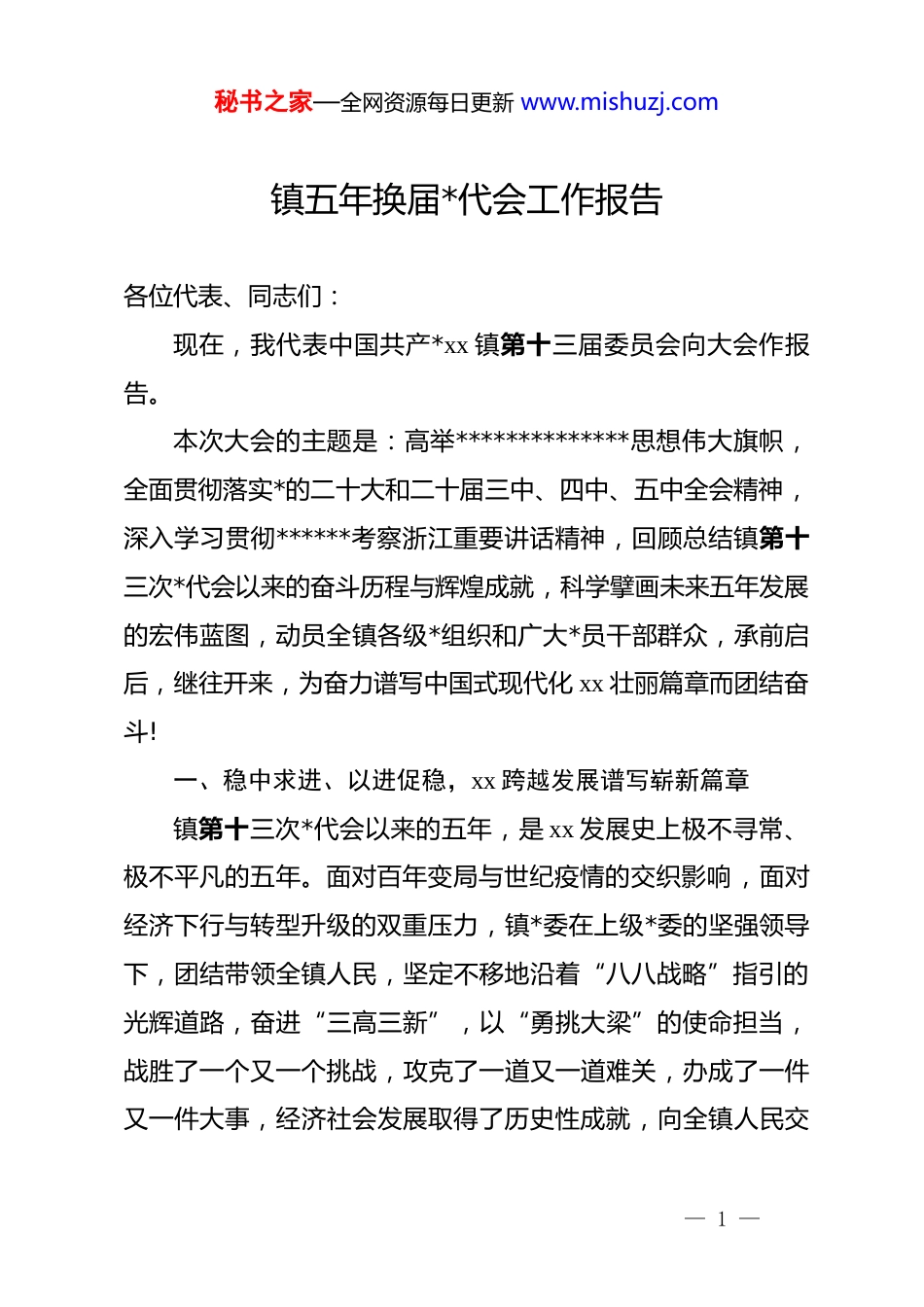 秘书之家—全网资源每日更新 www.mishuzj.com镇五年换届*代会工作报告各位代表、同志们:现在,我代表中国共产*xx 镇第十三届委员会向大会作报告。本次大会的主题是:高举**************思想伟大旗帜,全面贯彻落实*的二十大和二十届三中、四中、五中全会精神,深入学习贯彻******考察浙江重要讲话精神,回顾总结镇第十三次*代会以来的奋斗历程与辉煌成就,科学擘画未来五年发展的宏伟蓝图,动员全镇各级*组织和广大*员干部群众,承前启后,继往开来,为奋力谱写中国式现代化 xx 壮丽篇章而团结奋斗!一、稳中求进、以进促稳,xx 跨越发展谱写崭新篇章镇第十三次*代会以来的五年,是 xx 发展史上极不寻常、极不平凡的五年。面对百年变局与世纪疫情的交织影响,面对经济下行与转型升级的双重压力,镇*委在上级*委的坚强领导下,团结带领全镇人民,坚定不移地沿着“八八战略”指引的光辉道路,奋进“三高三新”,以“勇挑大梁”的使命担当,战胜了一个又一个挑战,攻克了一道又一道难关,办成了一件又一件大事,经济社会发展取得了历史性成就,向全镇人民交— 1 —秘书之家—全网资源每日更新 www.mishuzj.com出了一份厚重提气的时代答卷。——这五年,是综合实力大幅跃升、产业根基愈发坚实的五年。坚持发展第一要务,完整、准确、全面贯彻新发展理念,经济发展的质量与效益同步提升。产业能级持续攀高。全镇规上工业总产值从 2021 年的 25 亿元攀升至 2025 年的 33.13 亿元,年均增长率超过 7%,固定资产投资累计完成近 20 亿元,多项核心经济指标增速位居全县前列。传统产业焕发新生。以壮士断腕的决心推进低效工业用地改造,总投资 6.28 亿元的 xx 模具产业园作为全县首个试点项目拔地而起,争取专项债资金 8500万元,为模具产业的集聚升级开辟了新空间。袜业特色产业链不断完善,从原料供给到品牌打造的全链条生态加速形成,xx袜业电商共富工坊成功入选省委组织部典型案例,成为带动“村村富”的强劲引擎。新兴动能加速集聚。抢抓新能源汽车产业风口,引导龙头企业发挥带动作用,成功招引智能咖啡机等亿元以上项目 10 余个。天台英飞跨境电商产业园获评省级跨境电子商务产业园,科创孵化平台吸引市“500 精英”创业项目落户,为高品质发展注入了源源不断的创新活力。——这五年,是城乡面貌深刻蝶变、全域美丽更具魅力的五年。坚持“千万工程”引领,以绣花功夫推进城镇建设与乡村振兴,一幅现代气息与田园风光交相辉映的美丽画卷徐徐展— 2 —秘书之家—全网资源每日更新 www.mishuzj.com开。城镇品质迭代升级。高质量完成现代化美丽城镇建设方案编制,科学优化空间布局。纵深推进“三改一拆”,累计处置违法建筑超 10 万平方米,卫片执法图斑整改完成率始终位居全县第一。二级供水管网改造全面铺开,基础设施承载力显著增强。乡村振兴硕果累累。累计推进 20 个村的美丽乡村建设与 15个村的和美乡村建设,xx 新村历史文化村落保护利用项目顺利竣工,保留了乡愁记忆。农业基础不断夯实,累计完成高标准农田建设超 5000 亩,撂荒耕地全面实现复耕复种。村级集体经济持续壮大,2025 年全镇村集体经济总收入达 2397.06 万元,所有行政村经营性收入均超过 30 万元,其中超百万元村达到 2个,共同富裕的基础更加牢固。生态底色愈发靓丽。成功入选省第三批低(零)碳乡镇试点,森林质量精准提升工程成效显著,松材线虫病防治取得阶段性胜利。“无废乡村”创建深入推进,秸秆禁烧实现“人技同防”,xx 的天更蓝、山更绿、水更清。——这五年,是民生福祉持续增进、幸福成色更加饱满的五年。始终坚持以人民为中心的发展思想,财政支出的绝大部分用于民生领域,用心用情用力解决群众急难愁盼问题。社会保障坚实有力。城乡居民最低生活保障政策全面落实,低保、特困等困难群体实现应保尽保、关爱全覆盖,累计发放各类保— 3 —秘书之家—全网资源每日更新 www.mishuzj.com障资金超 400 万元。“一老一小”服务体系日趋完善,独居老人“鹤发守护”智能监测模型守护生命安全,“春泥计划”实践点为青少年健康成长撑起一片蓝天。公共服务...