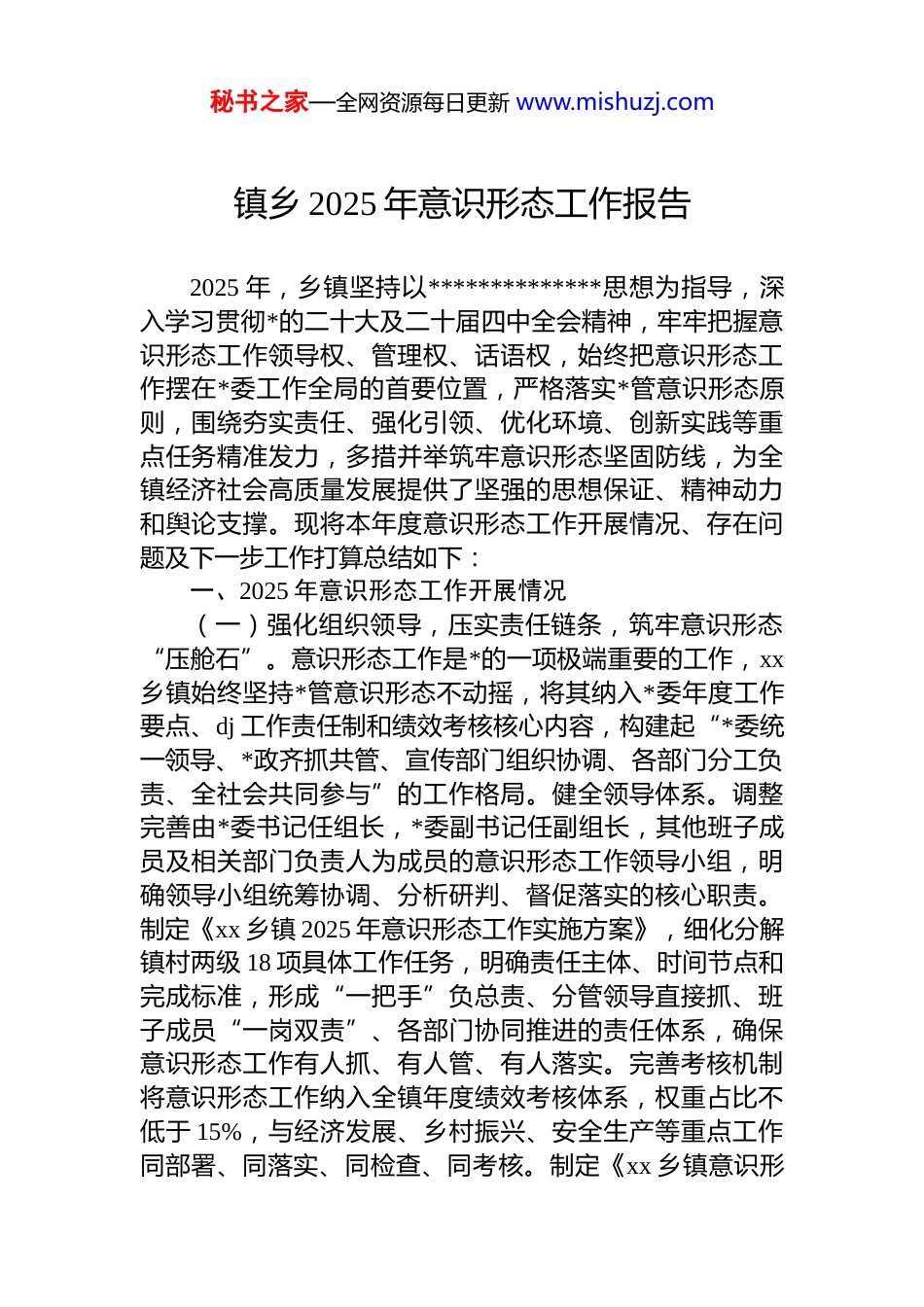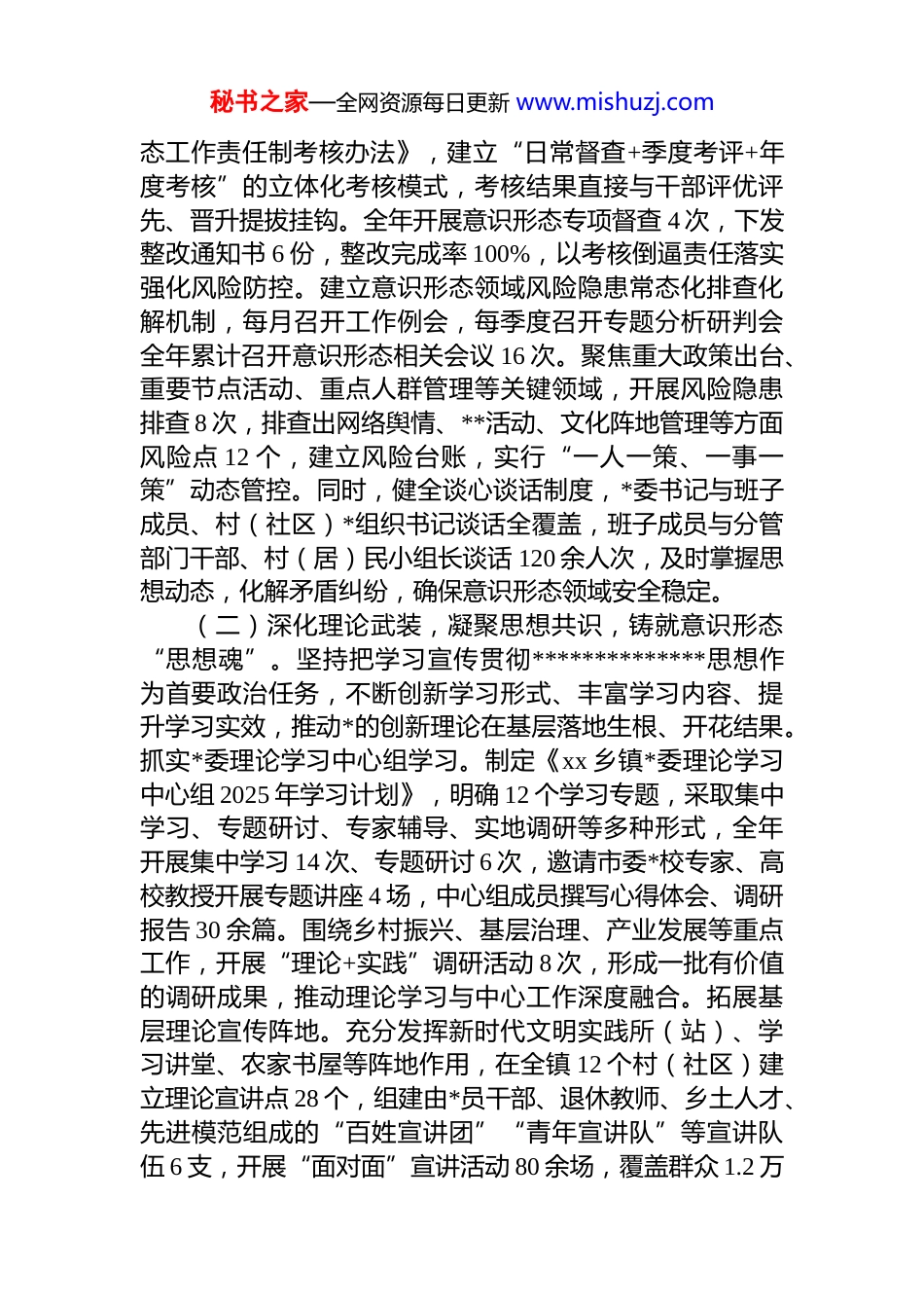 秘书之家—全网资源每日更新 www.mishuzj.com镇乡 2025 年意识形态工作报告2025 年,乡镇坚持以**************思想为指导,深入学习贯彻*的二十大及二十届四中全会精神,牢牢把握意识形态工作领导权、管理权、话语权,始终把意识形态工作摆在*委工作全局的首要位置,严格落实*管意识形态原则,围绕夯实责任、强化引领、优化环境、创新实践等重点任务精准发力,多措并举筑牢意识形态坚固防线,为全镇经济社会高质量发展提供了坚强的思想保证、精神动力和舆论支撑。现将本年度意识形态工作开展情况、存在问题及下一步工作打算总结如下:一、2025 年意识形态工作开展情况(一)强化组织领导,压实责任链条,筑牢意识形态“压舱石”。意识形态工作是*的一项极端重要的工作,xx乡镇始终坚持*管意识形态不动摇,将其纳入*委年度工作要点、dj 工作责任制和绩效考核核心内容,构建起“*委统一领导、*政齐抓共管、宣传部门组织协调、各部门分工负责、全社会共同参与”的工作格局。健全领导体系。调整完善由*委书记任组长,*委副书记任副组长,其他班子成员及相关部门负责人为成员的意识形态工作领导小组,明确领导小组统筹协调、分析研判、督促落实的核心职责。制定《xx 乡镇 2025 年意识形态工作实施方案》,细化分解镇村两级 18 项具体工作任务,明确责任主体、时间节点和完成标准,形成“一把手”负总责、分管领导直接抓、班子成员“一岗双责”、各部门协同推进的责任体系,确保意识形态工作有人抓、有人管、有人落实。完善考核机制将意识形态工作纳入全镇年度绩效考核体系,权重占比不低于 15%,与经济发展、乡村振兴、安全生产等重点工作同部署、同落实、同检查、同考核。制定《xx 乡镇意识形秘书之家—全网资源每日更新 www.mishuzj.com态工作责任制考核办法》,建立“日常督查+季度考评+年度考核”的立体化考核模式,考核结果直接与干部评优评先、晋升提拔挂钩。全年开展意识形态专项督查 4 次,下发整改通知书 6 份,整改完成率 100%,以考核倒逼责任落实强化风险防控。建立意识形态领域风险隐患常态化排查化解机制,每月召开工作例会,每季度召开专题分析研判会全年累计召开意识形态相关会议 16 次。聚焦重大政策出台、重要节点活动、重点人群管理等关键领域,开展风险隐患排查 8 次,排查出网络舆情、**活动、文化阵地管理等方面风险点 12 个,建立风险台账,实行“一人一策、一事一策”动态管控。同时,健全谈心谈话制度,*委书记与班子成员、村(社区)*组织书记谈话全覆盖,班子成员与分管部门干部、村(居)民小组长谈话 120 余人次,及时掌握思想动态,化解矛盾纠纷,确保意识形态领域安全稳定。(二)深化理论武装,凝聚思想共识,铸就意识形态“思想魂”。坚持把学习宣传贯彻**************思想作为首要政治任务,不断创新学习形式、丰富学习内容、提升学习实效,推动*的创新理论在基层落地生根、开花结果。抓实*委理论学习中心组学习。制定《xx 乡镇*委理论学习中心组 2025 年学习计划》,明确 12 个学习专题,采取集中学习、专题研讨、专家辅导、实地调研等多种形式,全年开展集中学习 14 次、专题研讨 6 次,邀请市委*校专家、高校教授开展专题讲座 4 场,中心组成员撰写心得体会、调研报告 30 余篇。围绕乡村振兴、基层治理、产业发展等重点工作,开展“理论+实践”调研活动 8 次,形成一批有价值的调研成果,推动理论学习与中心工作深度融合。拓展基层理论宣传阵地。充分发挥新时代文明实践所(站)、学习讲堂、农家书屋等阵地作用,在全镇 12 个村(社区)建立理论宣讲点 28 个,组建由*员干部、退休教师、乡土人才、先进模范组成的“百姓宣讲团”“青年宣讲队”等宣讲队伍 6 支,开展“面对面”宣讲活动 80 余场,覆盖群众 1.2 万秘书之家—全网资源每日更新 www.mishuzj.com余人次。创新宣讲形式,推出“理论+文艺”“理论+故事”“理论+案例”等宣讲模式,将*的创新理论、方针政策融入戏曲、快板、小品等群众喜闻乐见的文艺作品中,增强理论宣传的吸引力和感染力。丰富线上学习载体。依托微信公众号、视频...