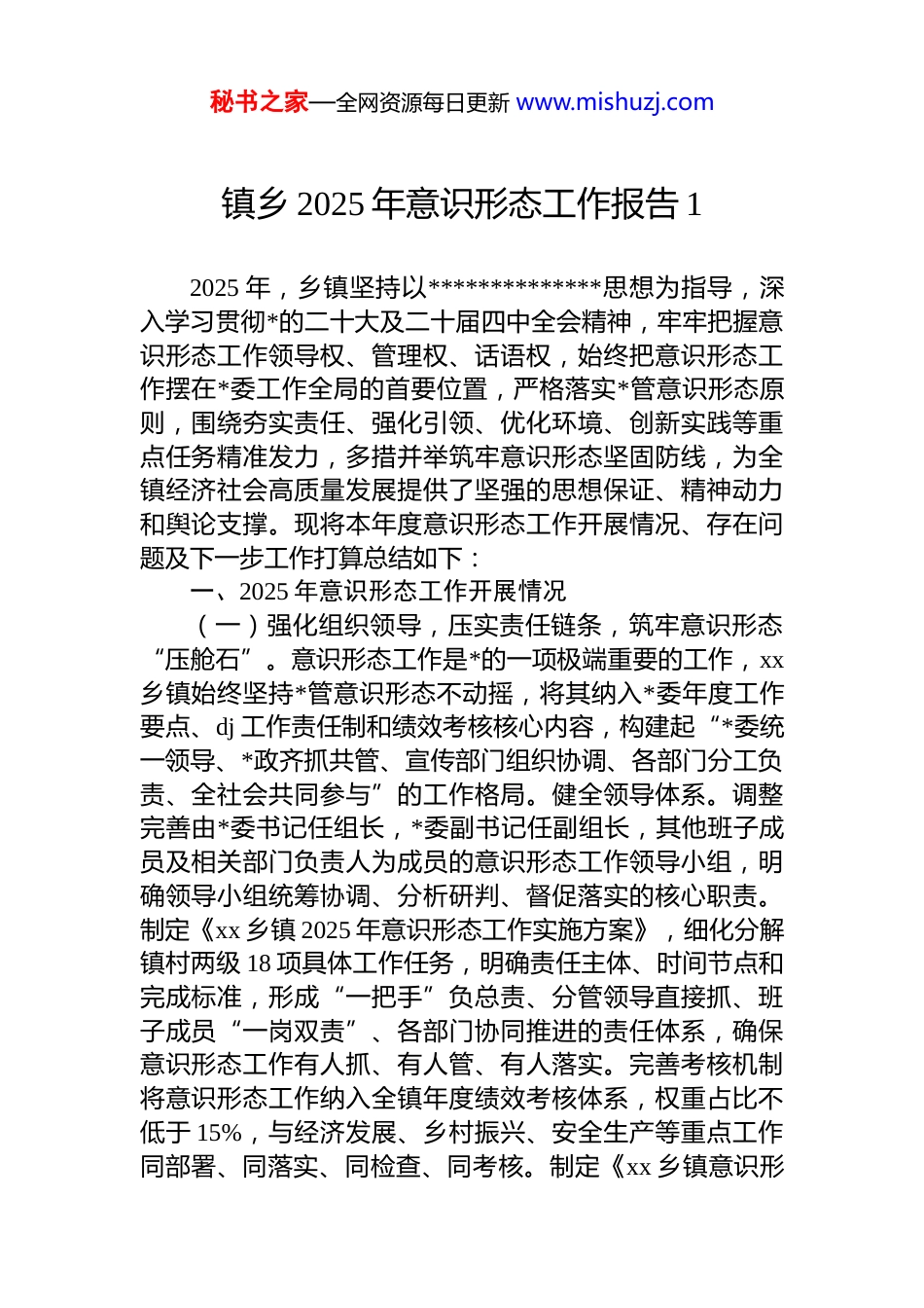 秘书之家—全网资源每日更新 www.mishuzj.com镇乡 2025 年意识形态工作报告 12025 年,乡镇坚持以**************思想为指导,深入学习贯彻*的二十大及二十届四中全会精神,牢牢把握意识形态工作领导权、管理权、话语权,始终把意识形态工作摆在*委工作全局的首要位置,严格落实*管意识形态原则,围绕夯实责任、强化引领、优化环境、创新实践等重点任务精准发力,多措并举筑牢意识形态坚固防线,为全镇经济社会高质量发展提供了坚强的思想保证、精神动力和舆论支撑。现将本年度意识形态工作开展情况、存在问题及下一步工作打算总结如下:一、2025 年意识形态工作开展情况(一)强化组织领导,压实责任链条,筑牢意识形态“压舱石”。意识形态工作是*的一项极端重要的工作,xx乡镇始终坚持*管意识形态不动摇,将其纳入*委年度工作要点、dj 工作责任制和绩效考核核心内容,构建起“*委统一领导、*政齐抓共管、宣传部门组织协调、各部门分工负责、全社会共同参与”的工作格局。健全领导体系。调整完善由*委书记任组长,*委副书记任副组长,其他班子成员及相关部门负责人为成员的意识形态工作领导小组,明确领导小组统筹协调、分析研判、督促落实的核心职责。制定《xx 乡镇 2025 年意识形态工作实施方案》,细化分解镇村两级 18 项具体工作任务,明确责任主体、时间节点和完成标准,形成“一把手”负总责、分管领导直接抓、班子成员“一岗双责”、各部门协同推进的责任体系,确保意识形态工作有人抓、有人管、有人落实。完善考核机制将意识形态工作纳入全镇年度绩效考核体系,权重占比不低于 15%,与经济发展、乡村振兴、安全生产等重点工作同部署、同落实、同检查、同考核。制定《xx 乡镇意识形秘书之家—全网资源每日更新 www.mishuzj.com态工作责任制考核办法》,建立“日常督查+季度考评+年度考核”的立体化考核模式,考核结果直接与干部评优评先、晋升提拔挂钩。全年开展意识形态专项督查 4 次,下发整改通知书 6 份,整改完成率 100%,以考核倒逼责任落实强化风险防控。建立意识形态领域风险隐患常态化排查化解机制,每月召开工作例会,每季度召开专题分析研判会全年累计召开意识形态相关会议 16 次。聚焦重大政策出台、重要节点活动、重点人群管理等关键领域,开展风险隐患排查 8 次,排查出网络舆情、**活动、文化阵地管理等方面风险点 12 个,建立风险台账,实行“一人一策、一事一策”动态管控。同时,健全谈心谈话制度,*委书记与班子成员、村(社区)*组织书记谈话全覆盖,班子成员与分管部门干部、村(居)民小组长谈话 120 余人次,及时掌握思想动态,化解矛盾纠纷,确保意识形态领域安全稳定。(二)深化理论武装,凝聚思想共识,铸就意识形态“思想魂”。坚持把学习宣传贯彻**************思想作为首要政治任务,不断创新学习形式、丰富学习内容、提升学习实效,推动*的创新理论在基层落地生根、开花结果。抓实*委理论学习中心组学习。制定《xx 乡镇*委理论学习中心组 2025 年学习计划》,明确 12 个学习专题,采取集中学习、专题研讨、专家辅导、实地调研等多种形式,全年开展集中学习 14 次、专题研讨 6 次,邀请市委*校专家、高校教授开展专题讲座 4 场,中心组成员撰写心得体会、调研报告 30 余篇。围绕乡村振兴、基层治理、产业发展等重点工作,开展“理论+实践”调研活动 8 次,形成一批有价值的调研成果,推动理论学习与中心工作深度融合。拓展基层理论宣传阵地。充分发挥新时代文明实践所(站)、学习讲堂、农家书屋等阵地作用,在全镇 12 个村(社区)建立理论宣讲点 28 个,组建由*员干部、退休教师、乡土人才、先进模范组成的“百姓宣讲团”“青年宣讲队”等宣讲队伍 6 支,开展“面对面”宣讲活动 80 余场,覆盖群众 1.2 万秘书之家—全网资源每日更新 www.mishuzj.com余人次。创新宣讲形式,推出“理论+文艺”“理论+故事”“理论+案例”等宣讲模式,将*的创新理论、方针政策融入戏曲、快板、小品等群众喜闻乐见的文艺作品中,增强理论宣传的吸引力和感染力。丰富线上学习载体。依托微信公众号、视...