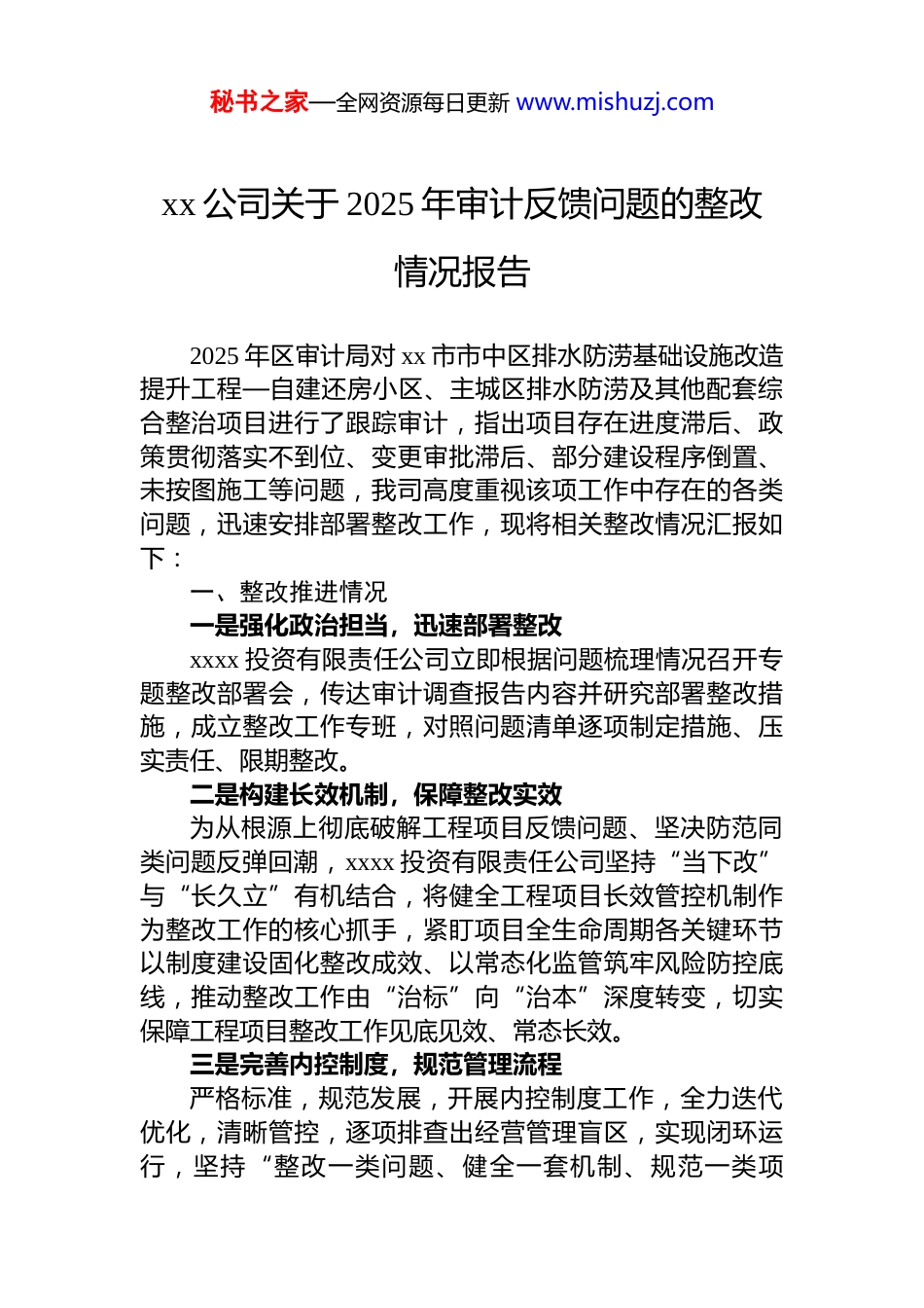 秘书之家—全网资源每日更新 www.mishuzj.comxx 公司关于 2025 年审计反馈问题的整改情况报告2025 年区审计局对 xx 市市中区排水防涝基础设施改造提升工程—自建还房小区、主城区排水防涝及其他配套综合整治项目进行了跟踪审计,指出项目存在进度滞后、政策贯彻落实不到位、变更审批滞后、部分建设程序倒置、未按图施工等问题,我司高度重视该项工作中存在的各类问题,迅速安排部署整改工作,现将相关整改情况汇报如下:一、整改推进情况一是强化政治担当,迅速部署整改xxxx 投资有限责任公司立即根据问题梳理情况召开专题整改部署会,传达审计调查报告内容并研究部署整改措施,成立整改工作专班,对照问题清单逐项制定措施、压实责任、限期整改。二是构建长效机制,保障整改实效为从根源上彻底破解工程项目反馈问题、坚决防范同类问题反弹回潮,xxxx 投资有限责任公司坚持“当下改”与“长久立”有机结合,将健全工程项目长效管控机制作为整改工作的核心抓手,紧盯项目全生命周期各关键环节以制度建设固化整改成效、以常态化监管筑牢风险防控底线,推动整改工作由“治标”向“治本”深度转变,切实保障工程项目整改工作见底见效、常态长效。三是完善内控制度,规范管理流程严格标准,规范发展,开展内控制度工作,全力迭代优化,清晰管控,逐项排查出经营管理盲区,实现闭环运行,坚持“整改一类问题、健全一套机制、规范一类项秘书之家—全网资源每日更新 www.mishuzj.com目”,对照工程建设行业规范及公司管理要求,系统性完善工程项目管控制度体系。一方面,优化升级现有项目管理制度,细化招投标管理、施工监理、签证变更、质量验收、安全管控等操作细则,明确权责边界、严控审批流程,补齐关键环节管控短板;另一方面,针对整改暴露的薄弱点,新建项目全过程跟踪、资料管理等专项制度,填补管理空白。截至目前,审计局反馈的“工程进度滞后,影响项目按期投用”等 10 个问题已全部整改到位,同步累计修订完善《工程建设项目资料管理办法》和《建设工程项目管理办法》两项制度,整改工作取得阶段性实效。二、下一步计划下一步,公司将进一步压实工作责任,定期对已完成整改的问题开展“回头看”,逐项核查整改质效,持续巩固整改成果,坚决杜绝问题反弹。公司将始终以严实的工作作风、务实的工作举措,把此次审计整改成效切实转化为推动工程项目高质量建设的强大动力,不断规范项目管理流程,全力筑牢公司合规经营、稳健发展的坚实根基。