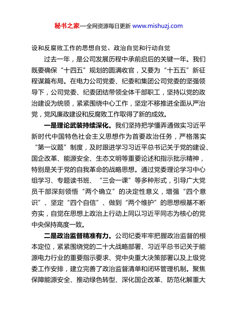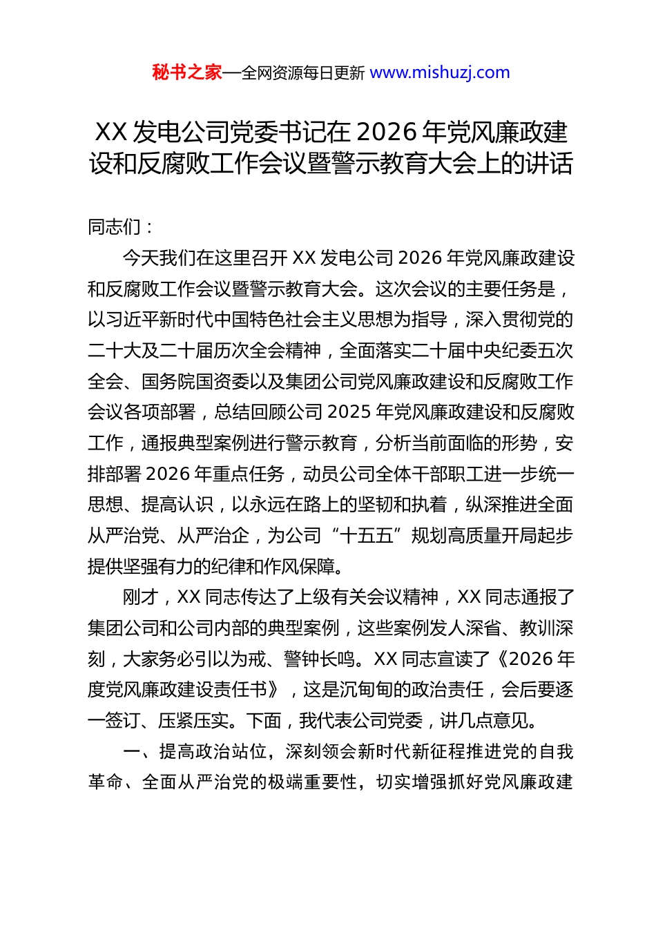 秘书之家—全网资源每日更新 www.mishuzj.comXX 发电公司党委书记在 2026 年党风廉政建设和反腐败工作会议暨警示教育大会上的讲话同志们:今天我们在这里召开 XX 发电公司 2026 年党风廉政建设和反腐败工作会议暨警示教育大会。这次会议的主要任务是,以习近平新时代中国特色社会主义思想为指导,深入贯彻党的二十大及二十届历次全会精神,全面落实二十届中央纪委五次全会、国务院国资委以及集团公司党风廉政建设和反腐败工作会议各项部署,总结回顾公司 2025 年党风廉政建设和反腐败工作,通报典型案例进行警示教育,分析当前面临的形势,安排部署 2026 年重点任务,动员公司全体干部职工进一步统一思想、提高认识,以永远在路上的坚韧和执着,纵深推进全面从严治党、从严治企,为公司“十五五”规划高质量开局起步提供坚强有力的纪律和作风保障。刚才,XX 同志传达了上级有关会议精神,XX 同志通报了集团公司和公司内部的典型案例,这些案例发人深省、教训深刻,大家务必引以为戒、警钟长鸣。XX 同志宣读了《2026 年度党风廉政建设责任书》,这是沉甸甸的政治责任,会后要逐一签订、压紧压实。下面,我代表公司党委,讲几点意见。一、提高政治站位,深刻领会新时代新征程推进党的自我革命、全面从严治党的极端重要性,切实增强抓好党风廉政建秘书之家—全网资源每日更新 www.mishuzj.com设和反腐败工作的思想自觉、政治自觉和行动自觉过去一年,是公司发展历程中承前启后的关键一年。我们既要确保“十四五”规划的圆满收官,又要为“十五五”新征程谋篇布局。在电力公司党委、纪委和集团公司党委的坚强领导下,公司党委、纪委团结带领全体干部职工,坚持以党的政治建设为统领,紧紧围绕中心工作,坚定不移推进全面从严治党,党风廉政建设和反腐败工作取得了新的成效。一是理论武装持续深化。我们坚持把学懂弄通做实习近平新时代中国特色社会主义思想作为首要政治任务,严格落实“第一议题”制度,及时跟进学习习近平总书记关于党的建设、国企改革、能源安全、生态文明等重要论述和指示批示精神,特别是关于党的自我革命的战略思想。通过党委理论学习中心组学习、专题读书班、“三会一课”等多种形式,引导广大党员干部深刻领悟“两个确立”的决定性意义,增强“四个意识”、坚定“四个自信”、做到“两个维护”的思想根基不断夯实,自觉在思想上政治上行动上同以习近平同志为核心的党中央保持高度一致。二是政治监督精准有力。公司纪委牢牢把握政治监督的根本定位,紧紧围绕党的二十大战略部署、习近平总书记关于能源电力行业的重要指示要求、党中央重大决策部署以及上级党委工作安排,建立完善了政治监督清单和闭环管理机制。聚焦保障能源安全、推动绿色转型、深化国企改革、防范化解重大秘书之家—全网资源每日更新 www.mishuzj.com风险等重点任务,开展跟进监督、精准监督,确保了党中央的政令畅通、令行禁止,有力推动了公司各项重大决策、重点工程、重要改革举措落地见效,为公司圆满完成年度生产经营目标、实现安全稳定运行提供了坚实的政治保障。三是监督体系不断完善。我们着力推动党委主体责任、纪委监督责任、党委书记第一责任人责任和班子成员“一岗双责”贯通联动、一体落实。制定了责任清单,细化了考核指标,定期开展检查督导和述责述廉,压力传导层层递进。在日常监督上持续发力,综合运用谈心谈话、检查抽查、列席会议、受理信访举报等多种方式,紧盯“关键少数”、关键岗位和权力运行的关键环节,推动监督下沉、监督落地。深化运用“四种形态”,特别是在用好第一种形态上下更大功夫,抓早抓小、防微杜渐,让红脸出汗成为常态。四是正风肃纪反腐深入推进。我们始终保持惩治腐败的高压态势,坚持无禁区、全覆盖、零容忍。严肃查处了个别违规违纪问题,形成了有力震慑。锲而不舍落实中央八项规定及其实施细则精神,对形式主义、官僚主义等“四风”顽瘴痼疾露头就打、反复敲打。大力开展廉洁文化建设,通过组织观看警示教育片、参观廉政教育基地、举办廉洁书画展、开展家庭助廉活动等形式,积极营造崇廉拒腐的良好氛围。坚持一体推进不敢腐、不...