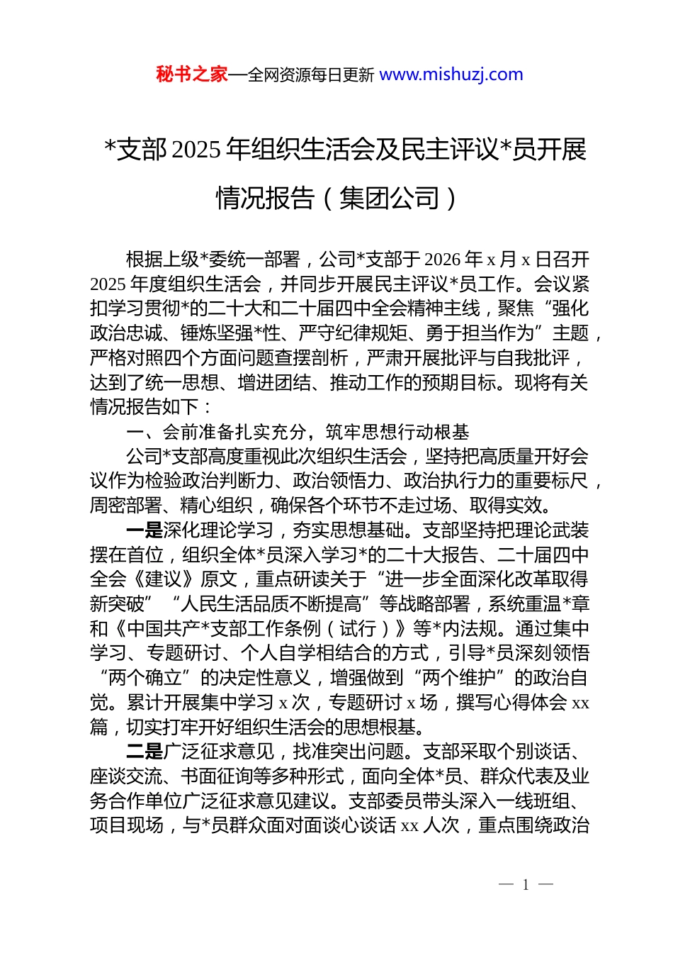 秘书之家—全网资源每日更新 www.mishuzj.com*支部 2025 年组织生活会及民主评议*员开展情况报告(集团公司)根据上级*委统一部署,公司*支部于 2026 年 x 月 x 日召开2025 年度组织生活会,并同步开展民主评议*员工作。会议紧扣学习贯彻*的二十大和二十届四中全会精神主线,聚焦“强化政治忠诚、锤炼坚强*性、严守纪律规矩、勇于担当作为”主题,严格对照四个方面问题查摆剖析,严肃开展批评与自我批评,达到了统一思想、增进团结、推动工作的预期目标。现将有关情况报告如下:一、会前准备扎实充分,筑牢思想行动根基公司*支部高度重视此次组织生活会,坚持把高质量开好会议作为检验政治判断力、政治领悟力、政治执行力的重要标尺,周密部署、精心组织,确保各个环节不走过场、取得实效。一是深化理论学习,夯实思想基础。支部坚持把理论武装摆在首位,组织全体*员深入学习*的二十大报告、二十届四中全会《建议》原文,重点研读关于“进一步全面深化改革取得新突破”“人民生活品质不断提高”等战略部署,系统重温*章和《中国共产*支部工作条例(试行)》等*内法规。通过集中学习、专题研讨、个人自学相结合的方式,引导*员深刻领悟“两个确立”的决定性意义,增强做到“两个维护”的政治自觉。累计开展集中学习 x 次,专题研讨 x 场,撰写心得体会 xx篇,切实打牢开好组织生活会的思想根基。二是广泛征求意见,找准突出问题。支部采取个别谈话、座谈交流、书面征询等多种形式,面向全体*员、群众代表及业务合作单位广泛征求意见建议。支部委员带头深入一线班组、项目现场,与*员群众面对面谈心谈话 xx 人次,重点围绕政治— 1 —秘书之家—全网资源每日更新 www.mishuzj.com忠诚、*性修养、纪律作风、担当作为等方面,诚恳听取真实声音。共征集到涉及理论学习深度、服务群众实效、攻坚克难韧劲等方面的原始意见建议 xx 条,经梳理归纳为 x 个方面 x 项具体问题,全部原汁原味反馈给支部班子及每名*员,为精准查摆问题提供靶向。三是深入谈心谈话,凝聚思想共识。严格落实“四必谈”要求,即支部书记与支委必谈、支委相互之间必谈、支委与*员必谈、*员之间广泛谈。谈话坚持问题导向,既交流思想、沟通工作,又指出不足、提出建议,特别注重对存在苗头性、倾向性问题的*员及时提醒帮助。通过坦诚相见、推心置腹的交流,进一步增进了了解、消除了隔阂、达成了共识,营造了开好组织生活会的良好氛围。四是认真撰写材料,深刻检视剖析。支部班子和全体*员紧扣会议主题,严格对照四个方面问题,紧密联系个人思想、学习和工作实际,逐条逐项进行对照检查。支部班子集体研究起草对照检查材料,深入查摆问题根源,明确整改方向;每名*员坚持把自己摆进去、把职责摆进去、把工作摆进去,认真撰写个人发言提纲。支部书记对所有材料逐一审核把关,确保问题找得准、根源挖得深、措施定得实。二、会议召开严肃认真,批评和自我批评动真碰硬2026 年 x 月 x 日,公司*支部组织生活会如期召开。会议由*支部书记 xxx 同志主持,应到*员 xx 名,实到 xx 名,请假 x 名(均履行了请假手续)。会议严格按照规定程序进行,气氛既严肃认真又团结和谐。一是支部班子带头,深刻查摆问题。*支部书记代表支部委员会作对照检查,聚焦四个方面,深入查摆了在强化理论武装系统性、发挥战斗堡垒作用、密切联系服务群众、激励*员担当作为等方面存在的突出问题。随后,支部委员逐一进行个人对照检查,主动认领责任,深刻剖析原因,明确整改措施。每位— 2 —秘书之家—全网资源每日更新 www.mishuzj.com同志发言后,其他委员本着对组织、对同志、对事业高度负责的态度,实事求是地提出批评意见,既有红脸出汗的紧张感,又有加油鼓劲的温暖感。二是*员全员参与,开展互评互鉴。在支部委员带头示范下,全体*员依次进行个人自评,大家开门见山、直奔主题,不回避矛盾、不遮掩问题。在互评环节,*员们坚持实事求是原则,出于公心、敢于直言,点真问题、真点问题。批评意见既有“理论学习碎片化,学用结合不够紧密”的共性提醒,也有“在 xx项目攻坚中存在畏难情绪”的具体...